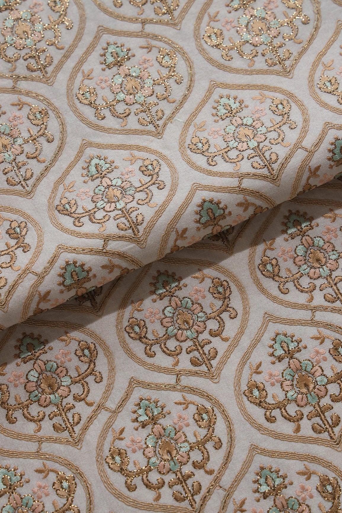 Multi Thread With Gold Zari Ogee Embroidery On Off White Raw Silk Fabric
