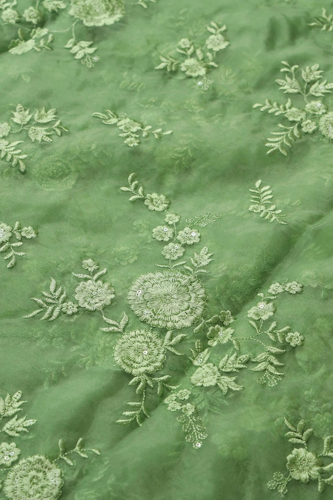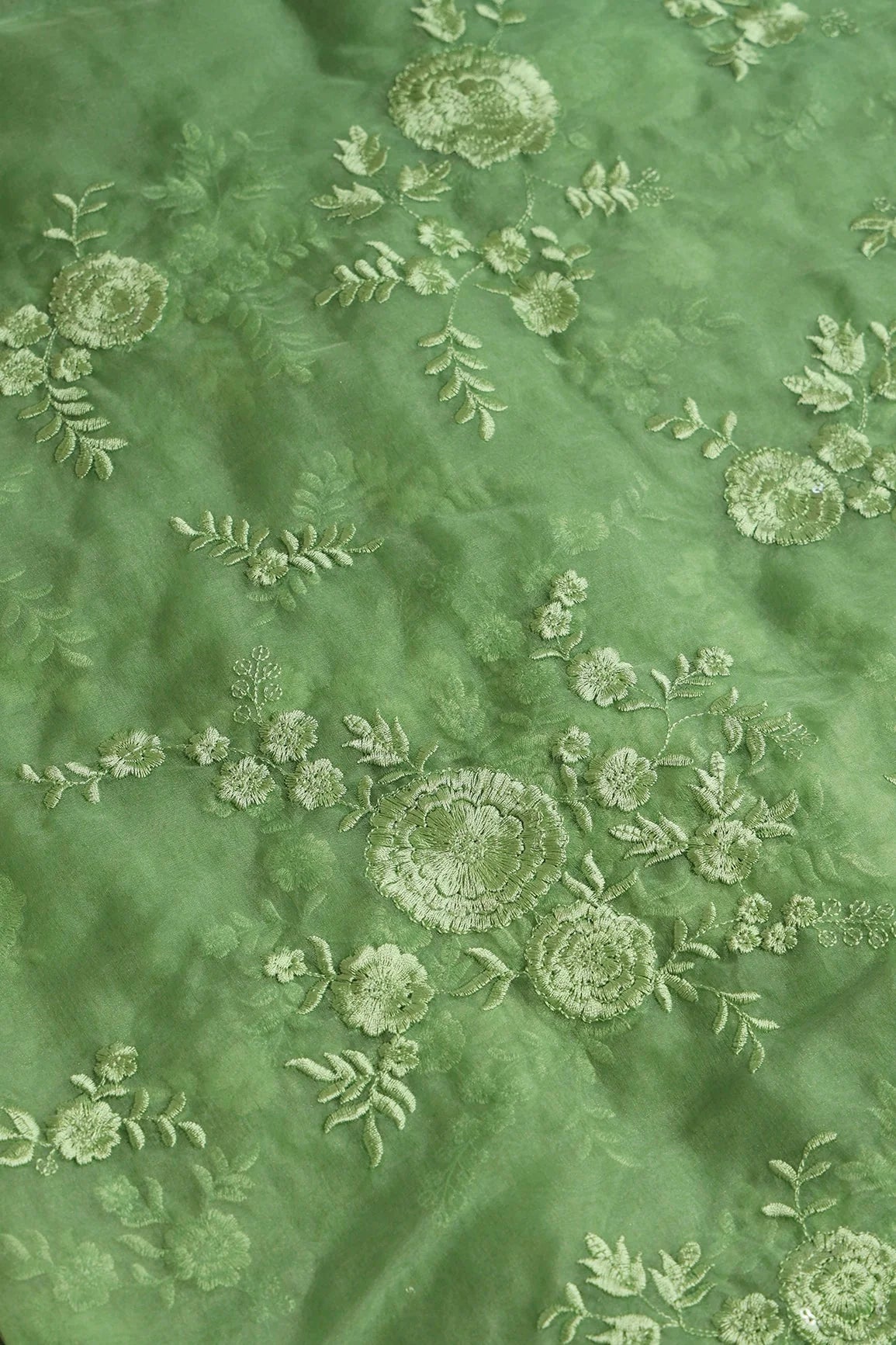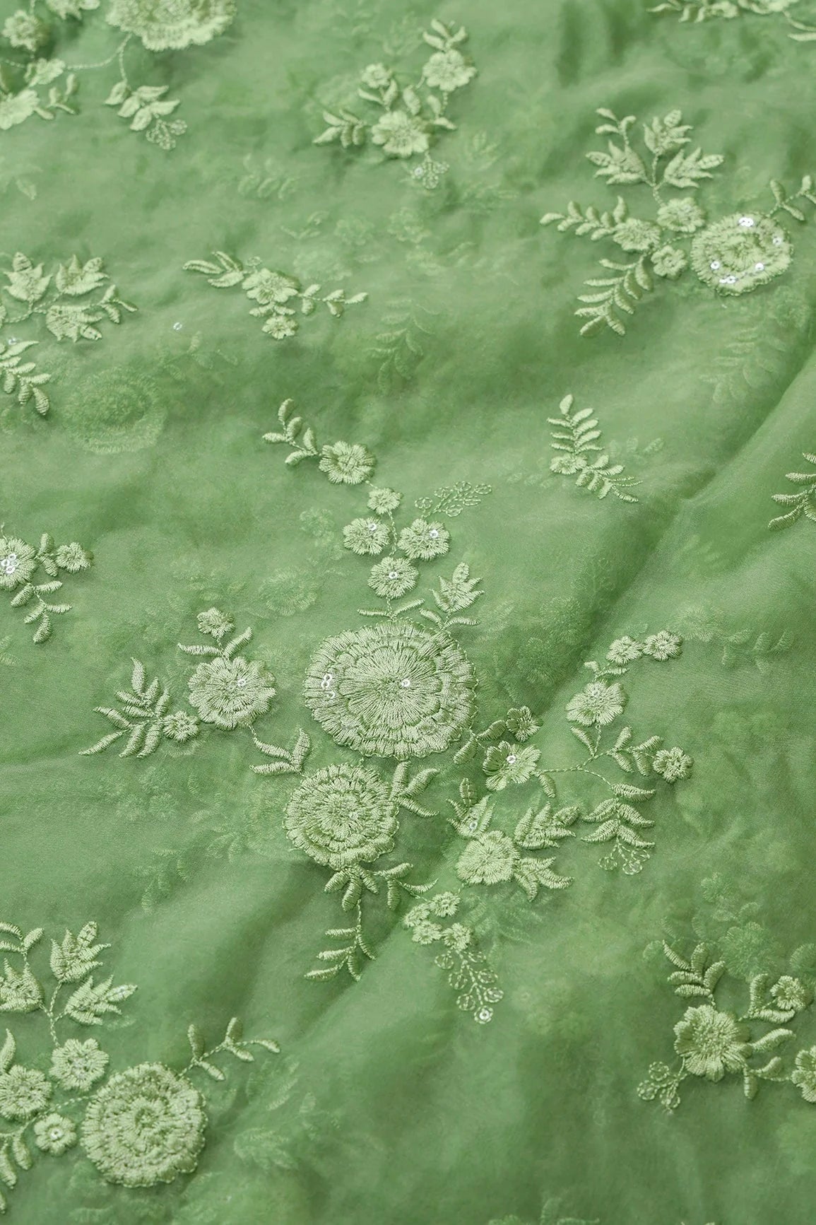 Olive Thread With Water Sequins Floral Embroidery Work On Olive Organza Fabric