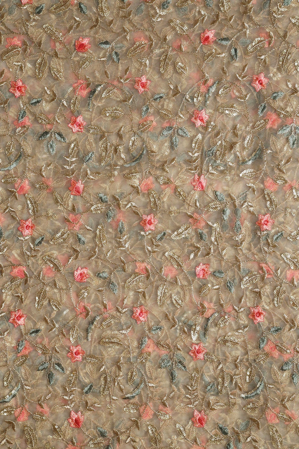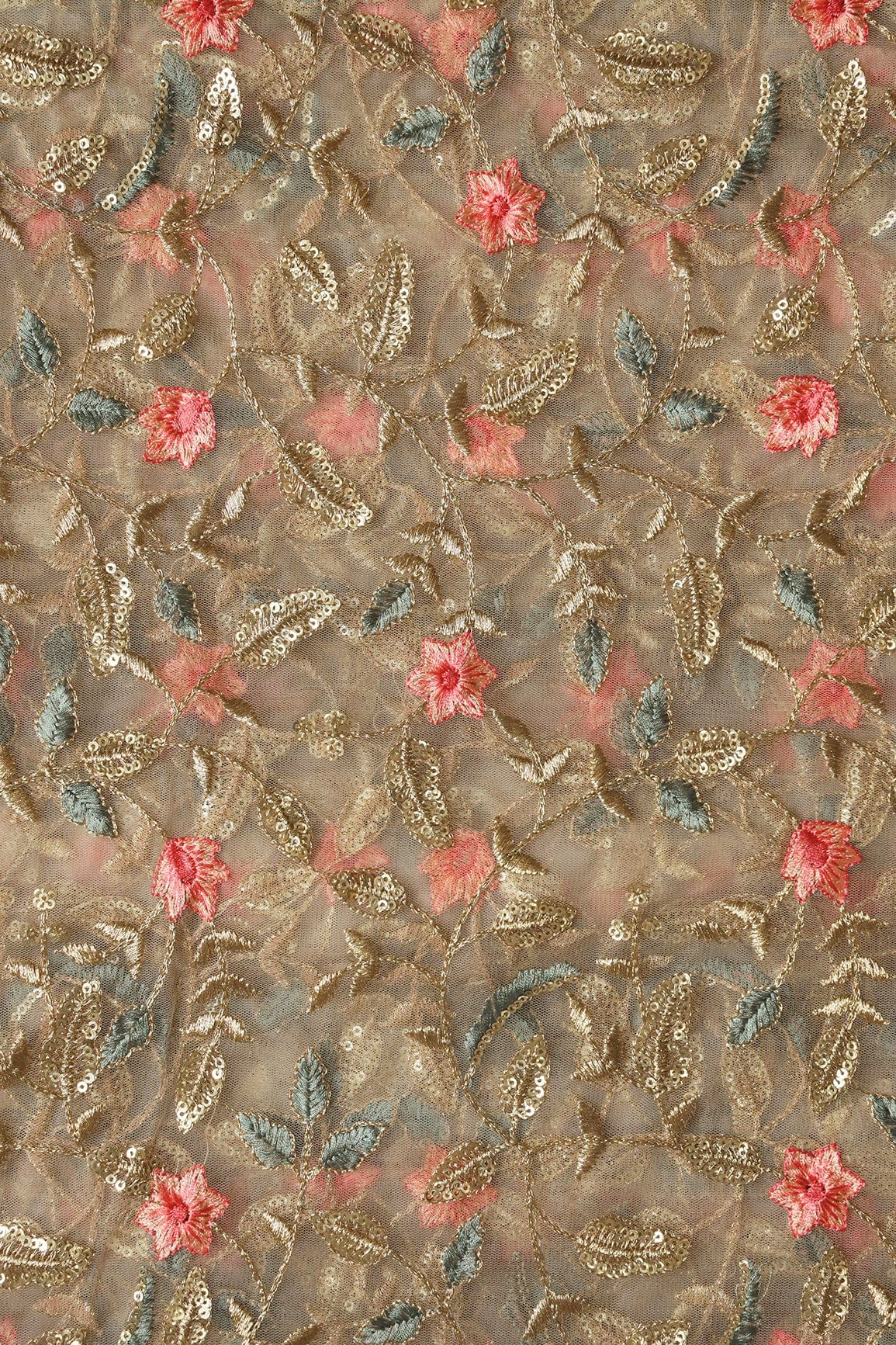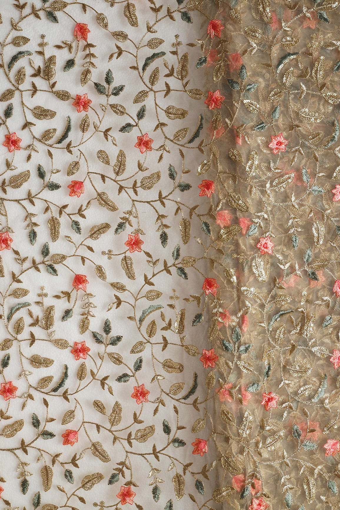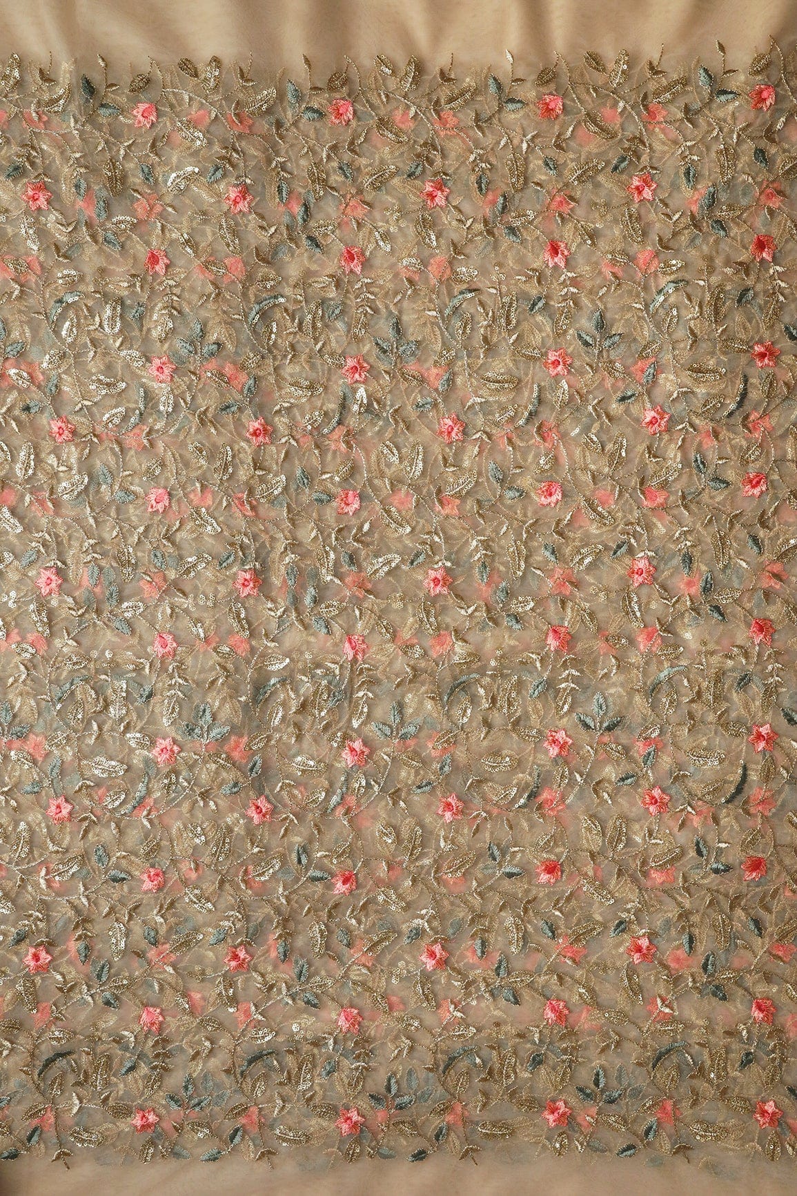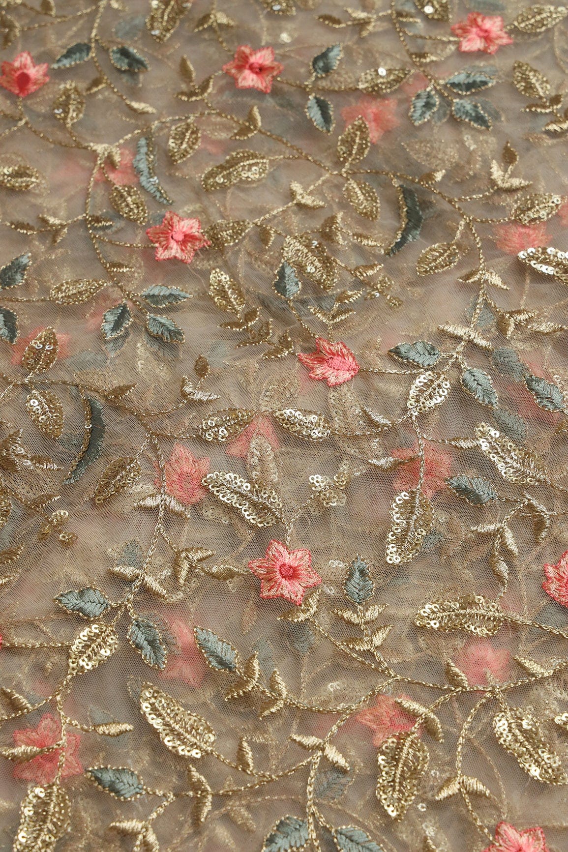 Peach And Beige Thread With Gold Sequins Floral Heavy Embroidery Work On Beige Soft Net Fabric