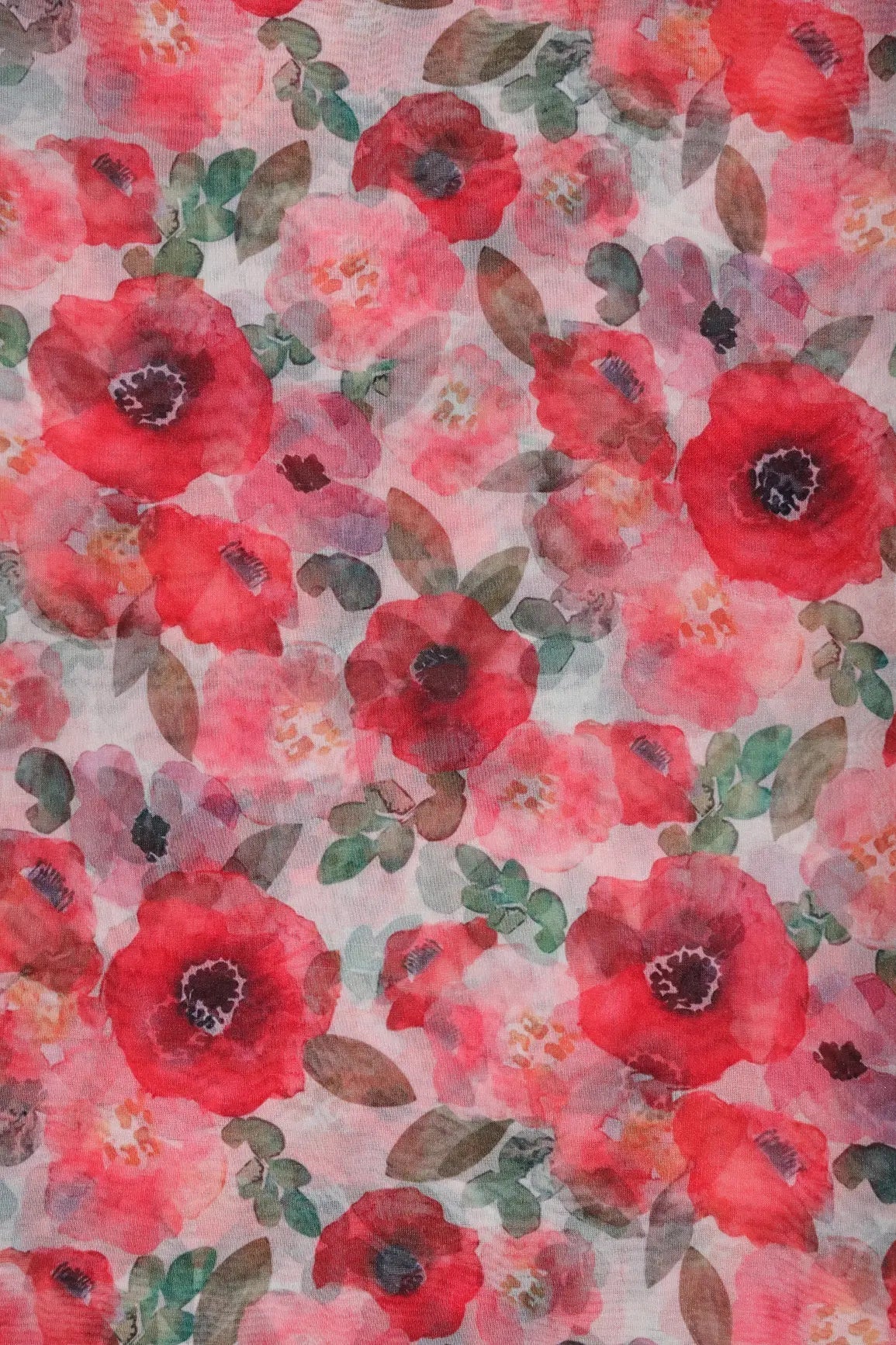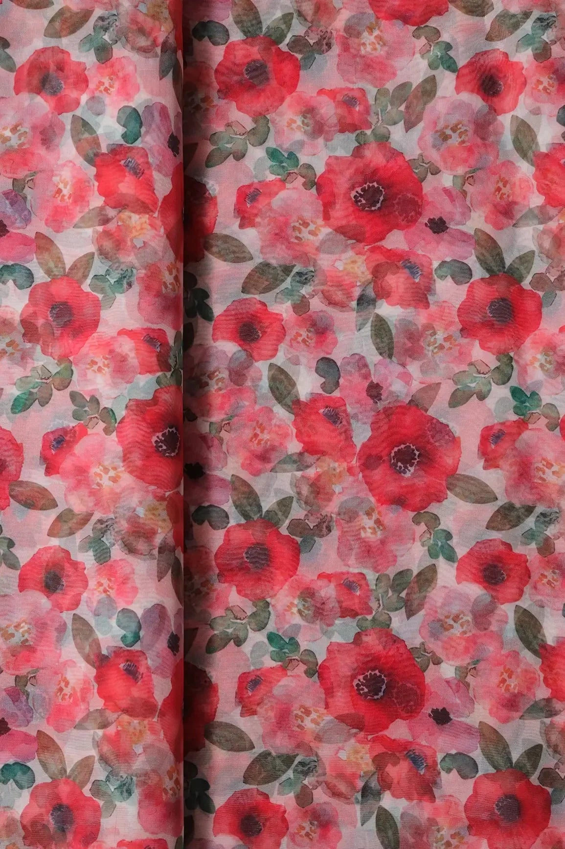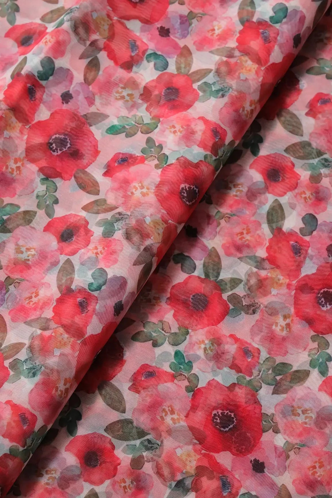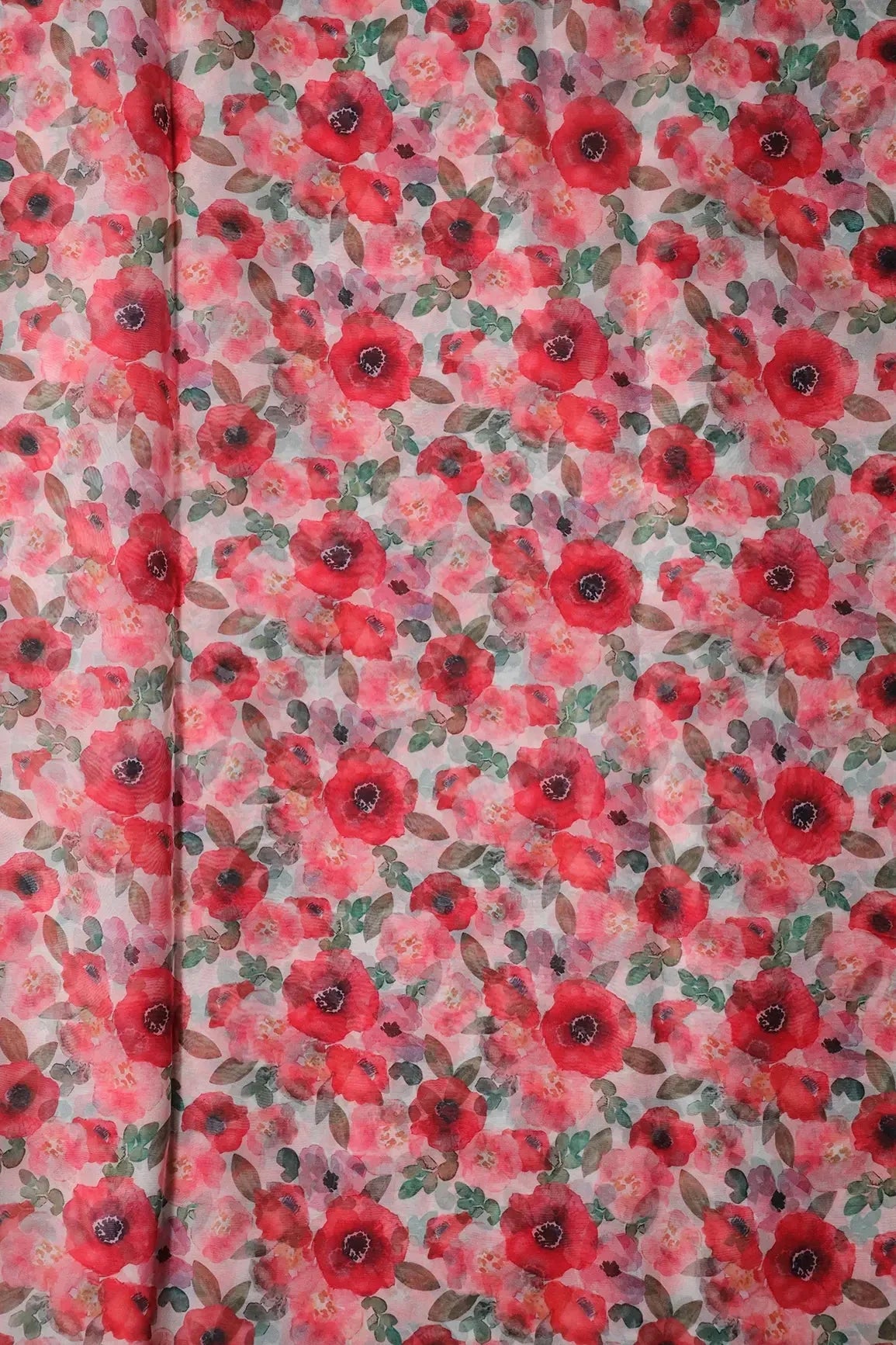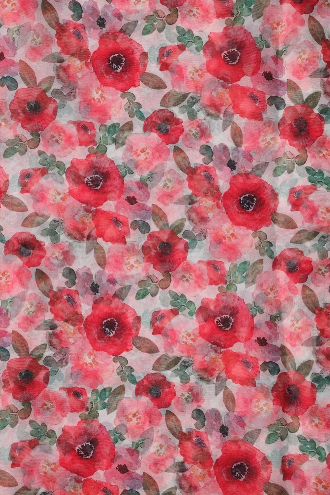 Red And Pink Floral Pattern Digital Print On White Organza Fabric