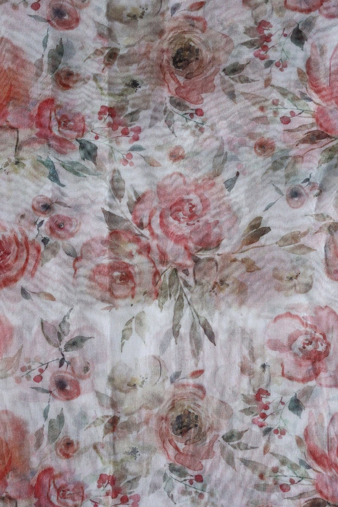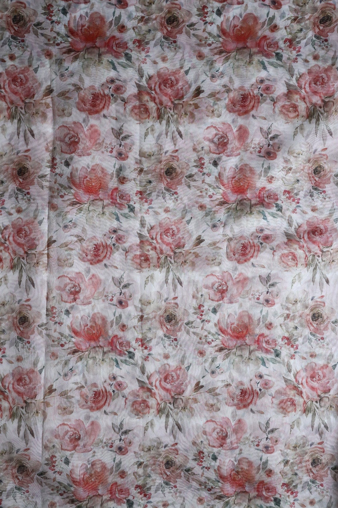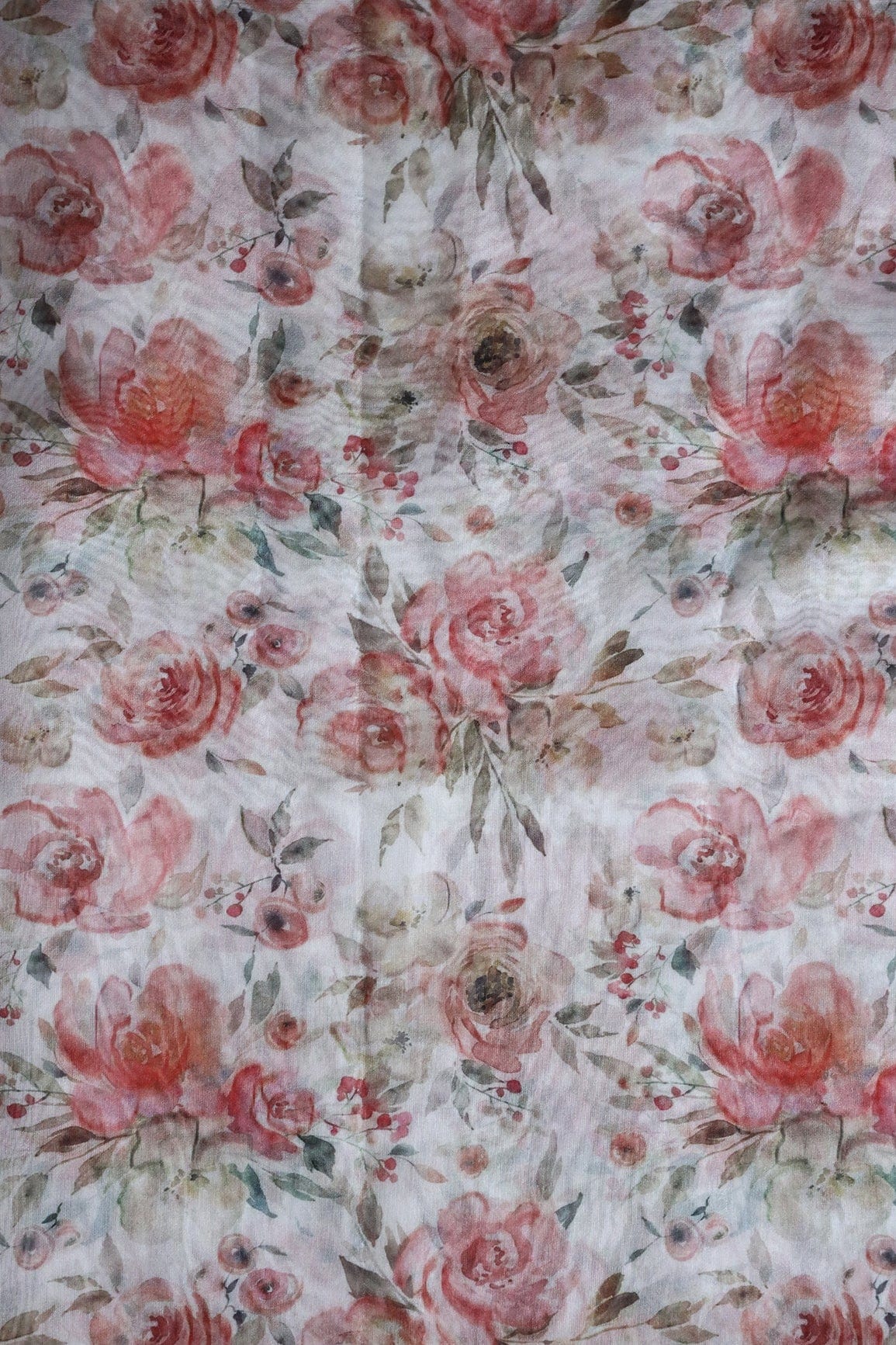 Red Beautiful Floral Digital Print On White Organza Fabric