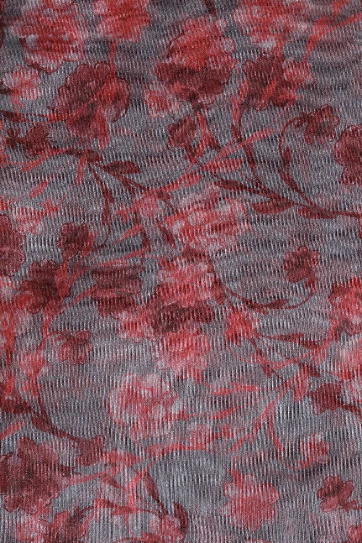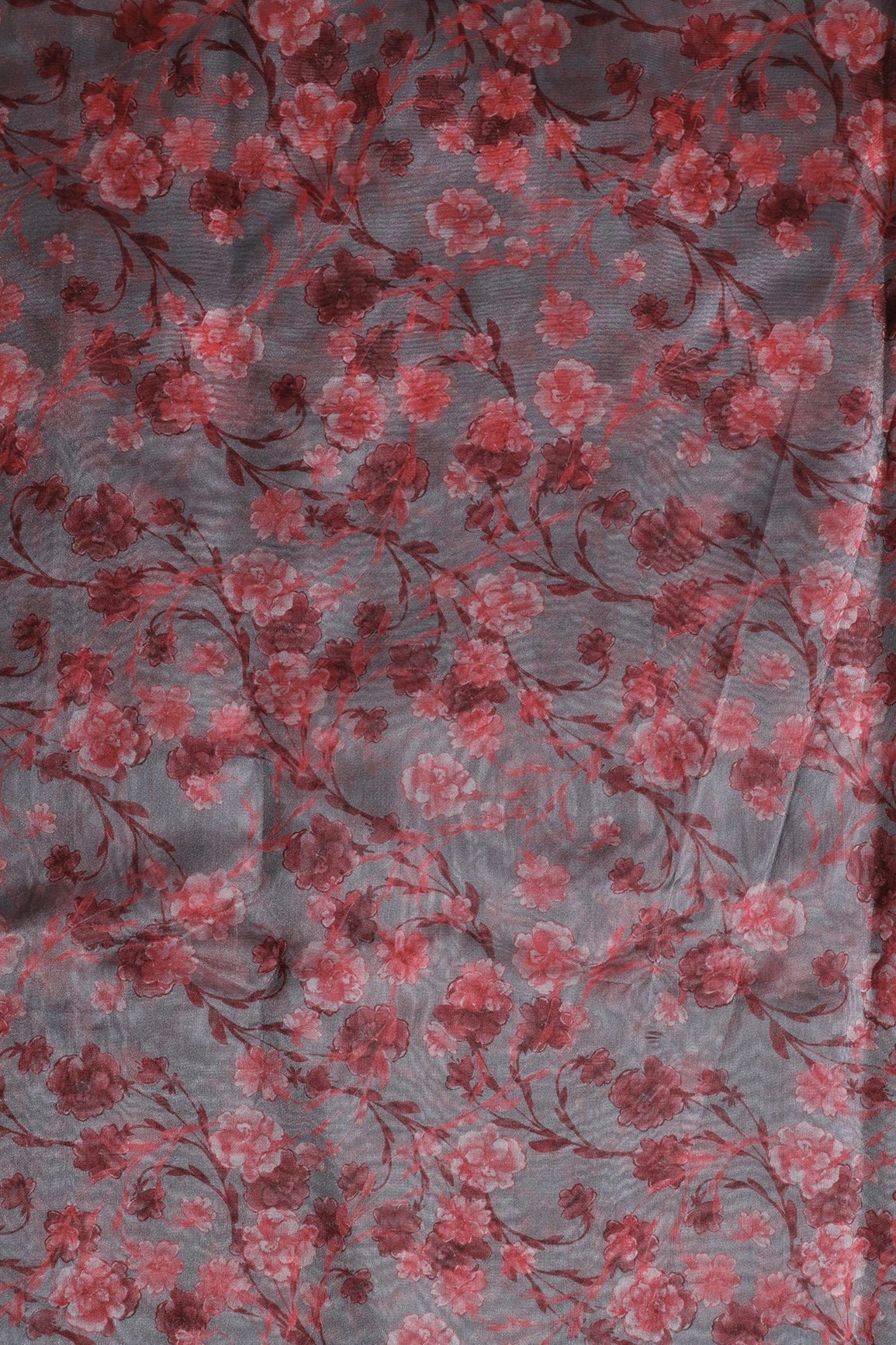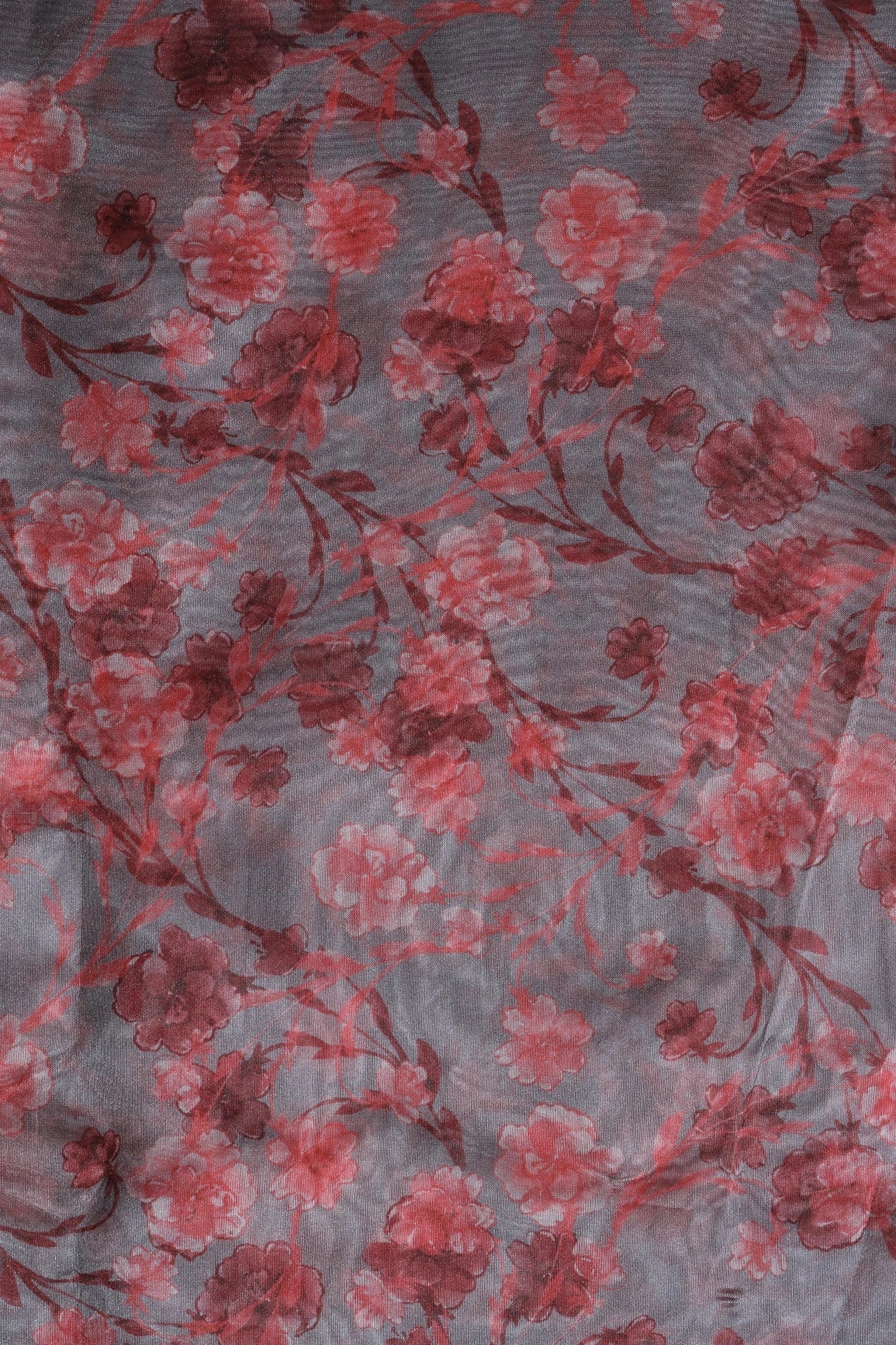 Red Floral Pattern Digital Print On Grey Organza Fabric