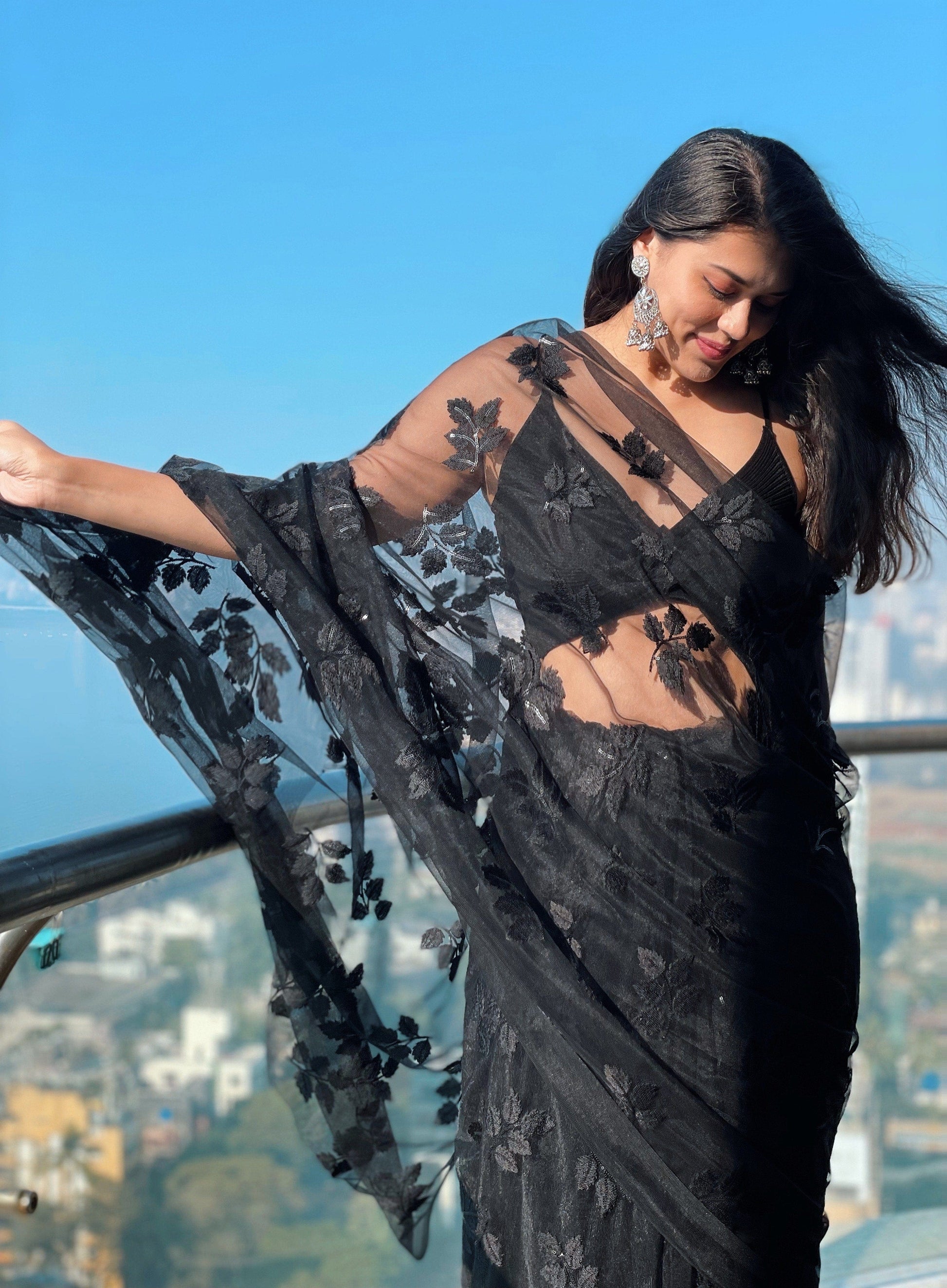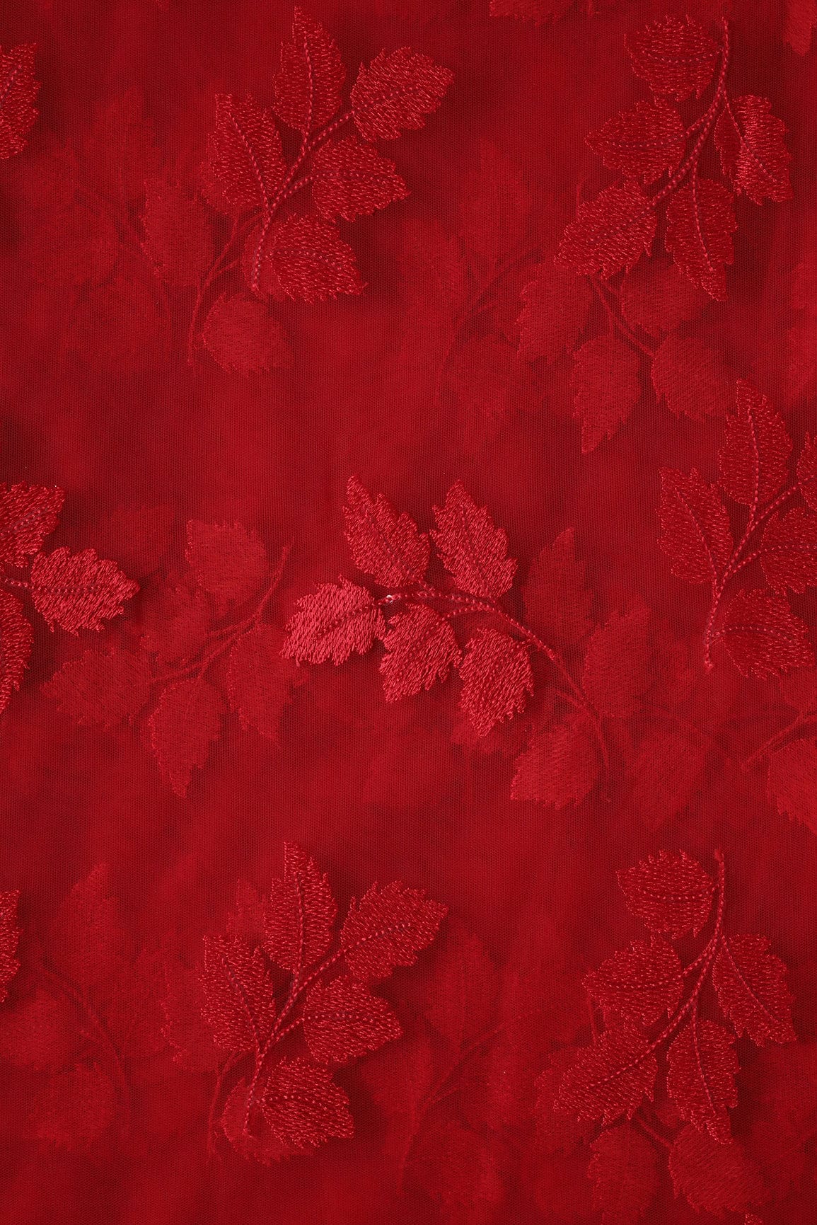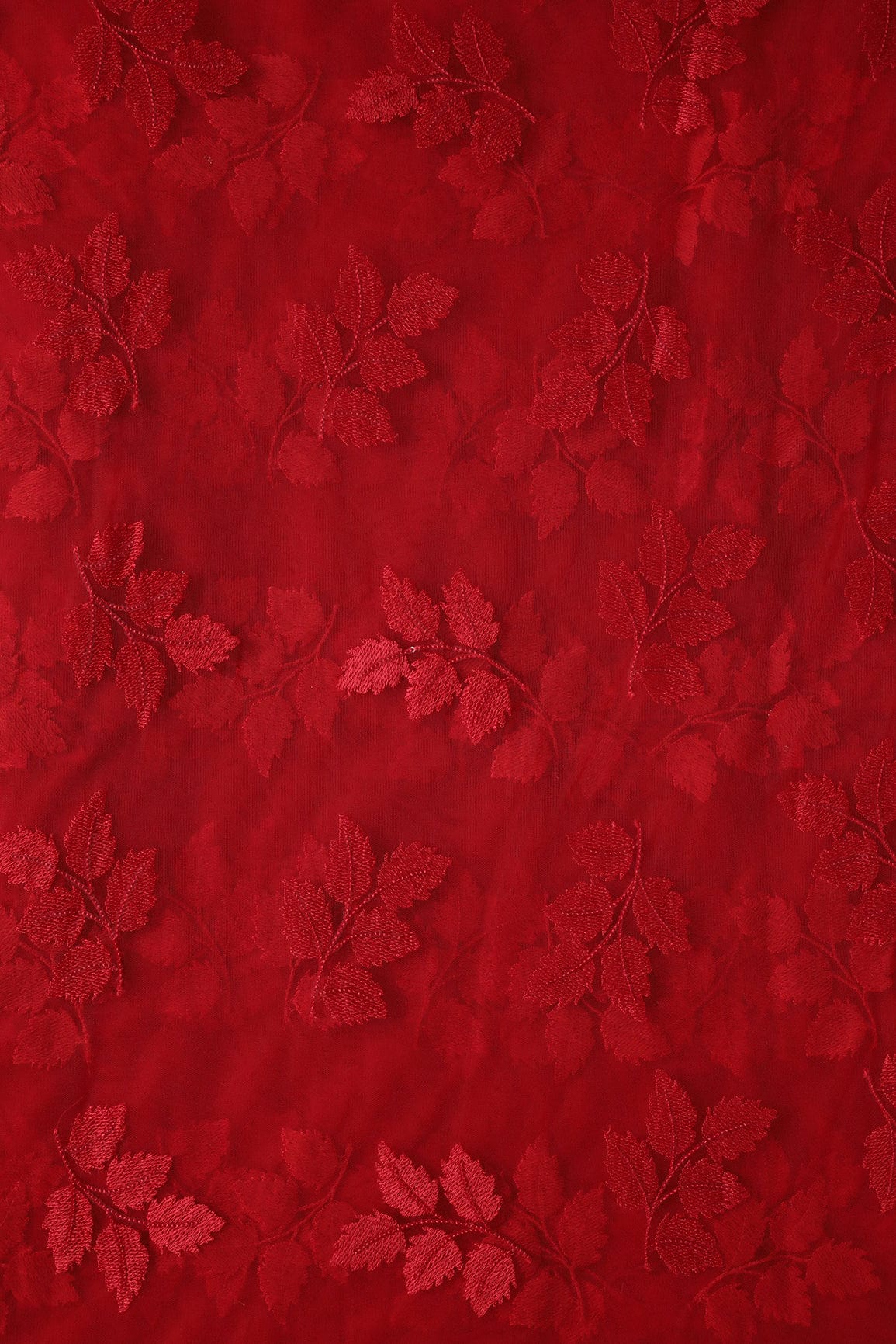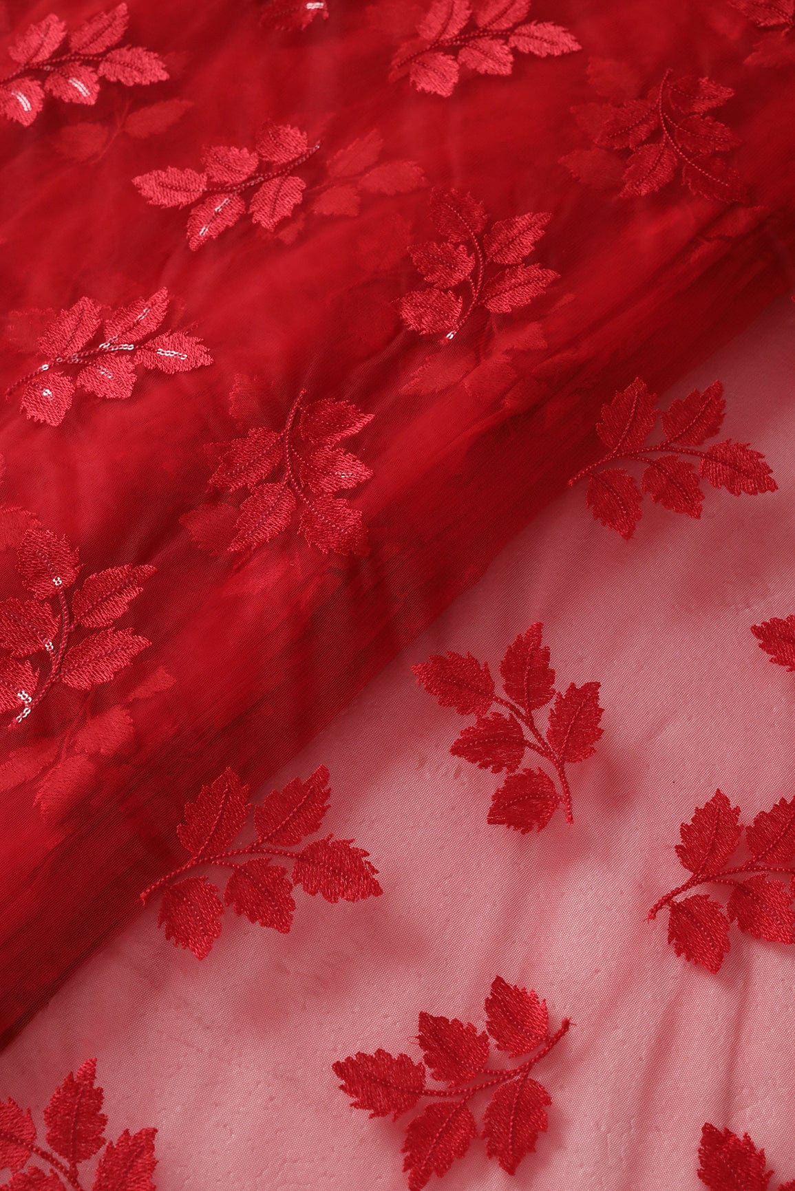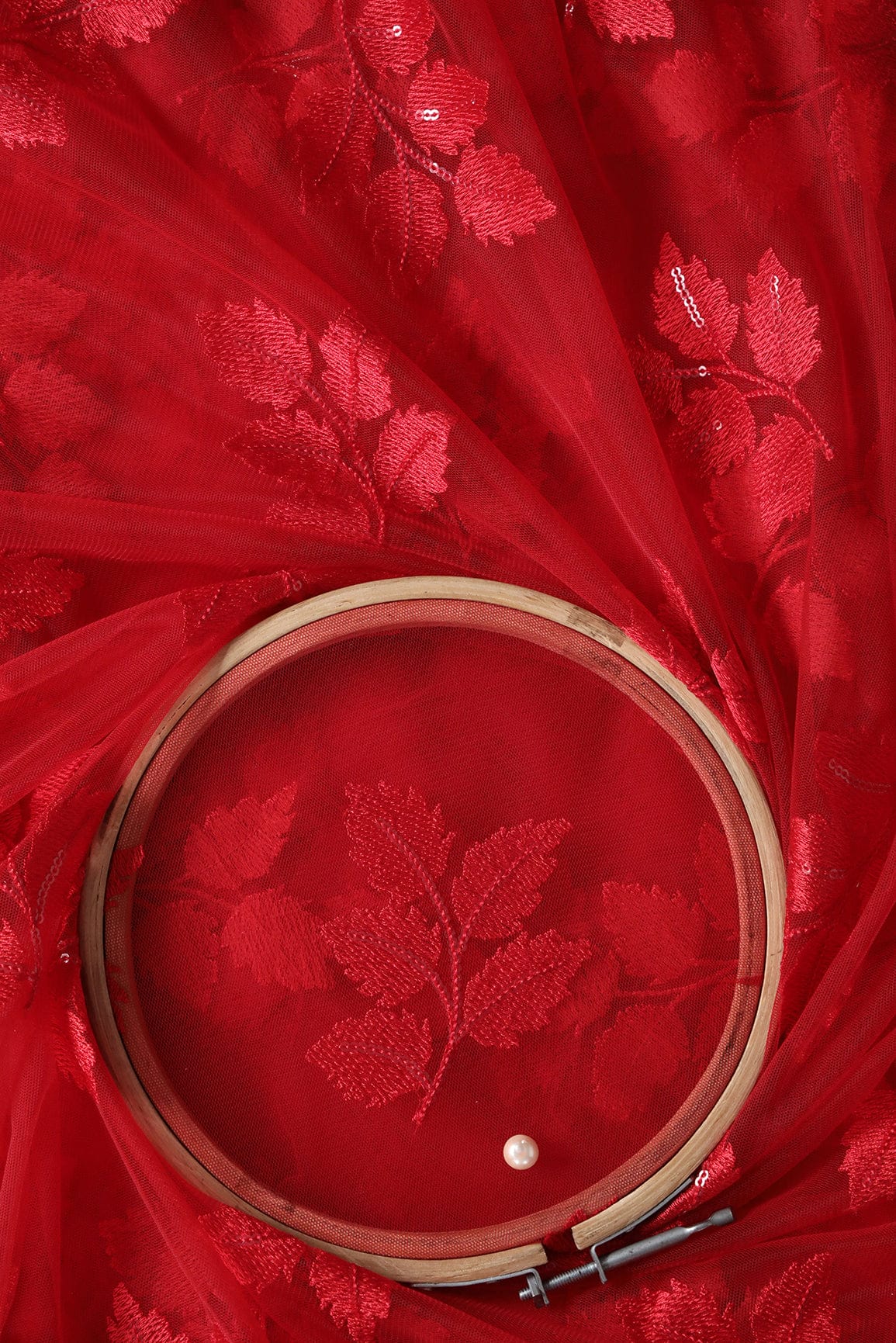 Red Thread With Sequins Leafy Embroidery Work On Red Soft Net Fabric