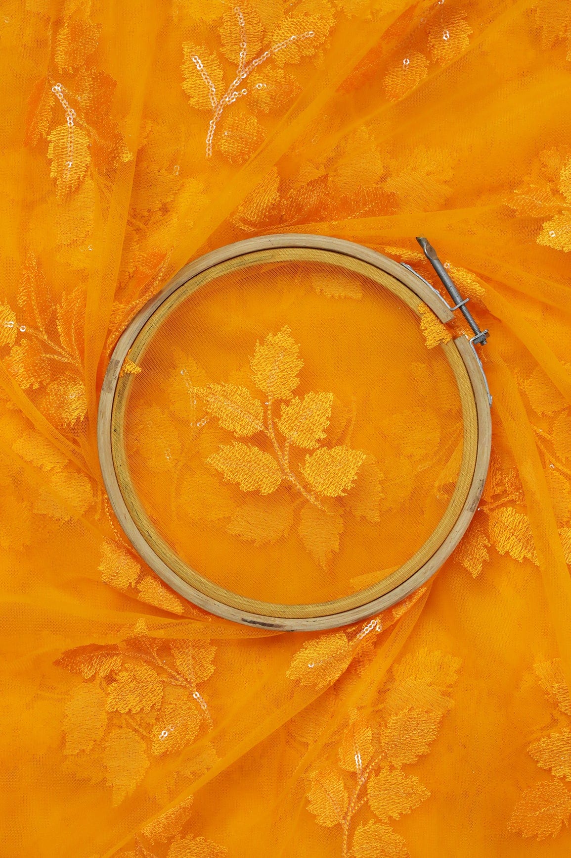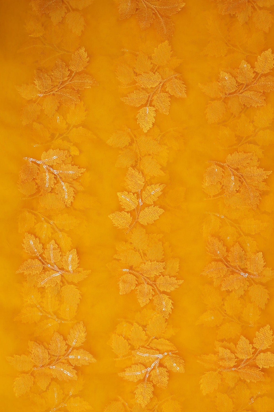 Yellow Ochre Thread With Sequins Leafy Embroidery Work On Yellow Ochre Soft Net Fabric