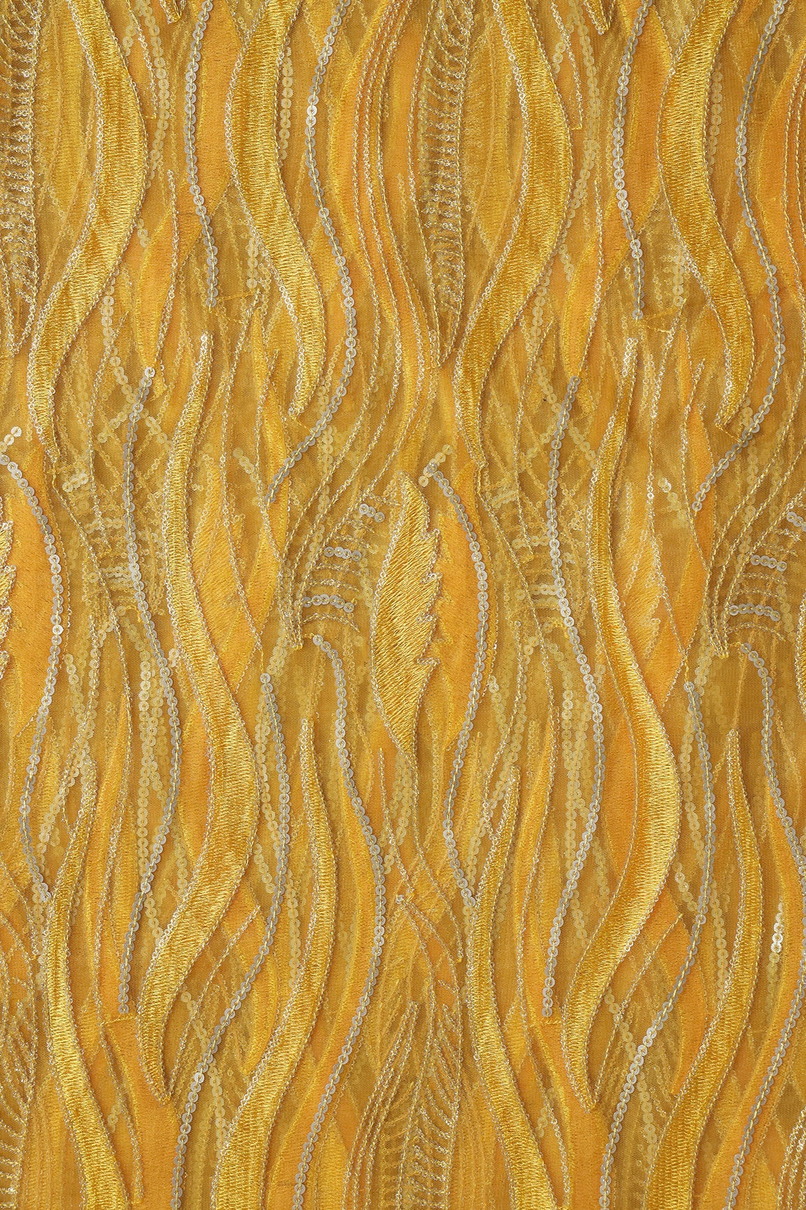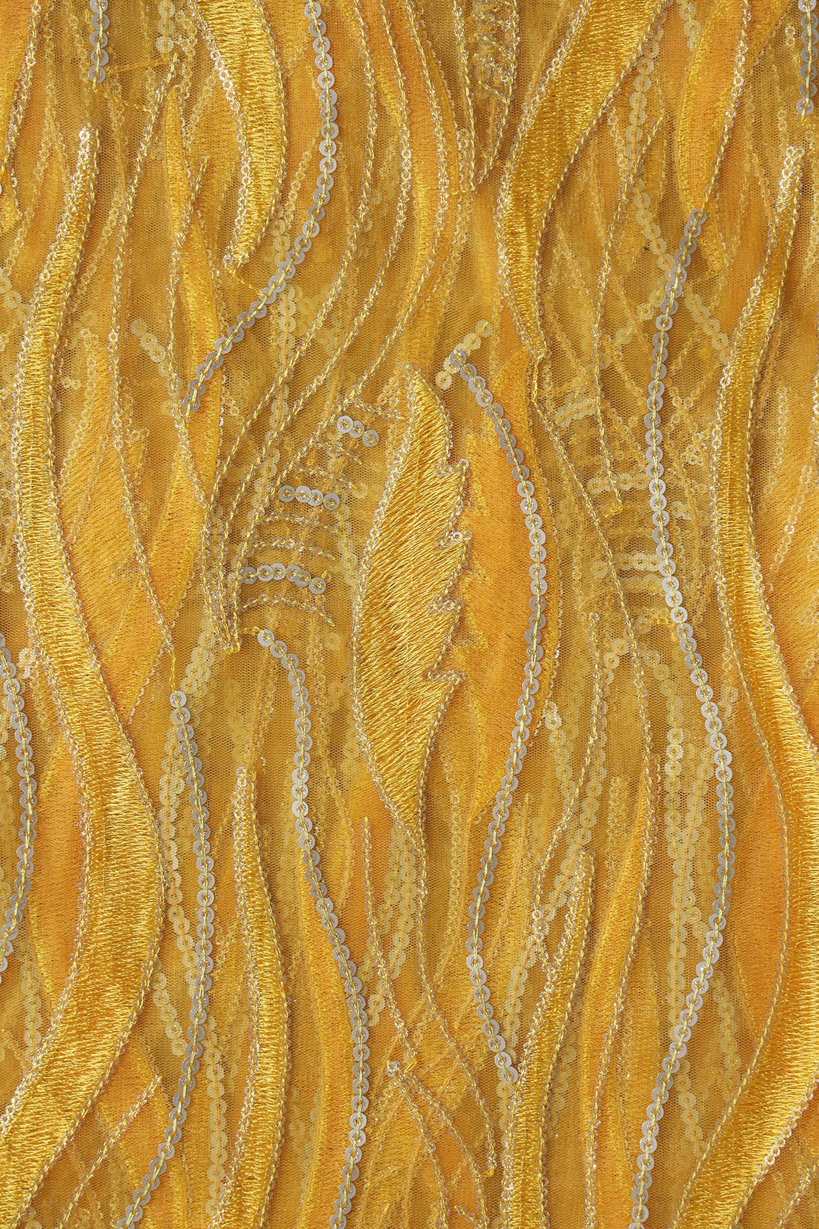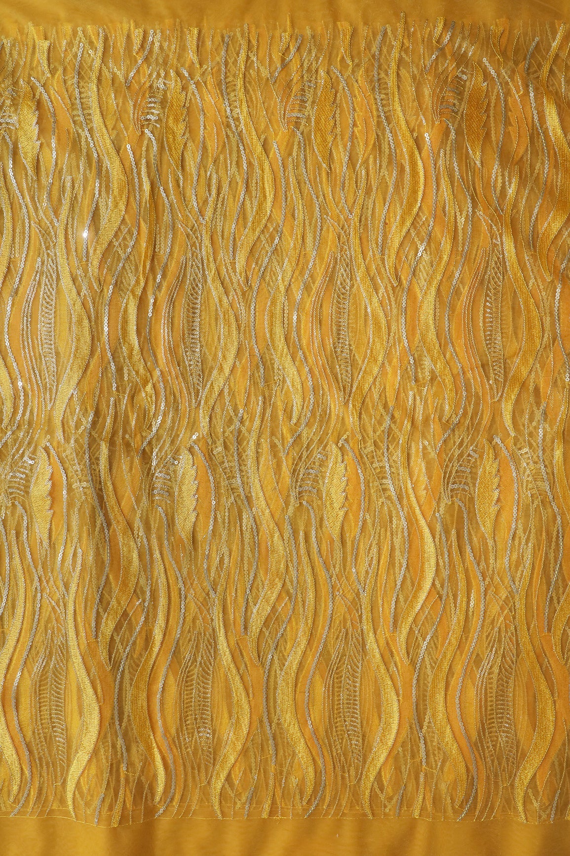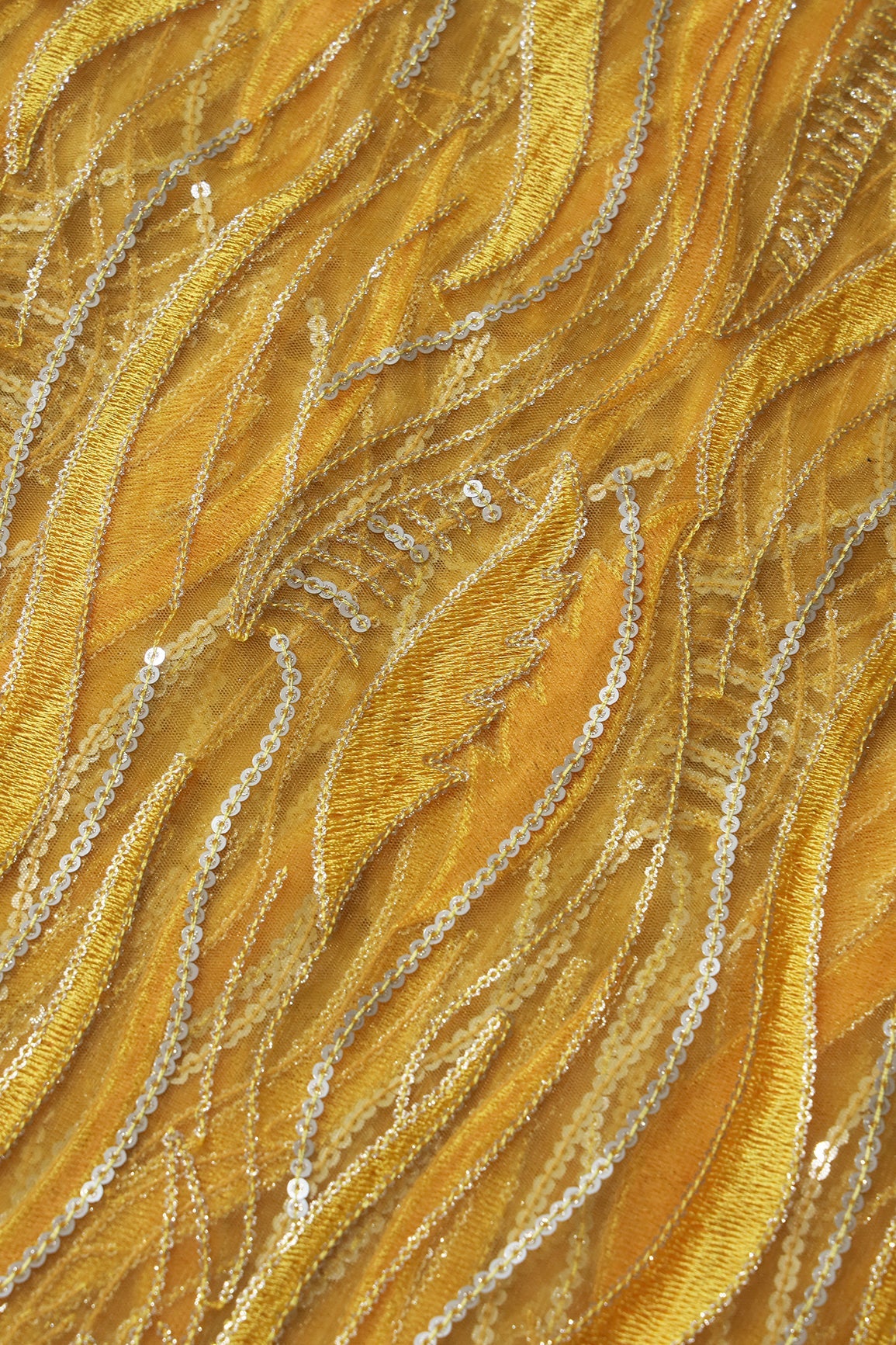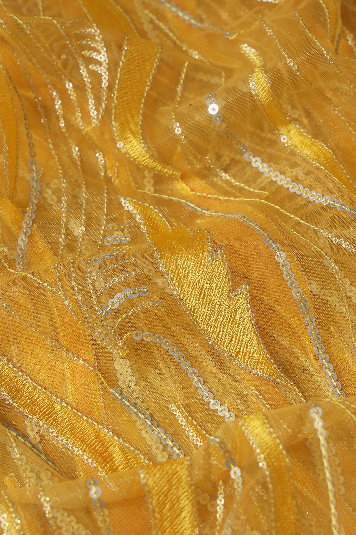 Yellow Thread With Sequins Wavy Embroidery Work On Yellow Soft Net Fabric