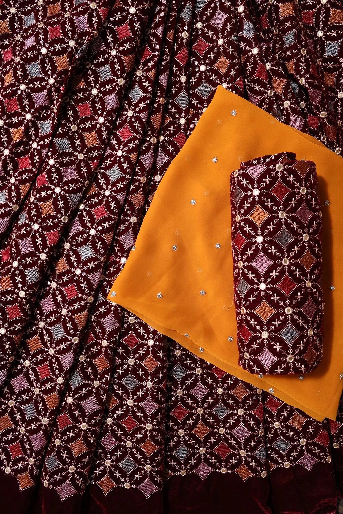 Fabric 1/Lehenga : Multi Thread With Sequins Geometric Embroidery Work On Maroon Velvet Fabric