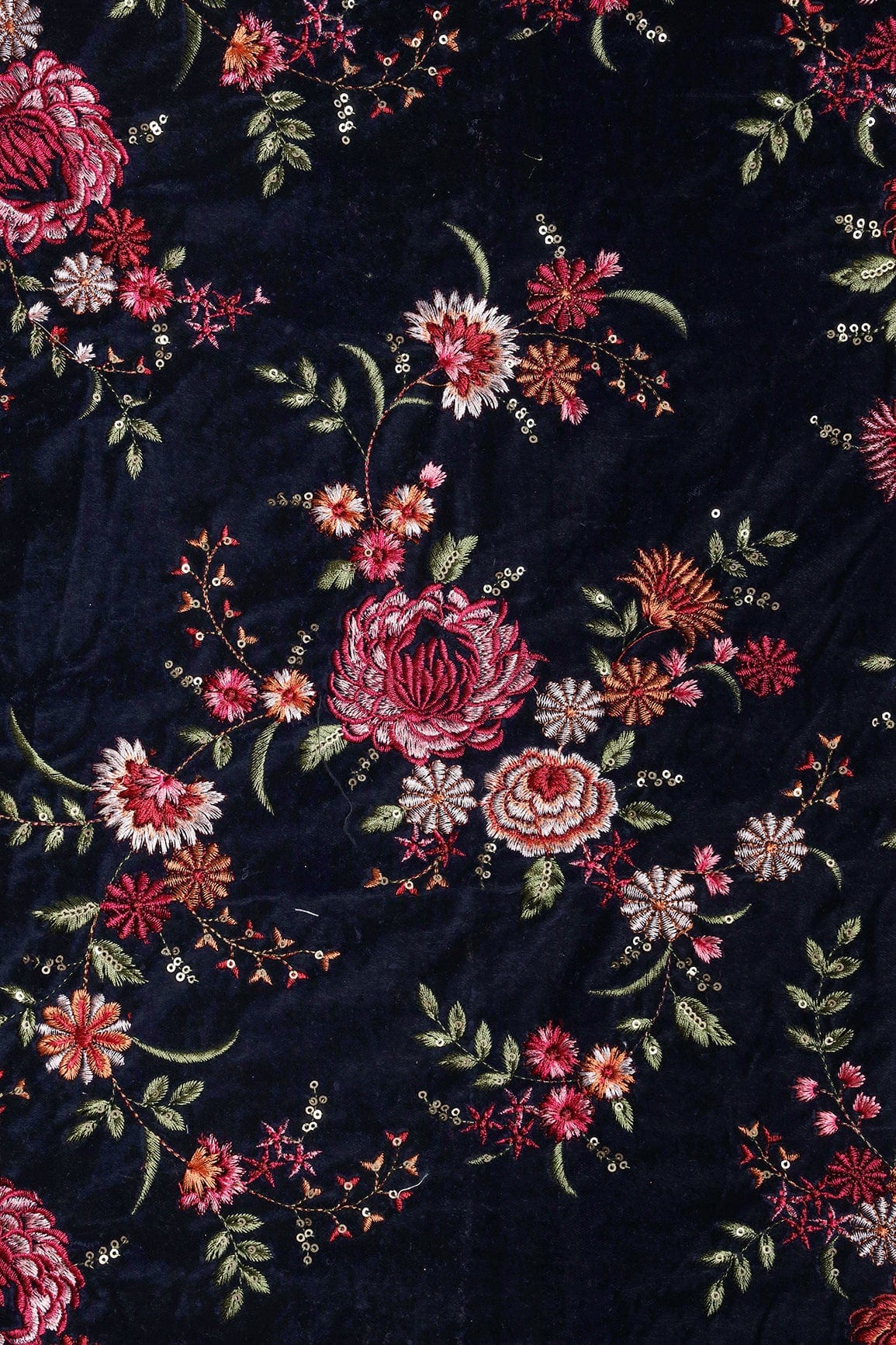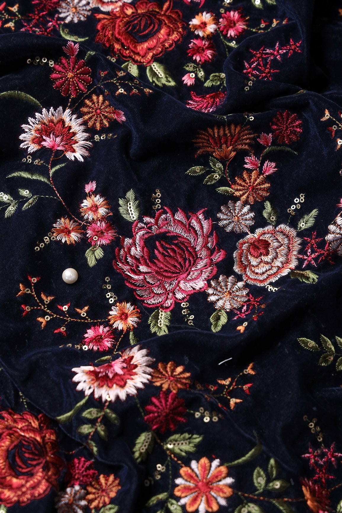 Fabric 2/ Blouse : Multi Color Heavy Floral Kashmiri Embroidery Work On Navy Blue Velvet Fabric