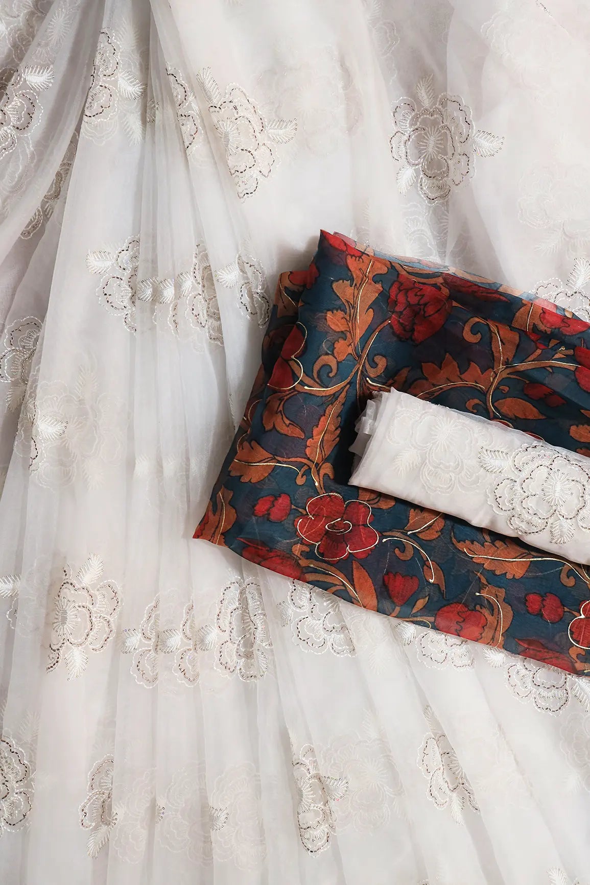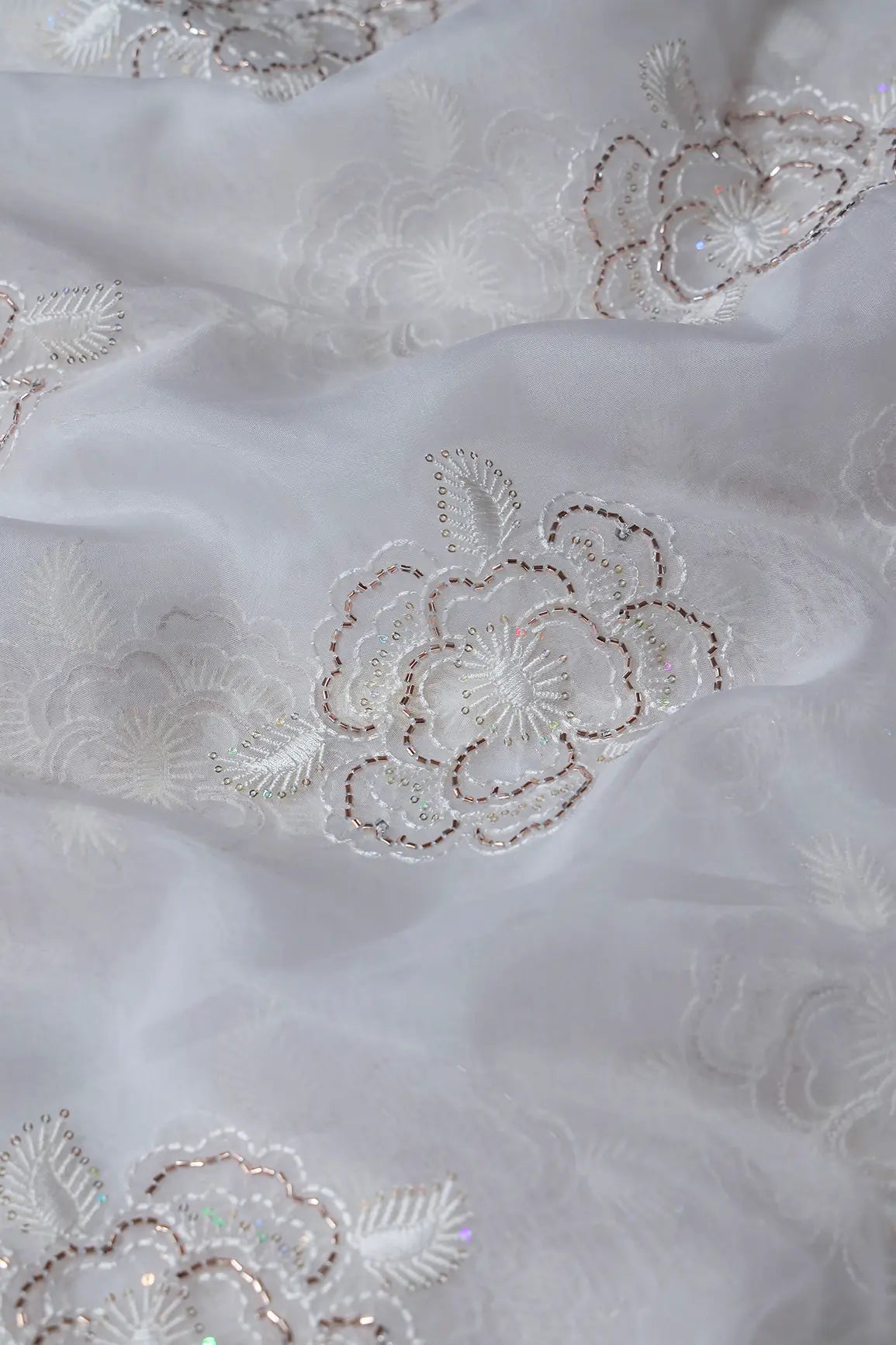 Fabric 1/Lehenga : Small Sequins With Beads And Thread Work Floral Embroidery On Dyeable White Organza Fabric