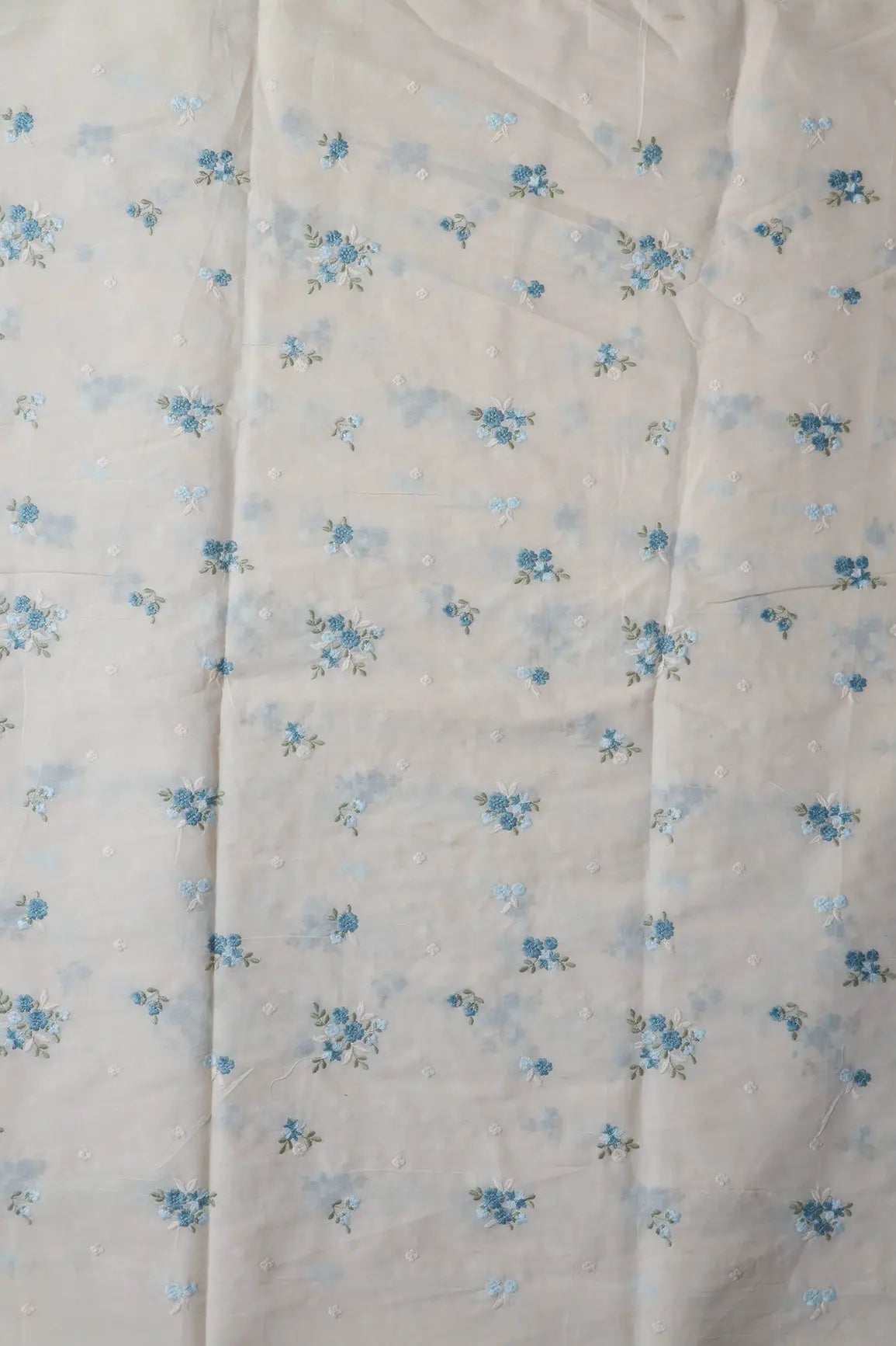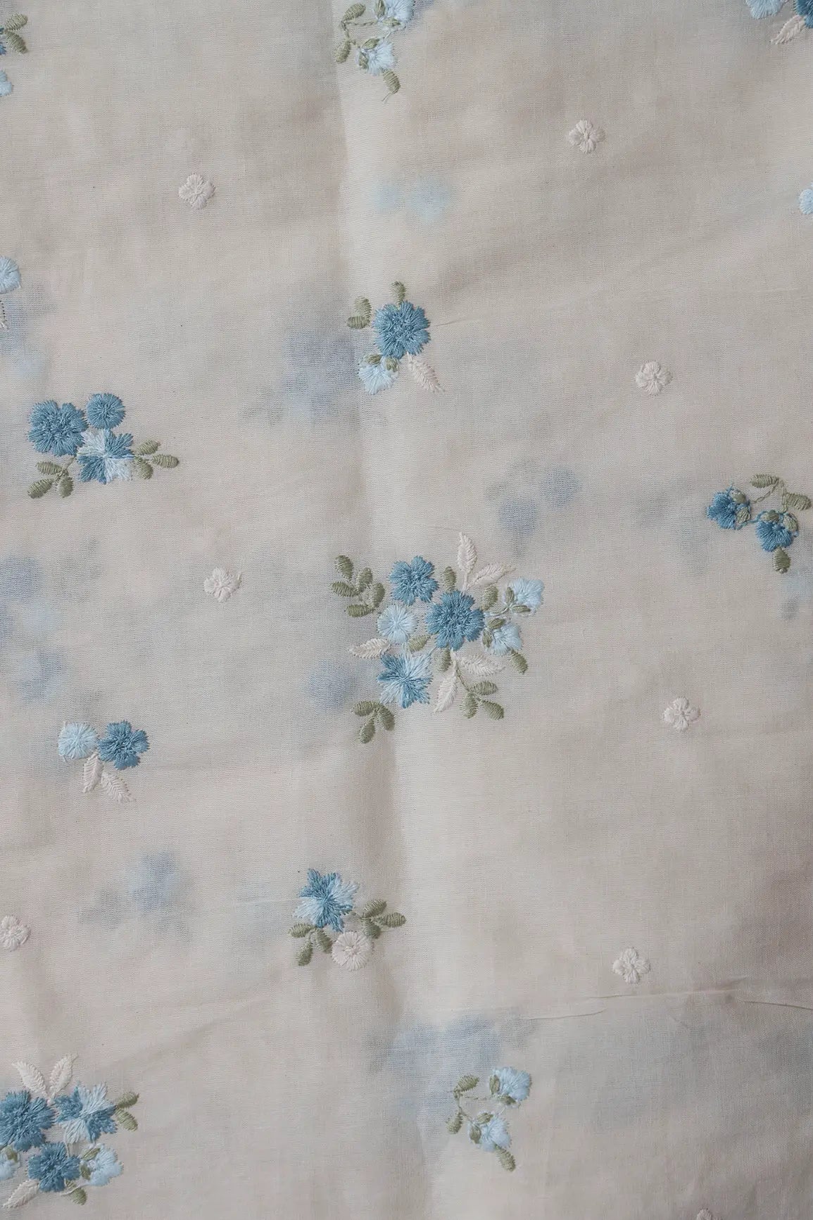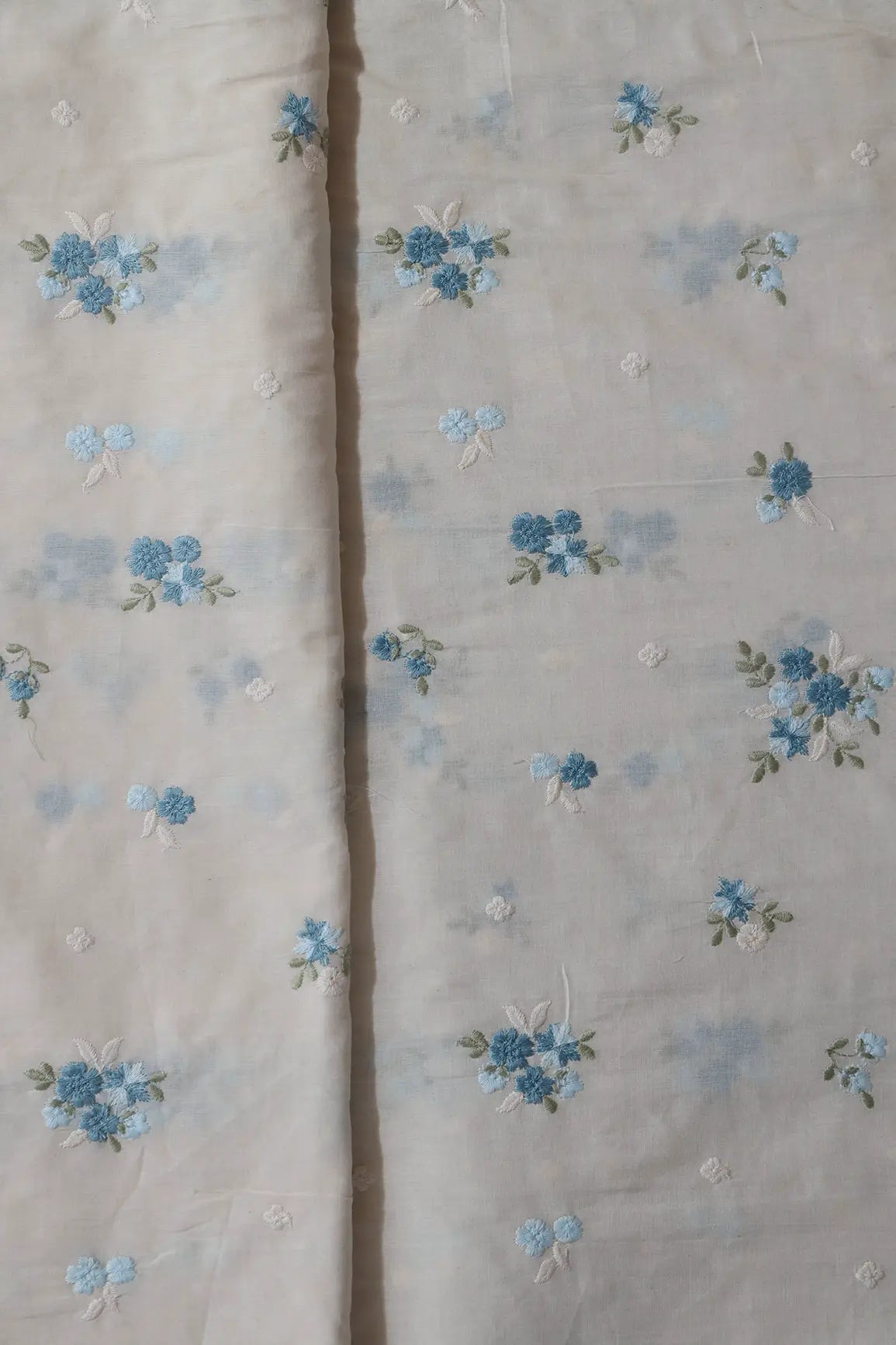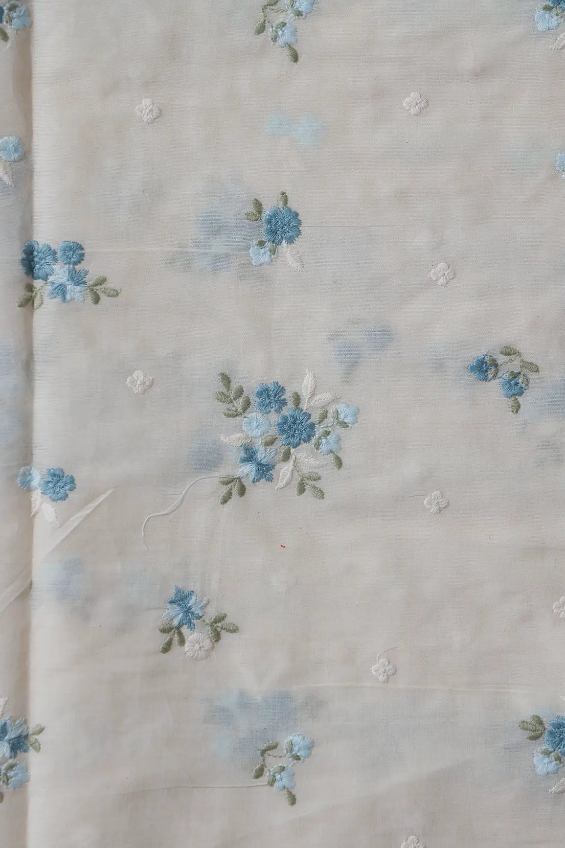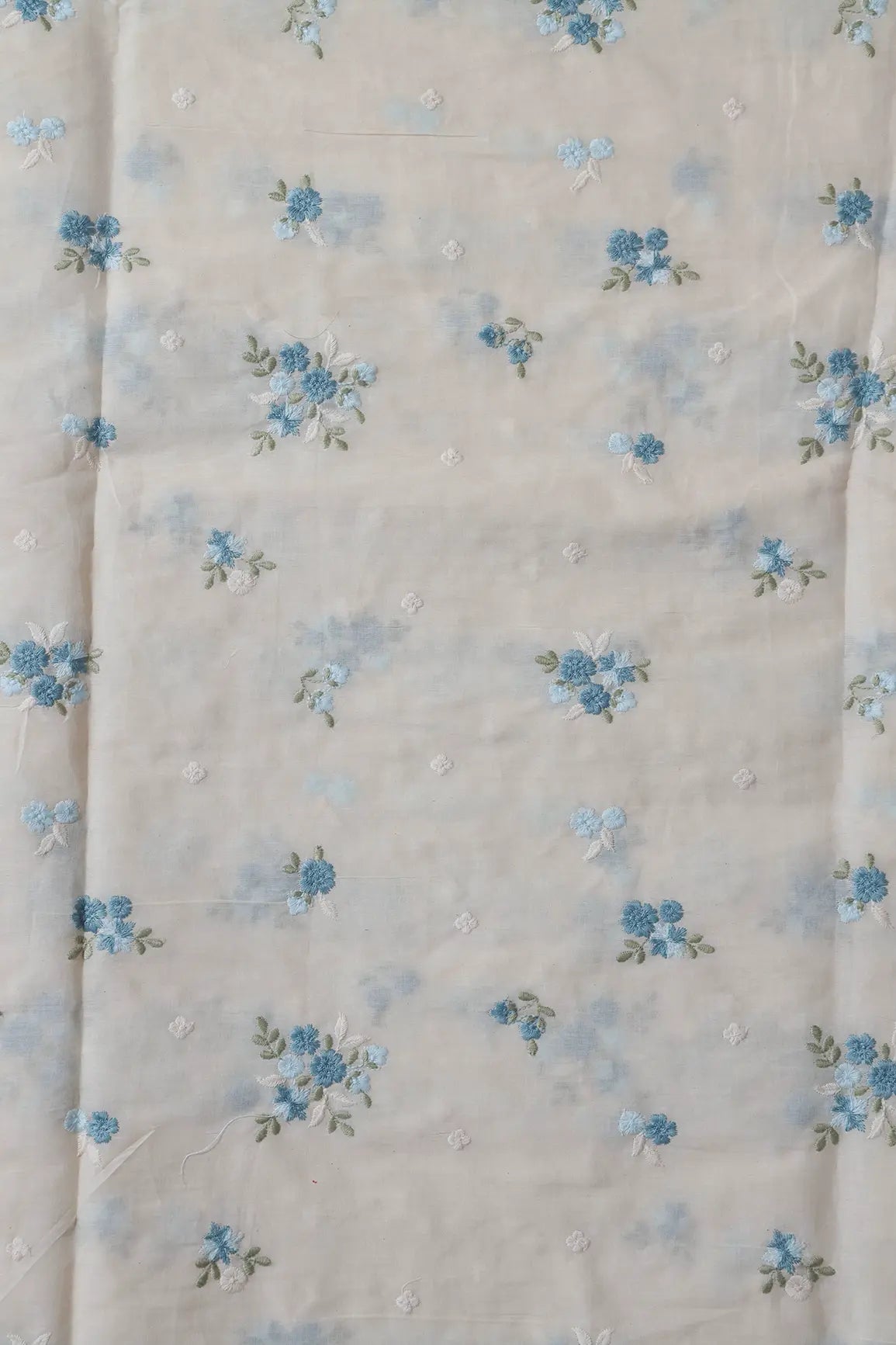 Sky Blue And Olive Thread Beautiful Floral Embroidery On Off White Organic Cotton Fabric