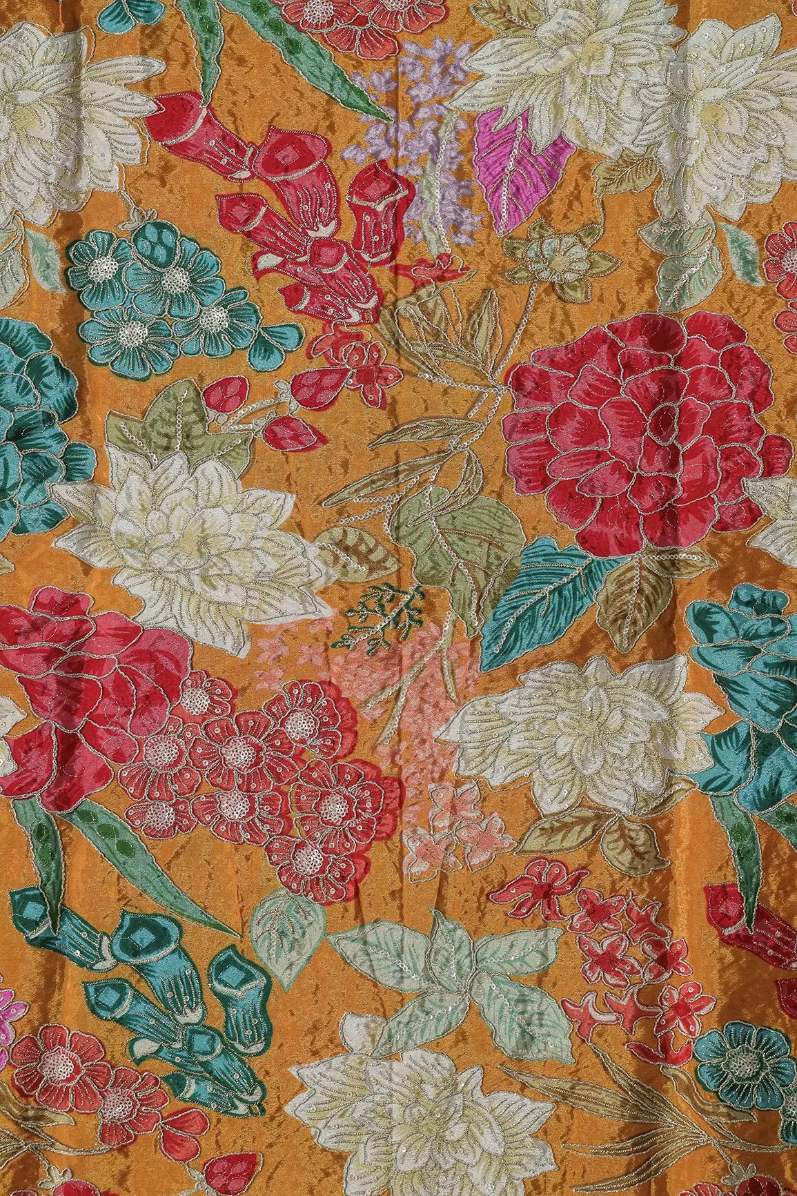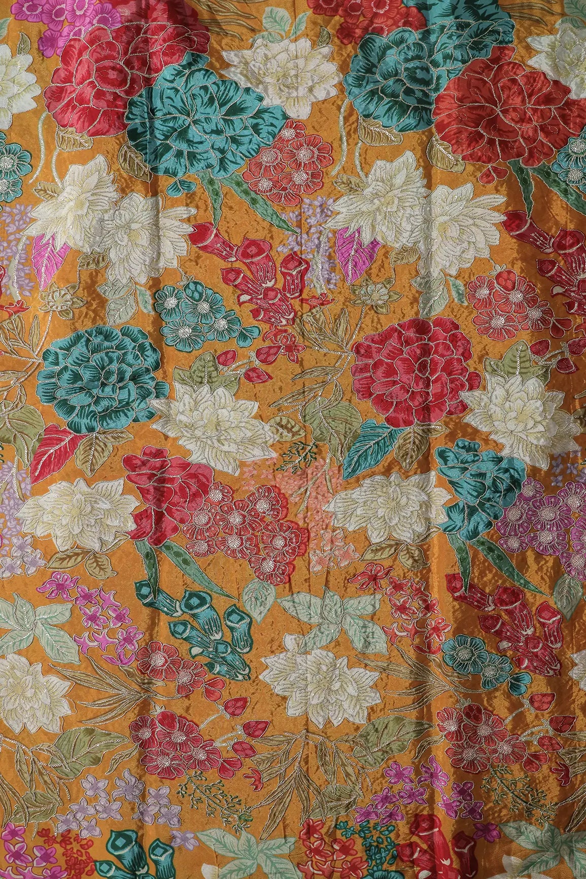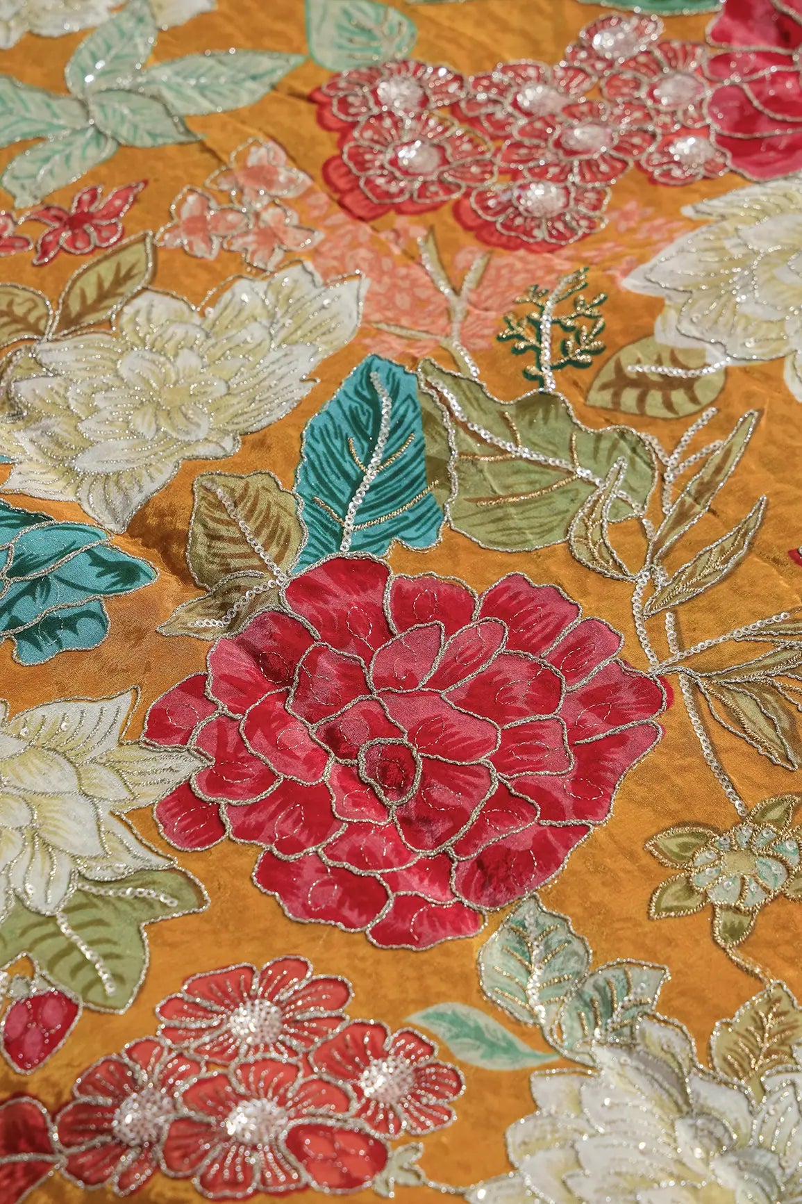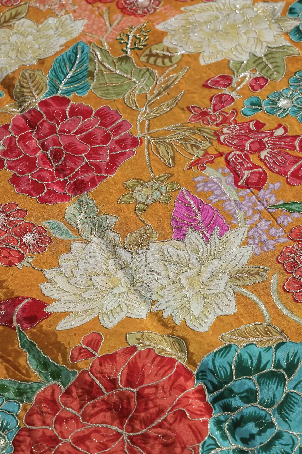 Zari with Sequins Floral Positional Print On Mustard Yellow Pure Crepe Fabric