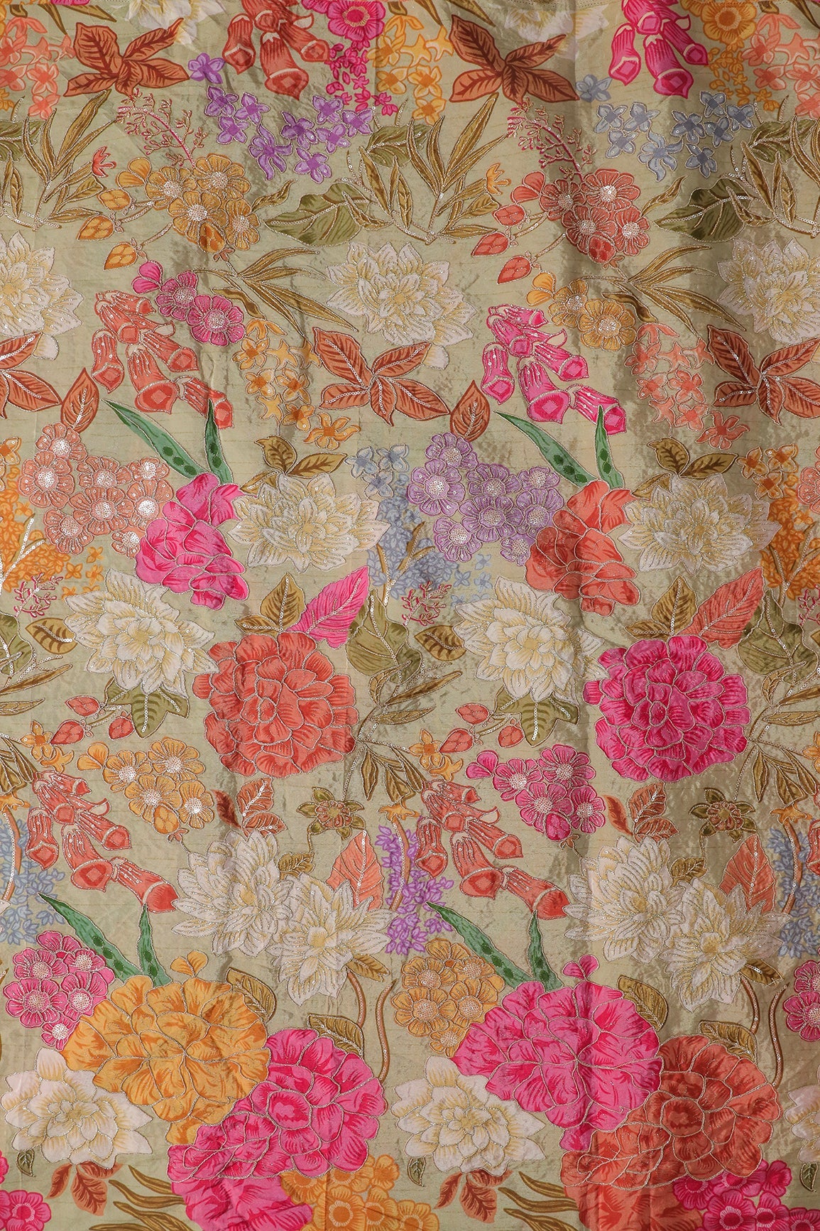 Zari with Sequins Floral Positional Print On Pastel Olive Pure Crepe Fabric