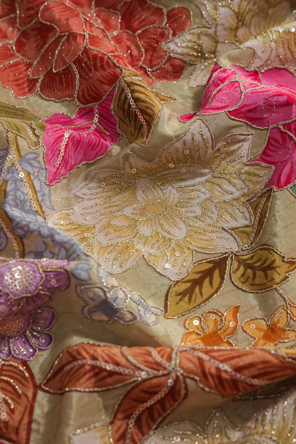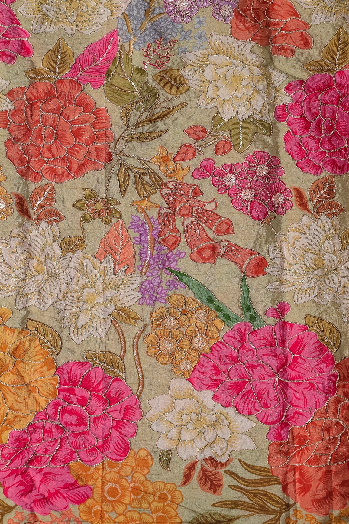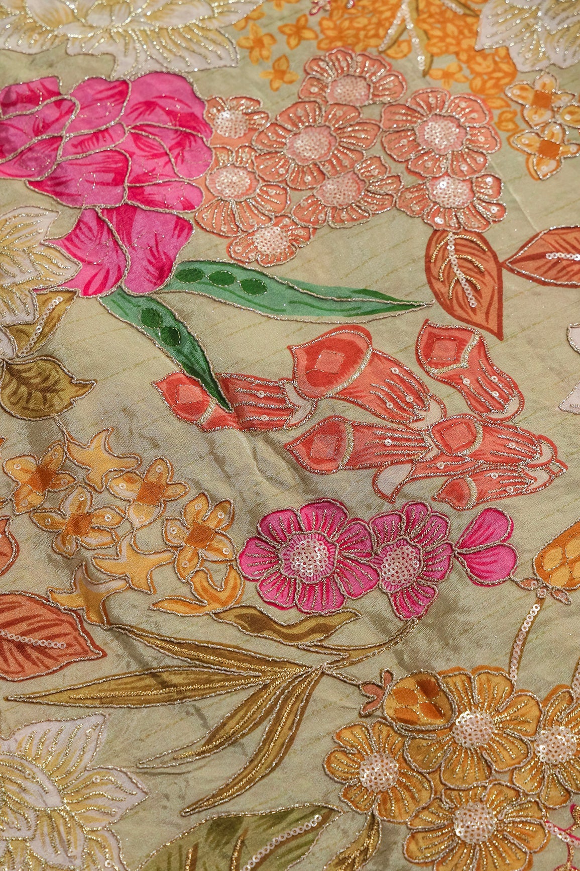 Zari with Sequins Floral Positional Print On  Pastel Olive Pure Crepe Fabric