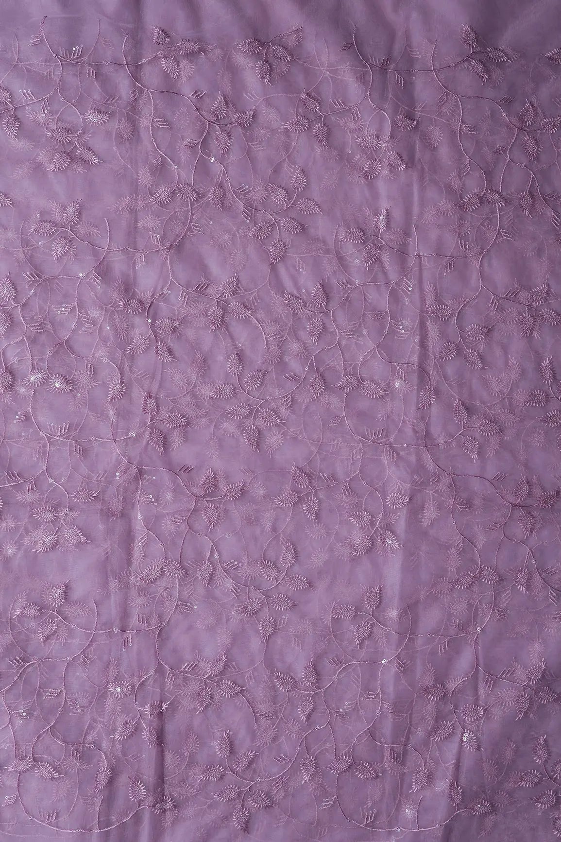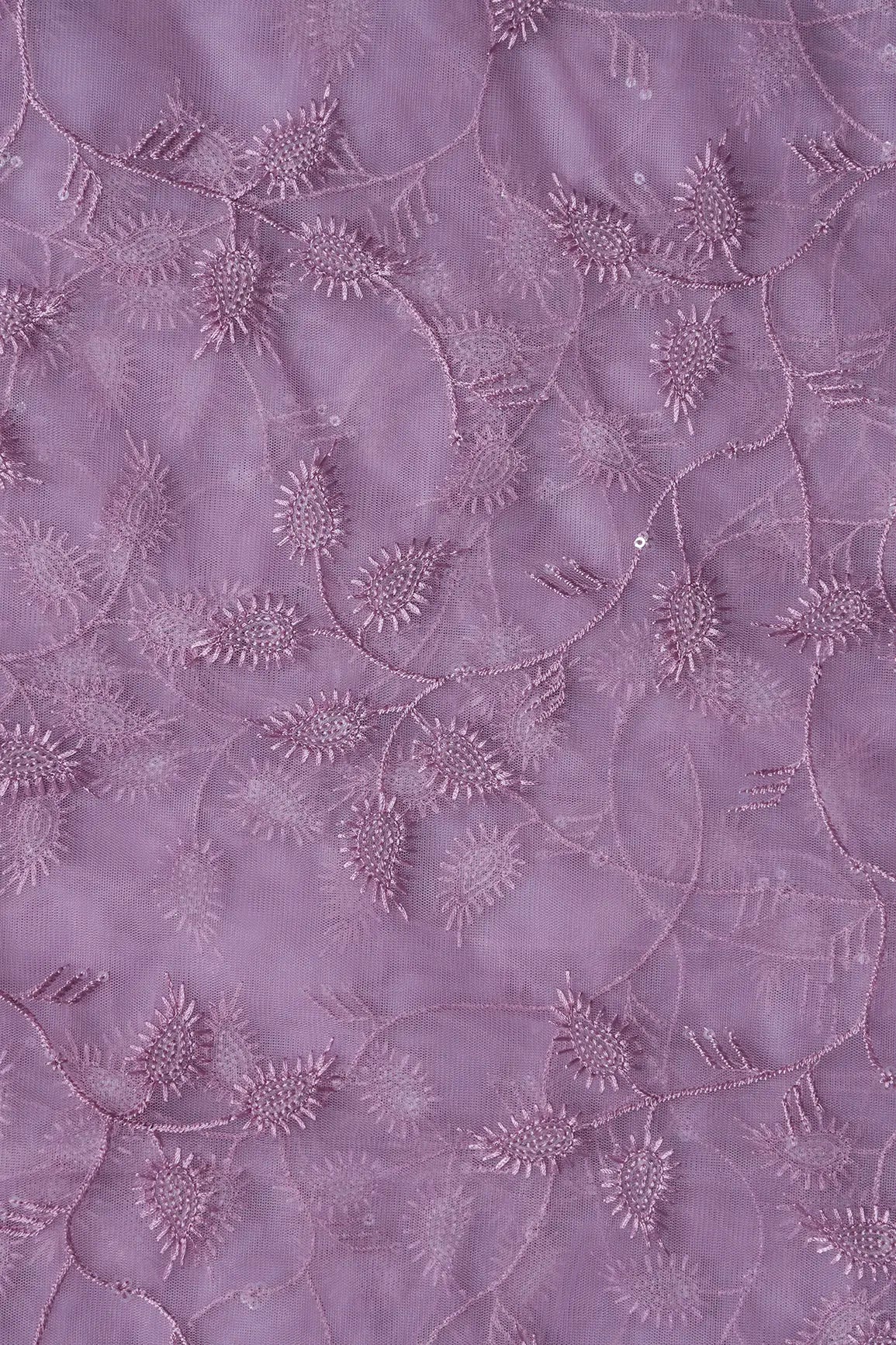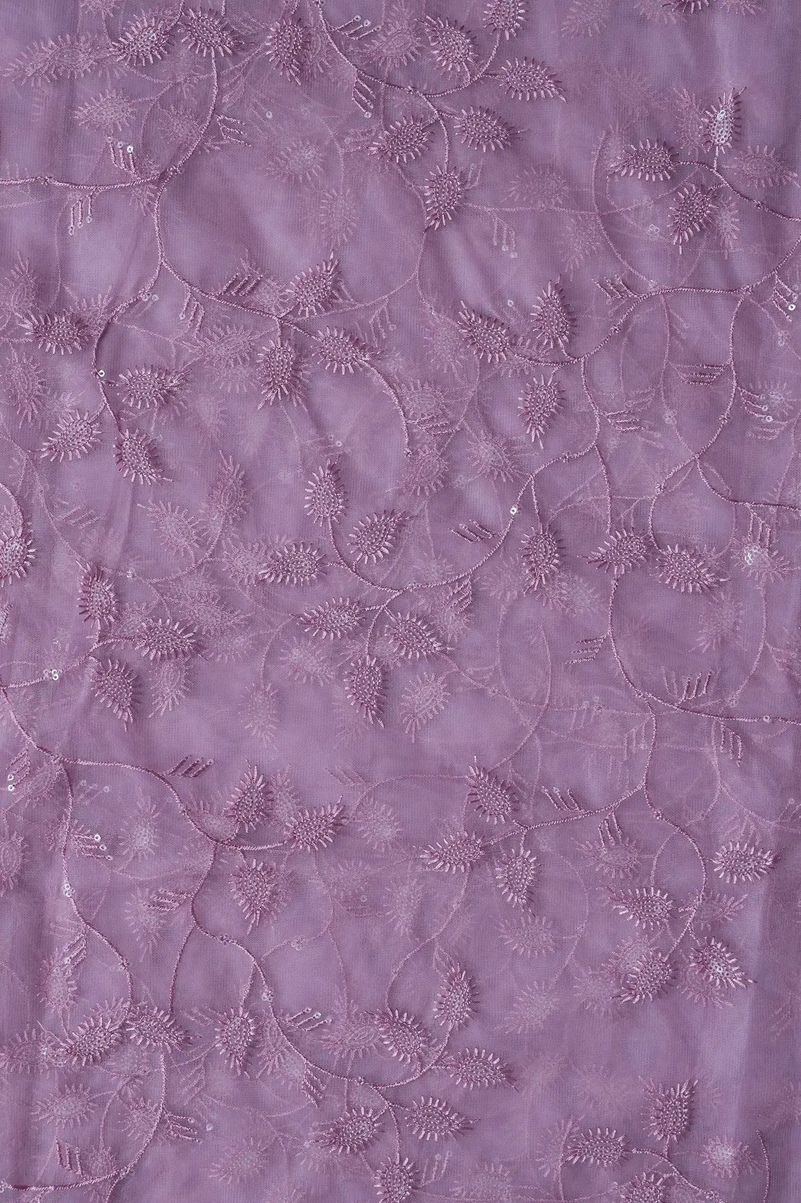 Mauve Thread With Water Sequins Leafy Embroidery On Mauve Soft Net Fabric
