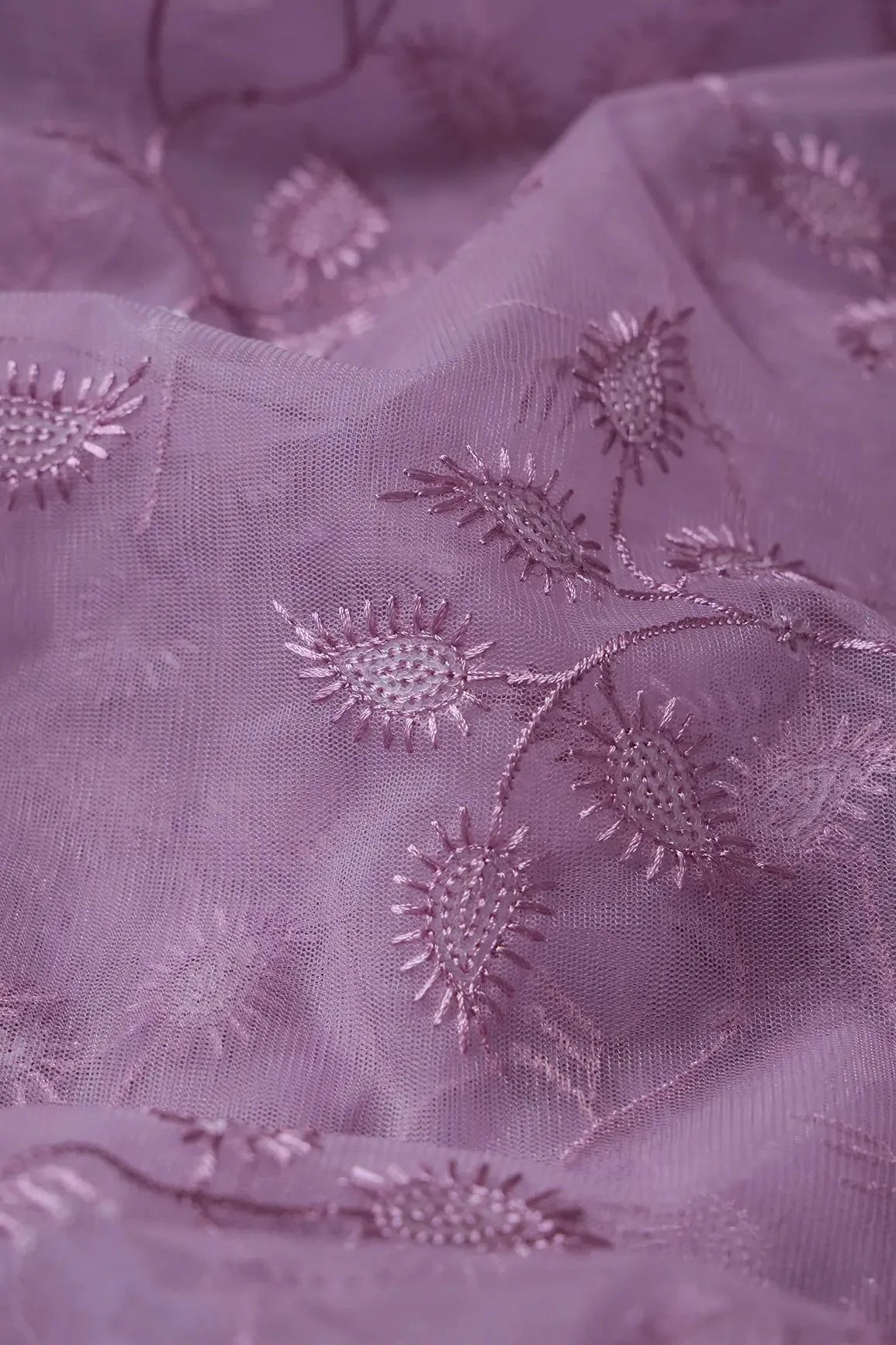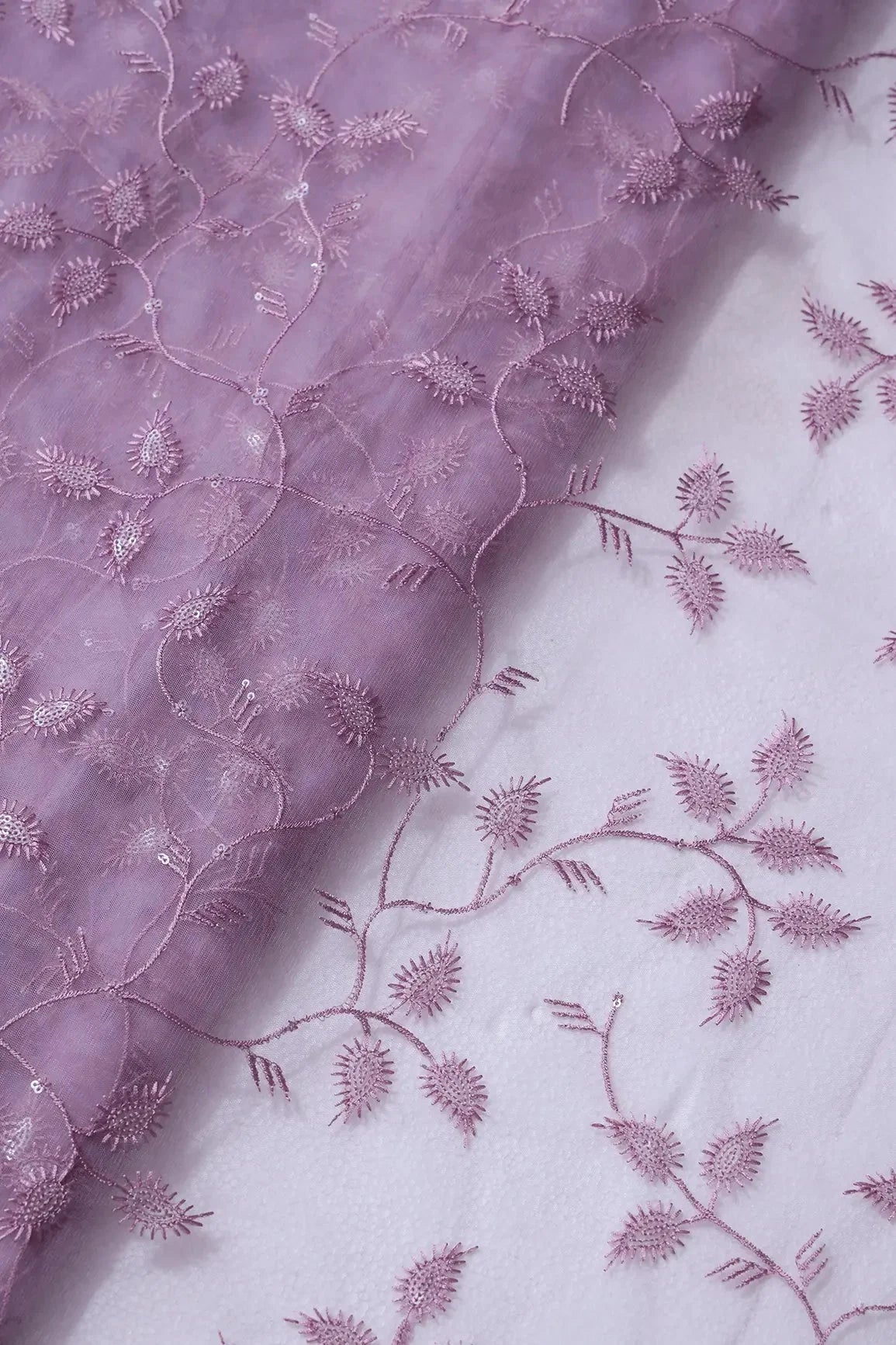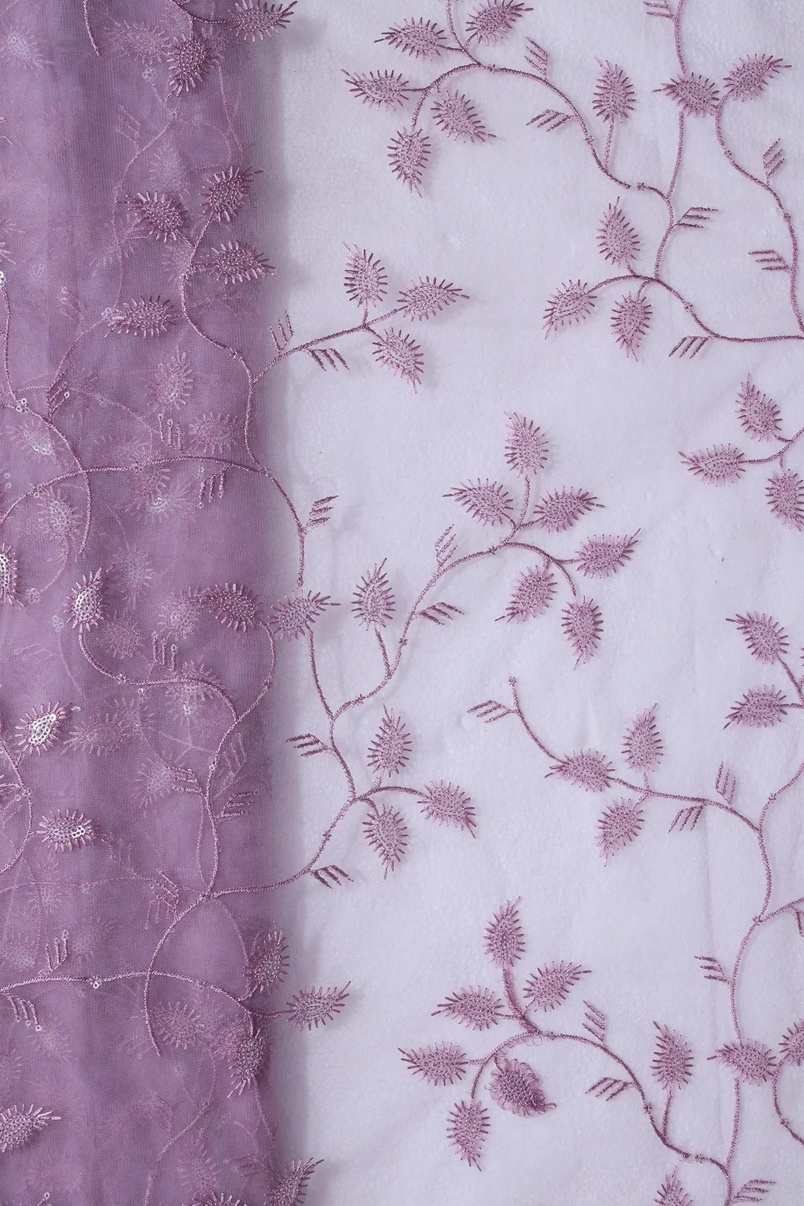 Mauve Thread With Water Sequins Leafy Embroidery On Mauve Soft Net Fabric