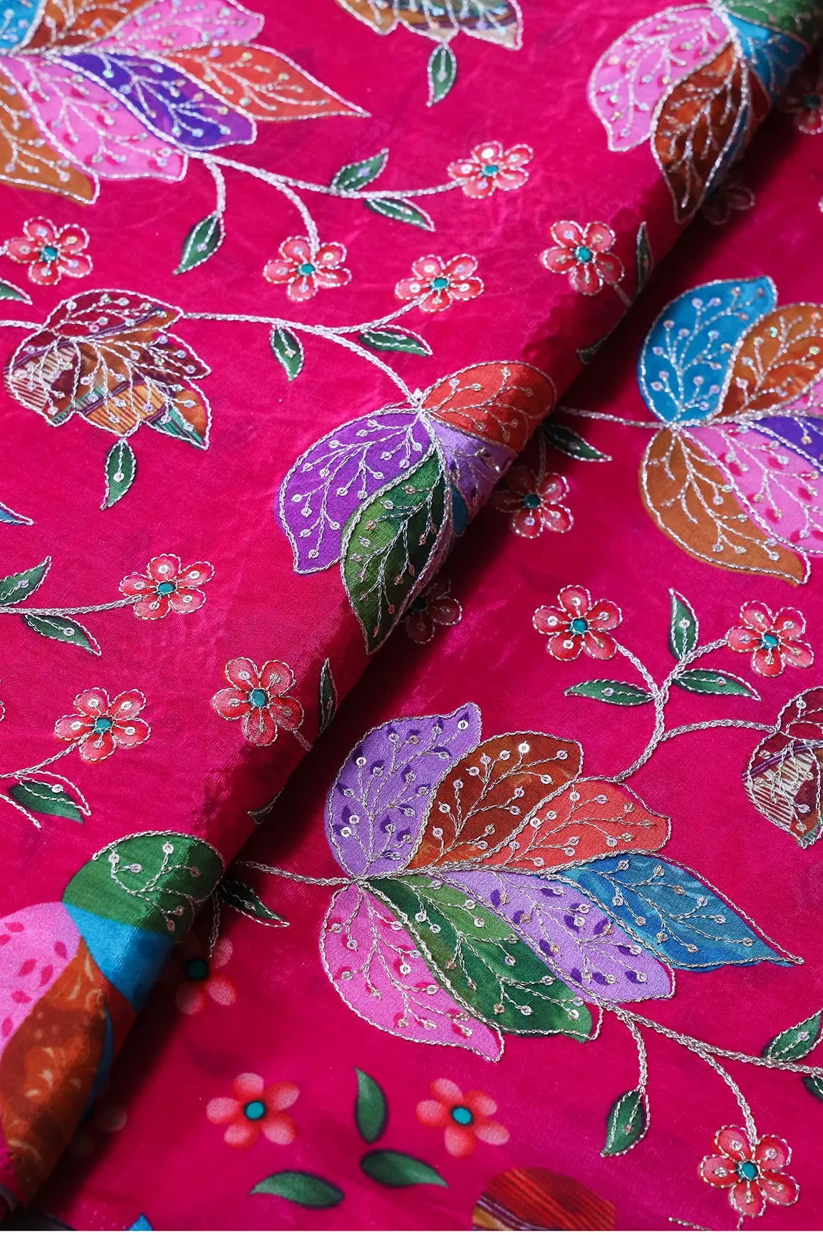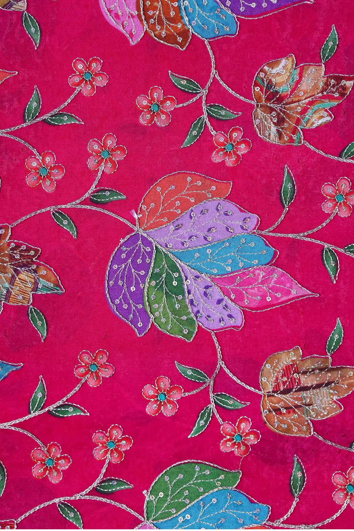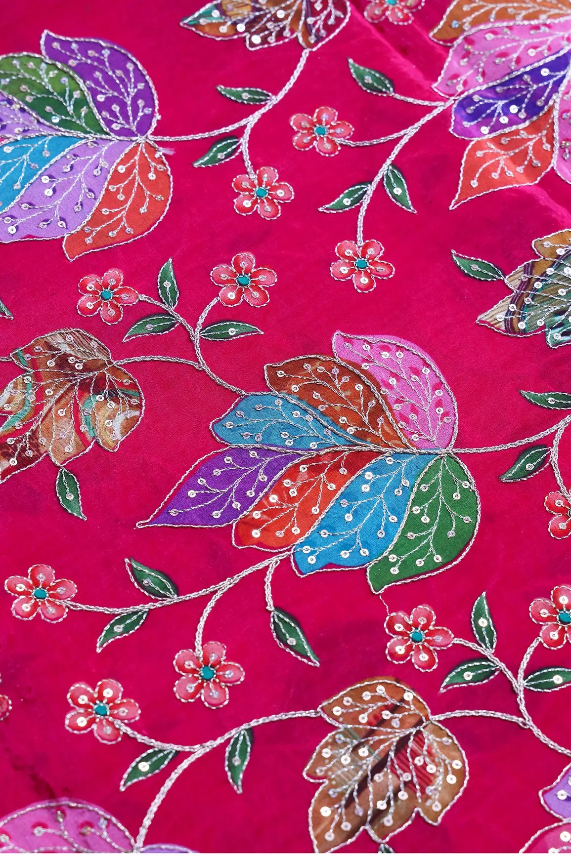 Multi Color Printed Position Leafy Print With Gold Zari And Sequins Embroidery On Dark Rani Crepe Fabric