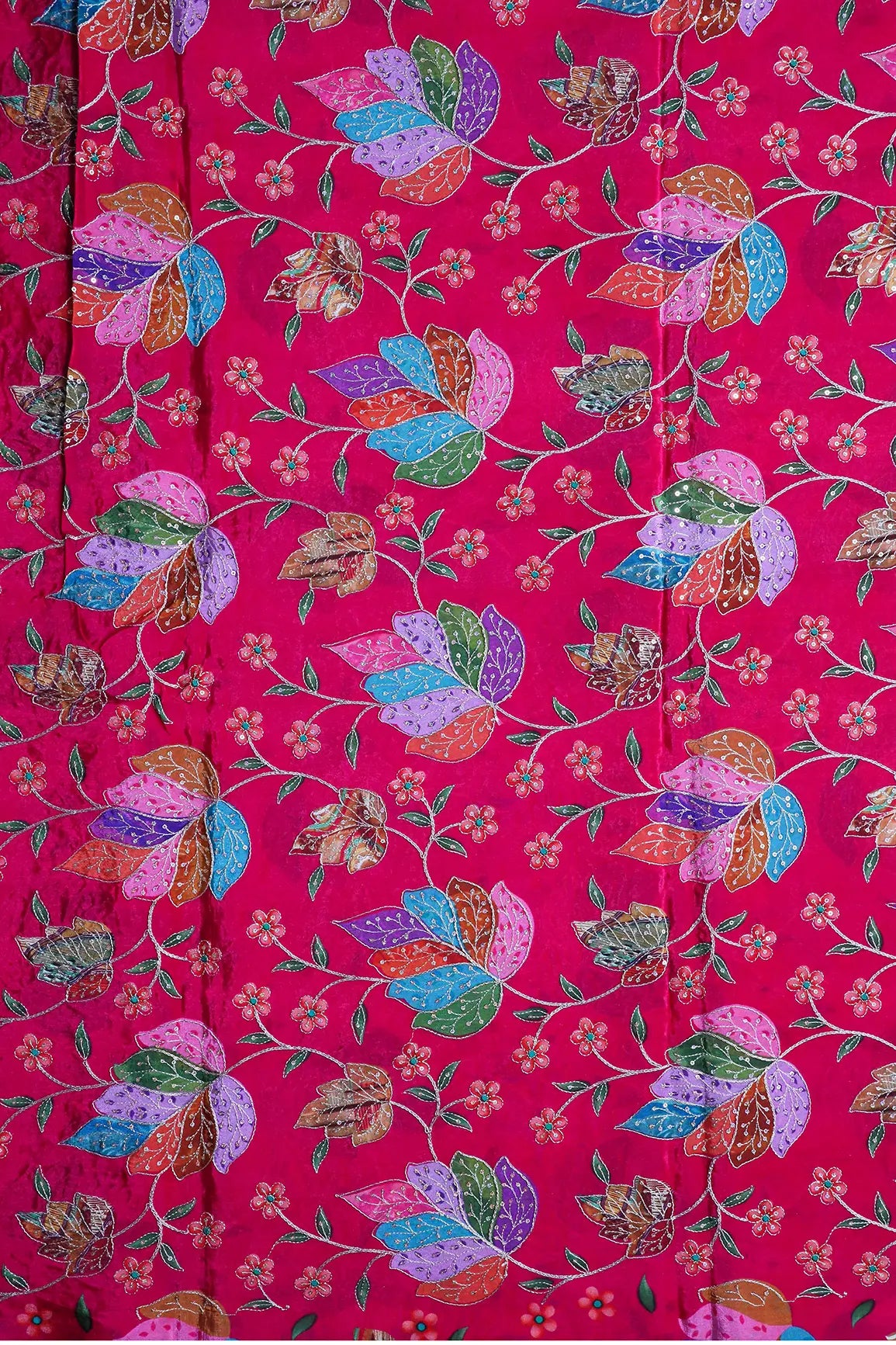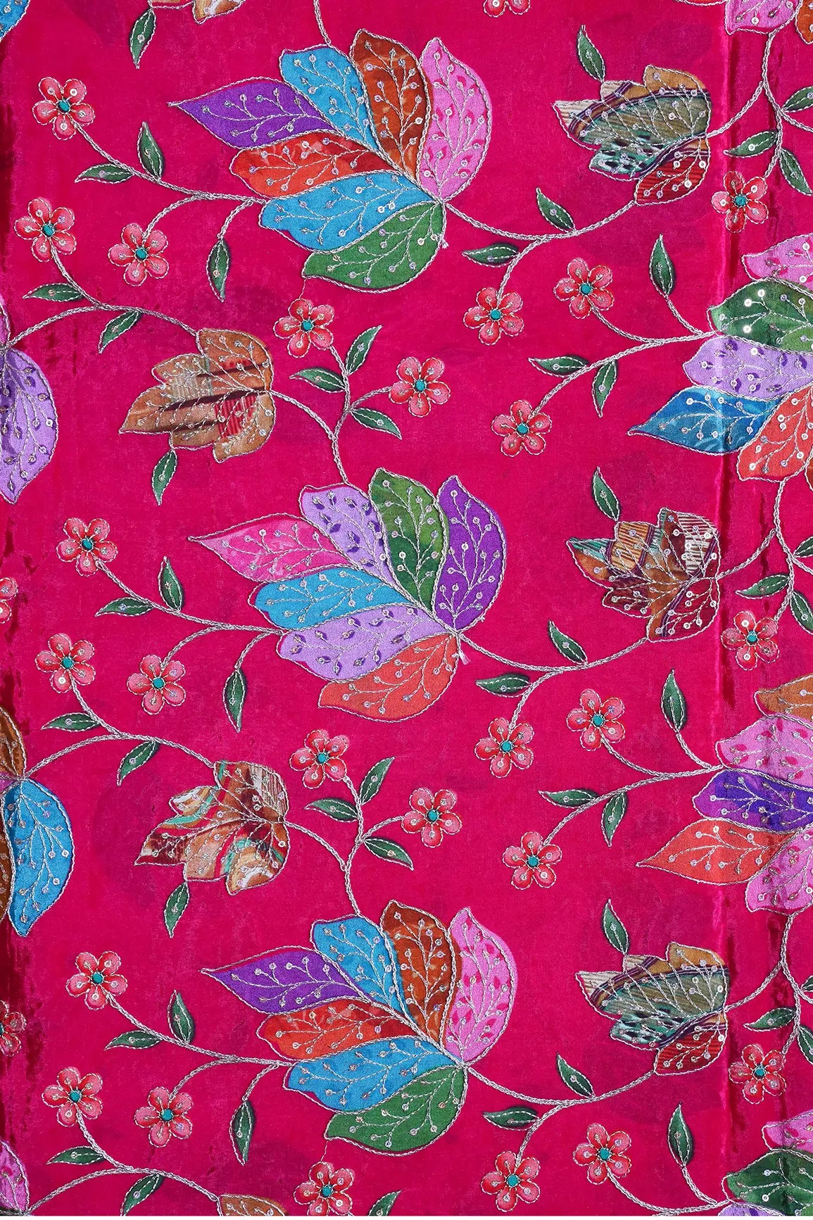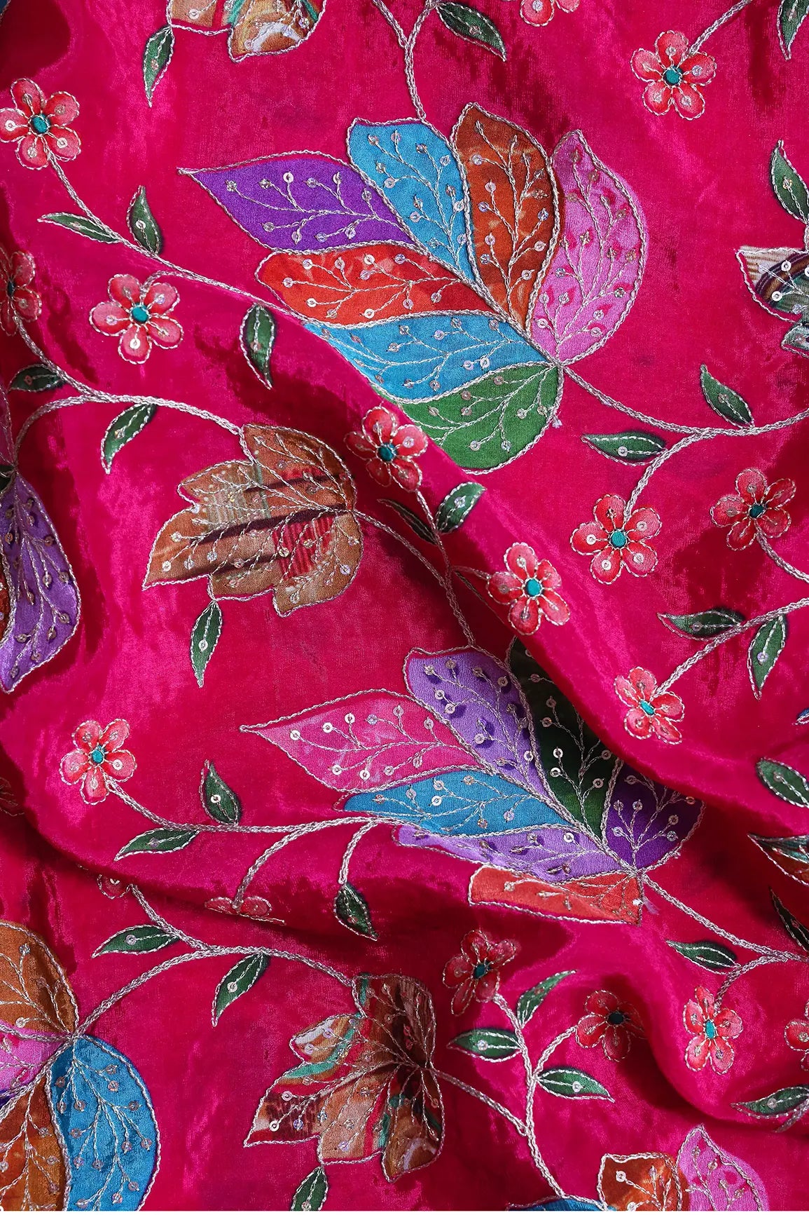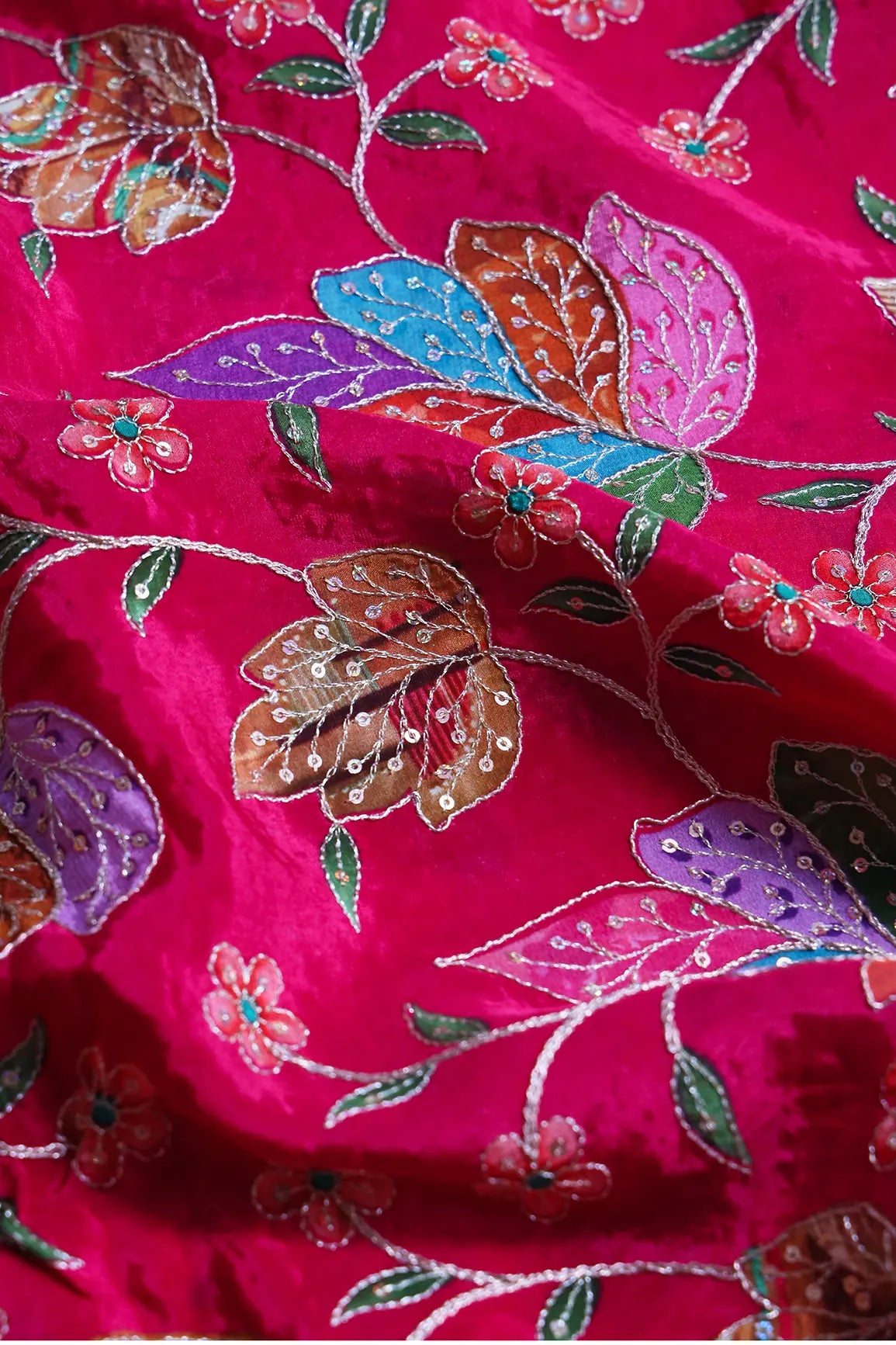 Multi Color Printed Position Leafy Print With Gold Zari And Sequins Embroidery On Dark Rani Crepe Fabric
