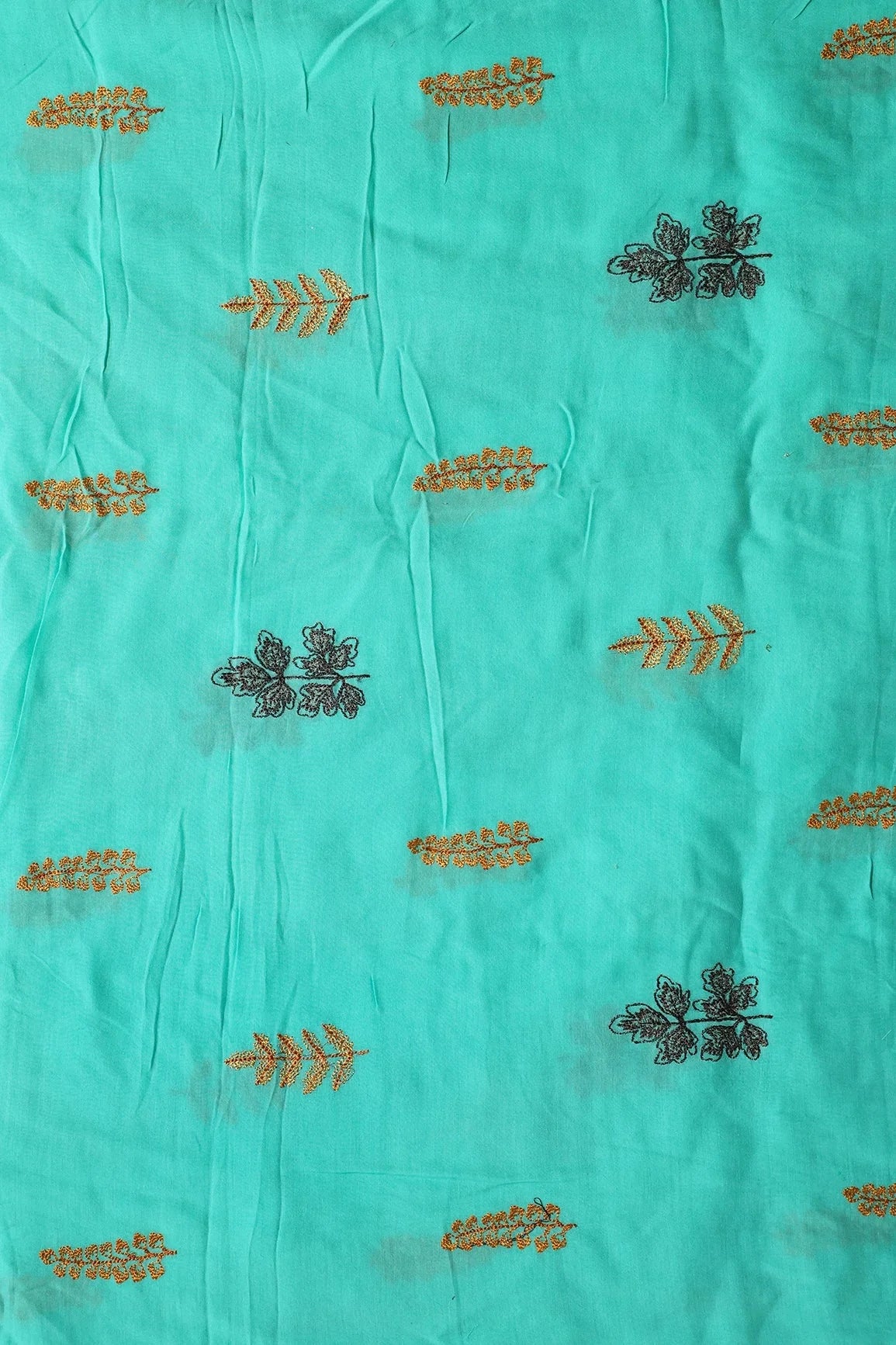 Multi Thread Floral Embroidery On Turquoise Muslin Silk Fabric