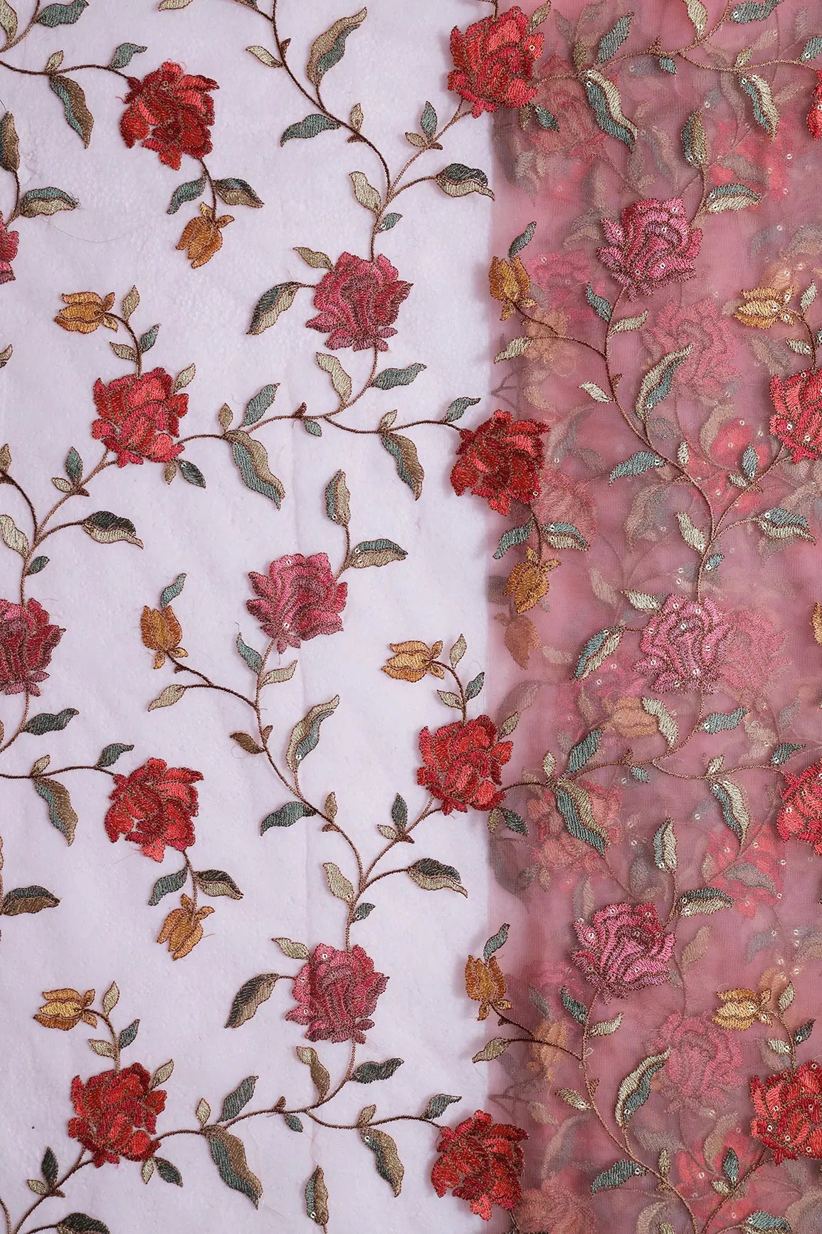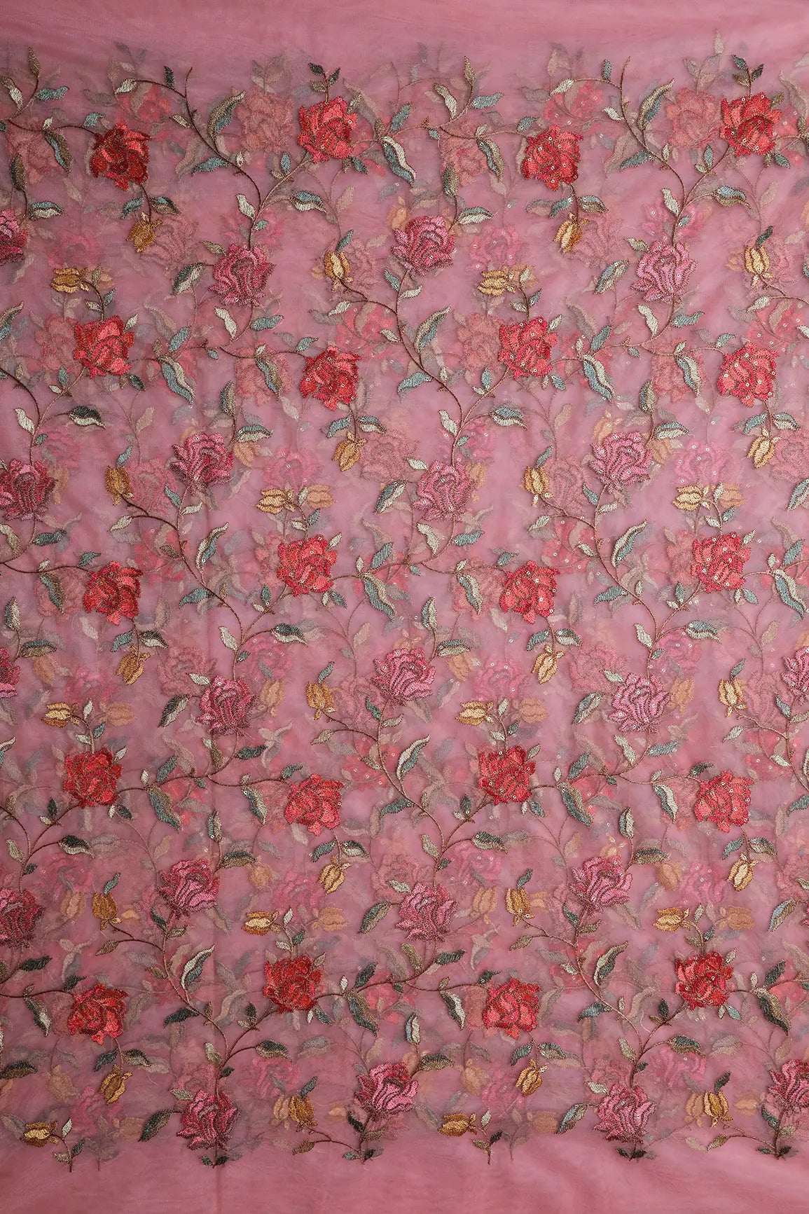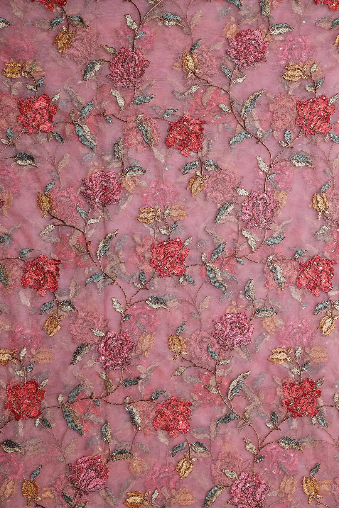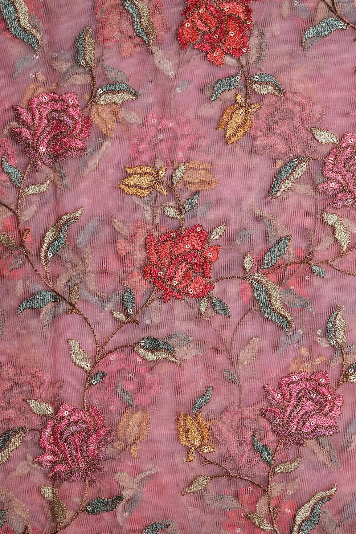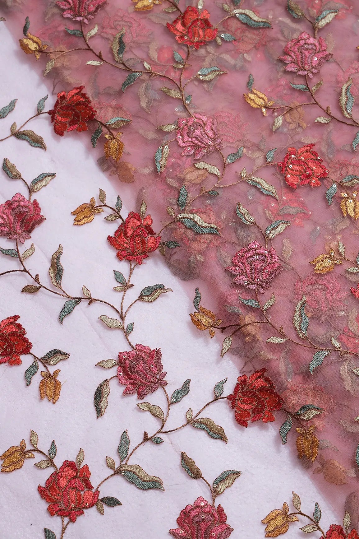 Multi Thread With Sequins Floral Embroidery Work On Pink Soft Net Fabric