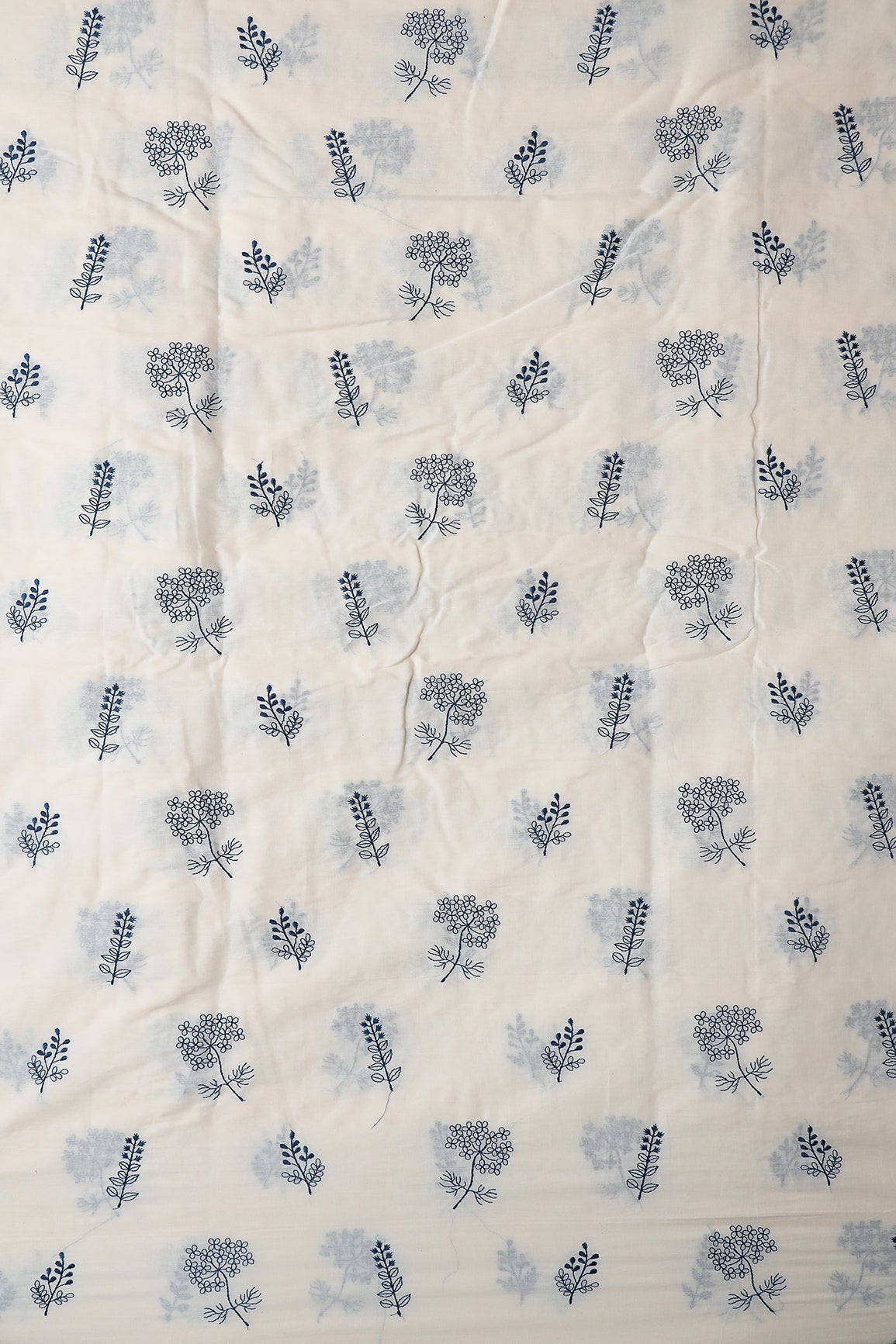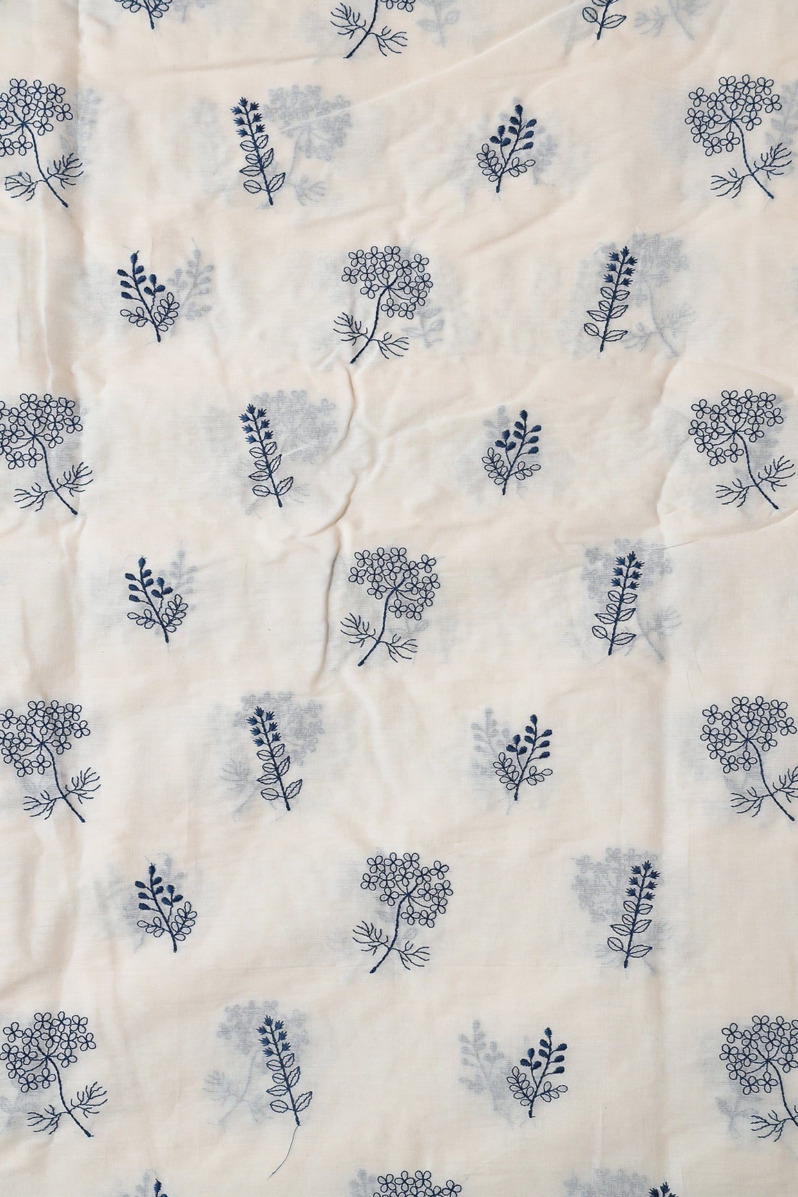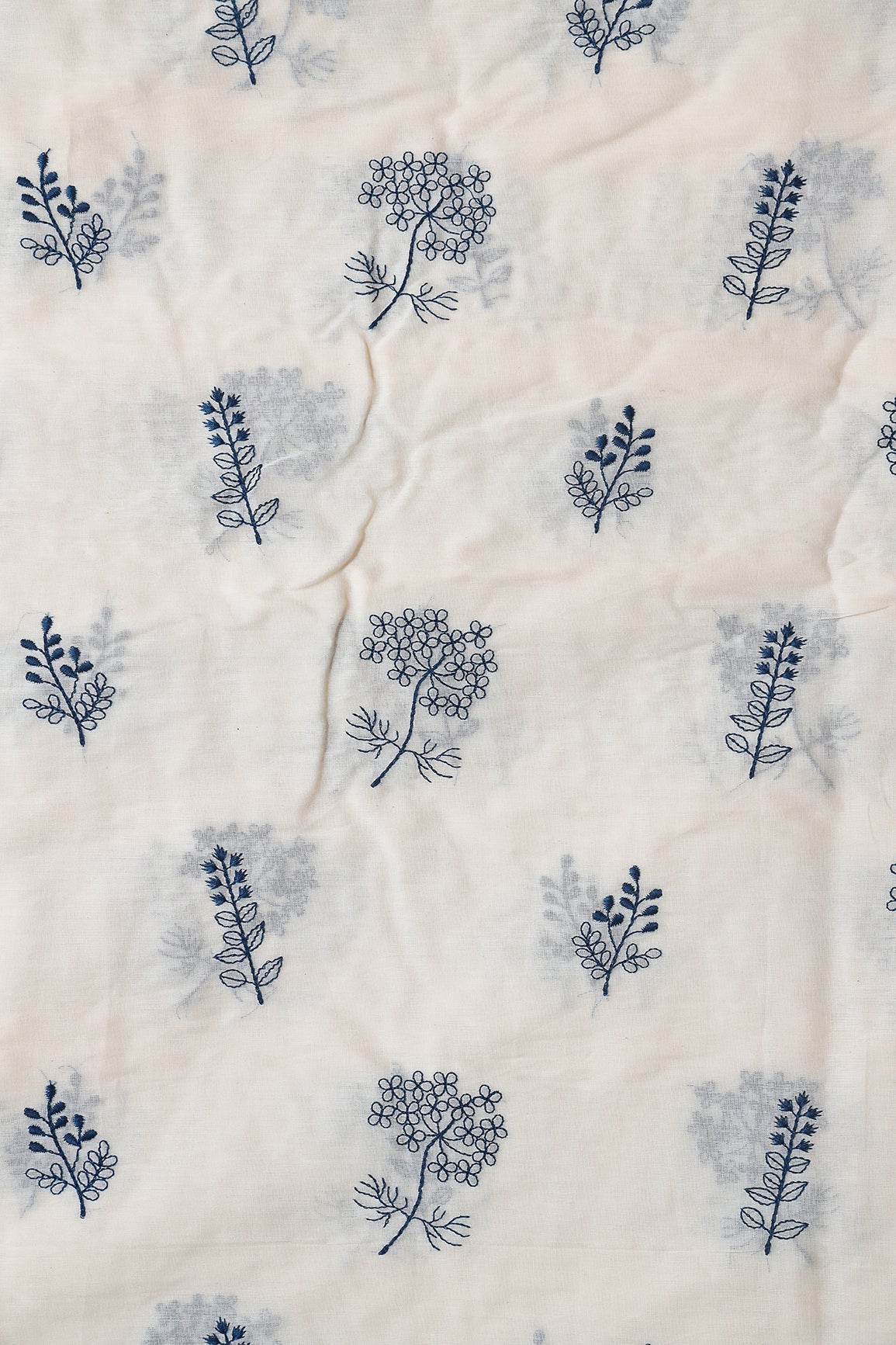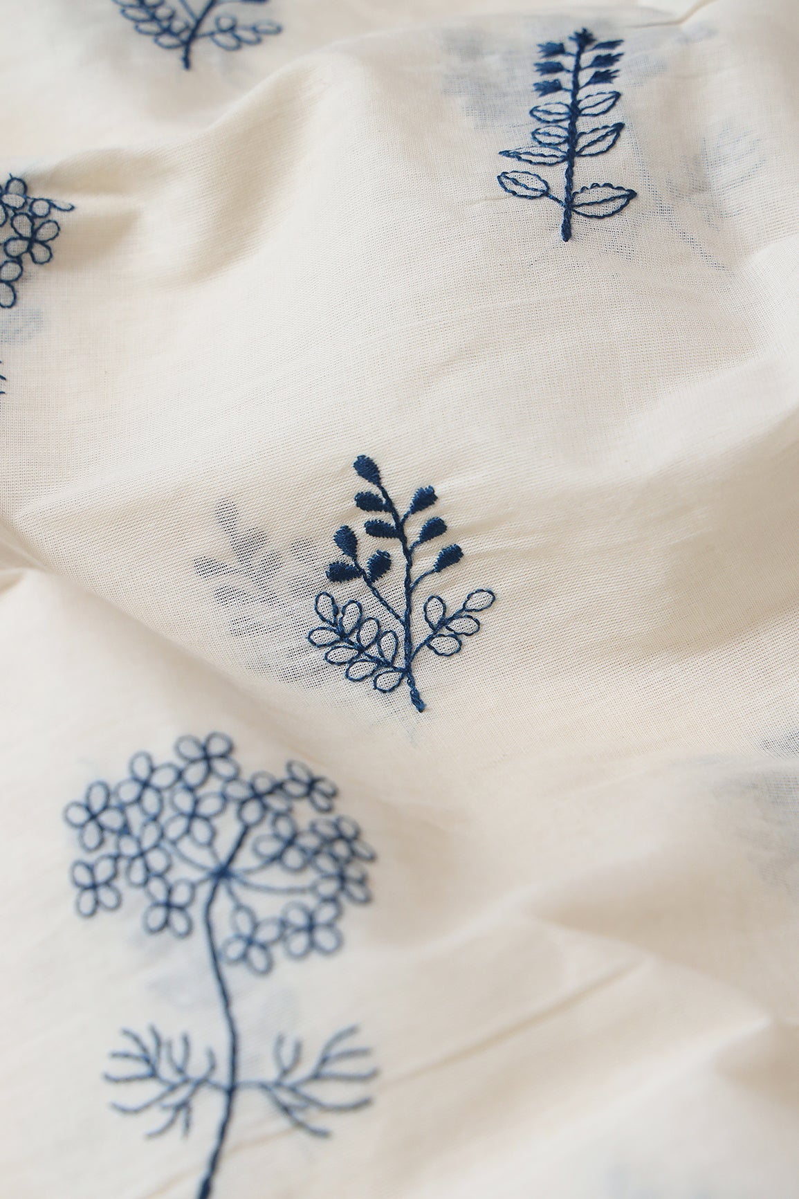 Navy Blue Thread beautiful Leafy Embroidery On Off White Organic Cotton Fabric
