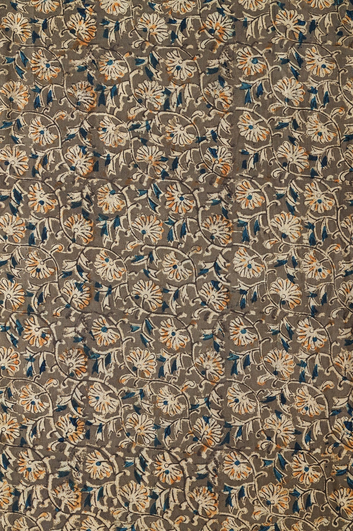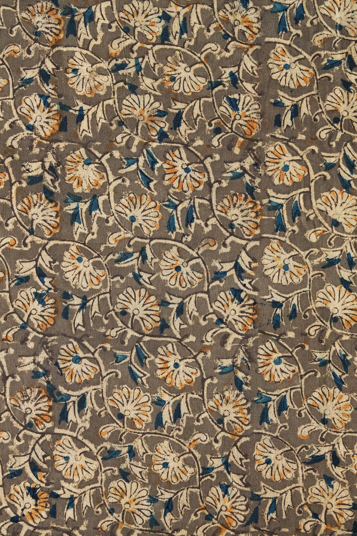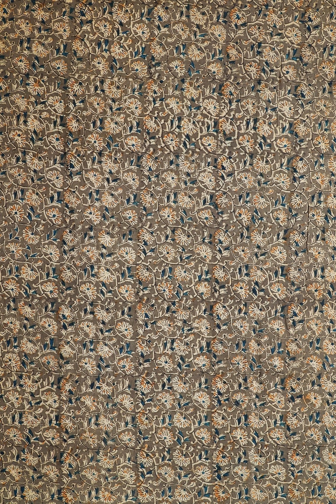 Olive And Light Beige Floral Pattern Handblock Kalamkari Organic Cotton Fabric