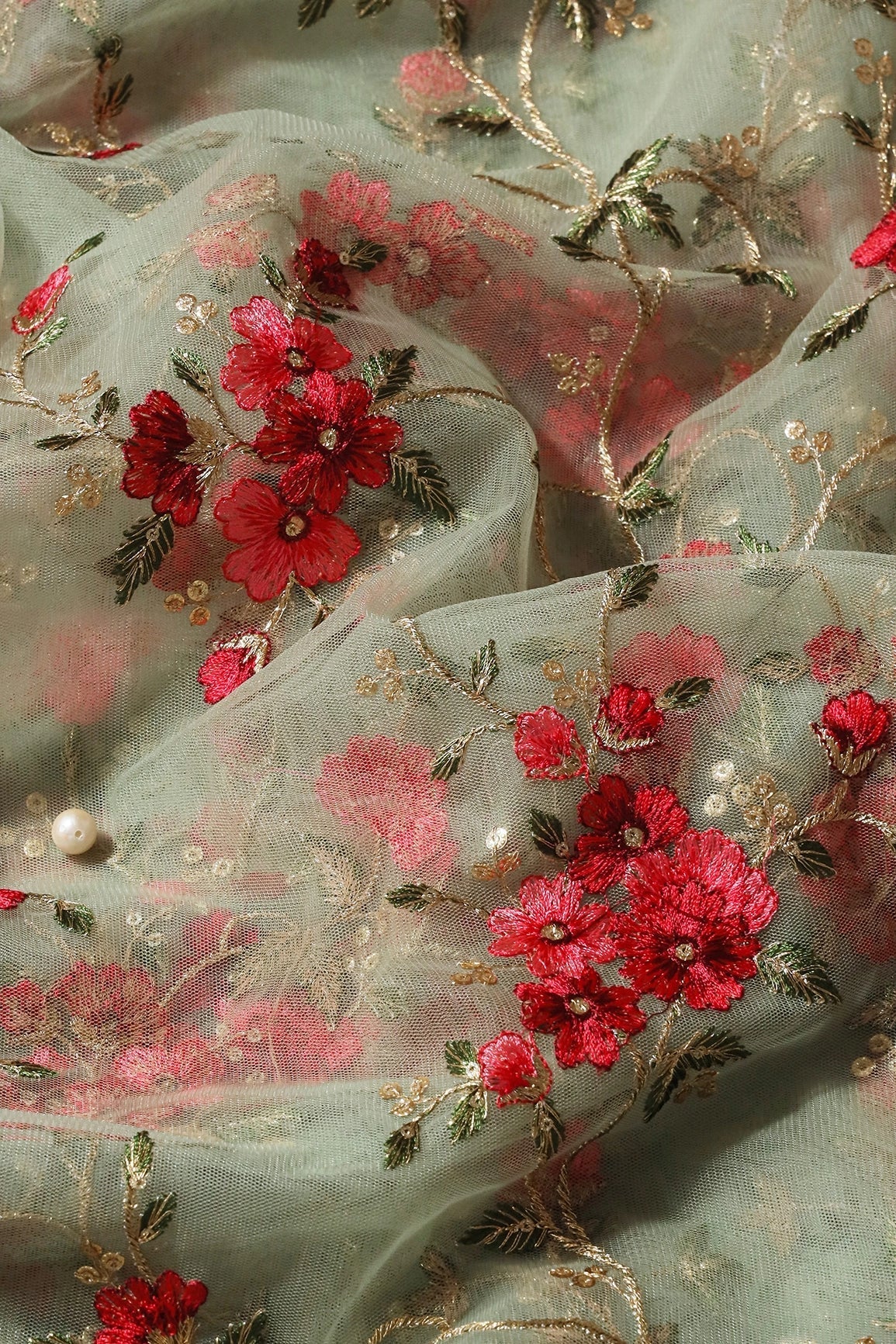 Fabric 1/ Saree : Red And Olive Thread With Gold Zari Beautiful Floral Embroidery On Olive Soft Net Fabric