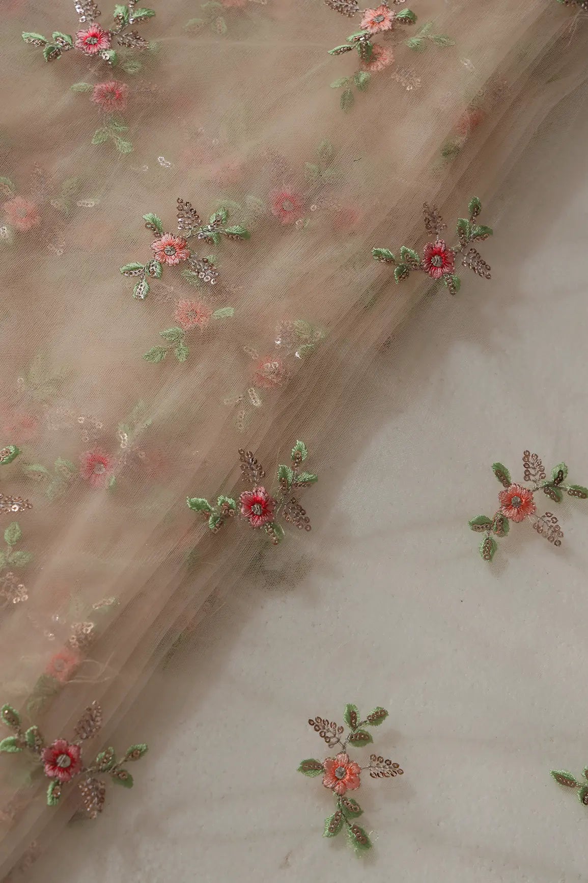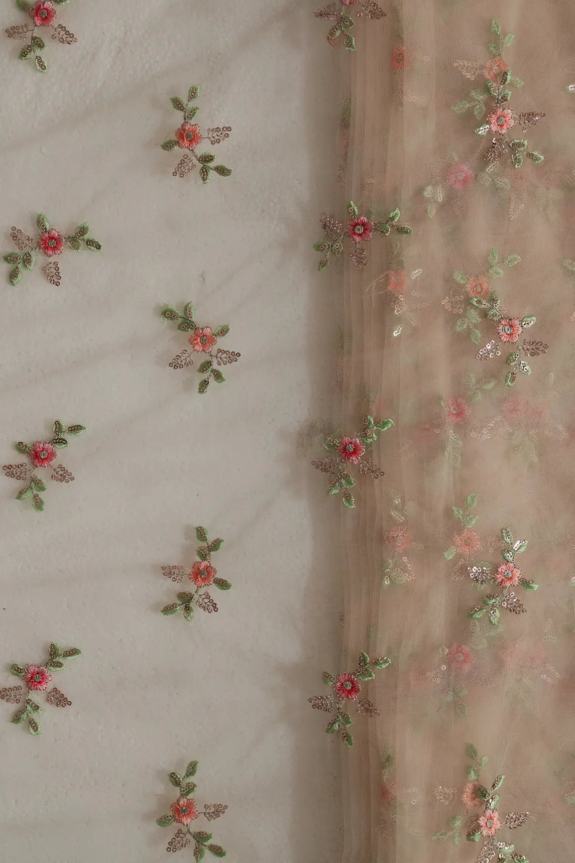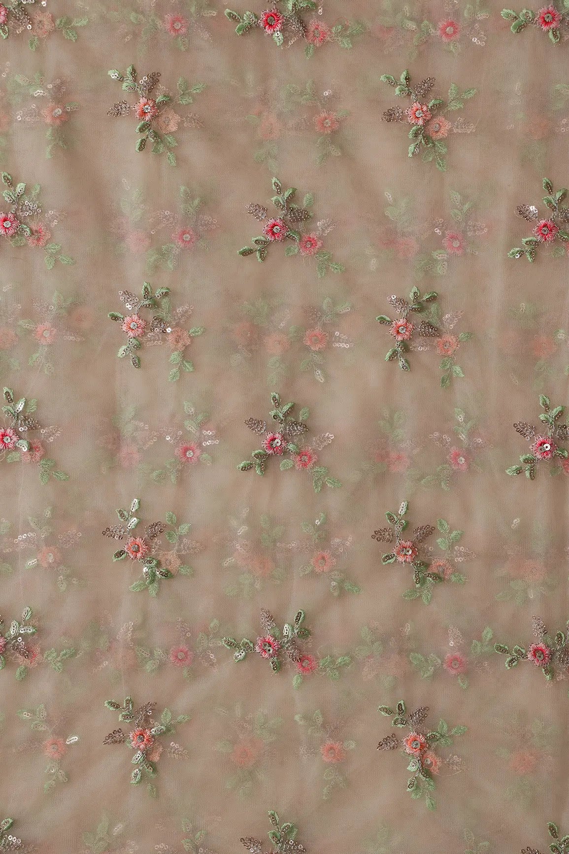 Olive And Pink Thread With Gold Sequins Floral Butta Embroidery On Light Beige Soft Net Fabric