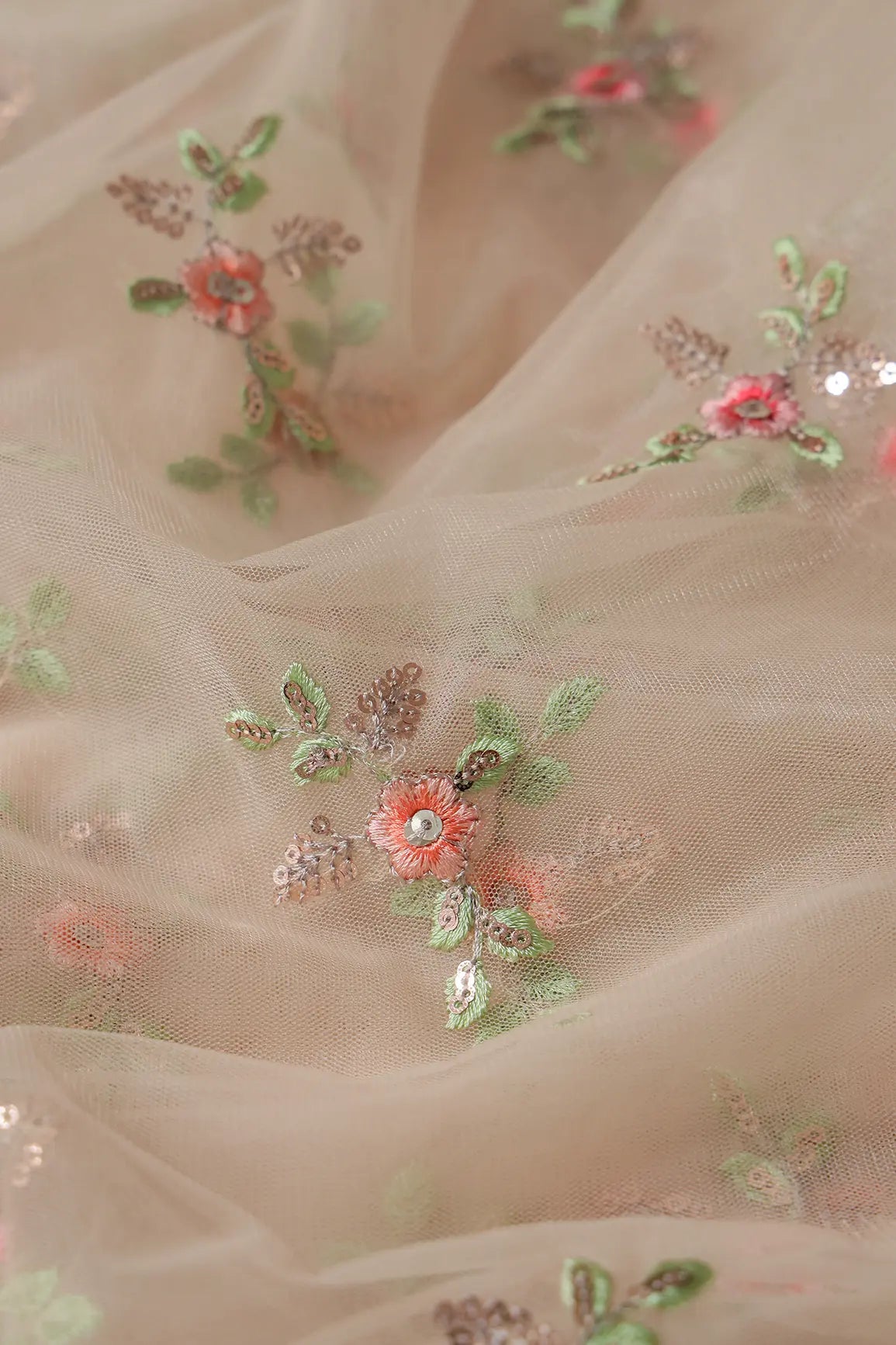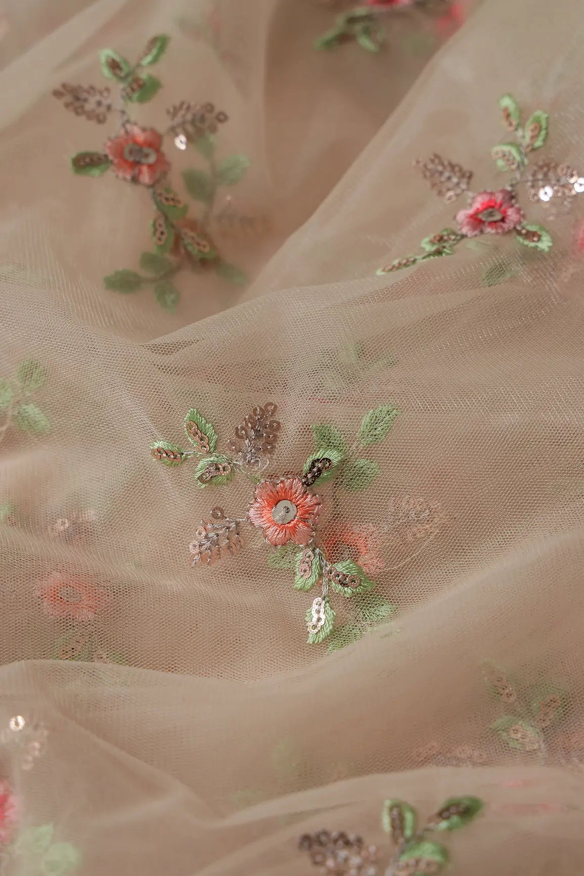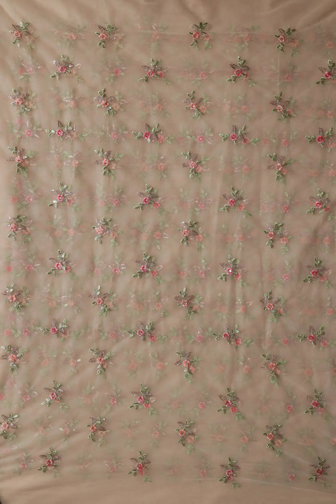 Olive And Pink Thread With Gold Sequins Floral Butta Embroidery On Light Beige Soft Net Fabric
