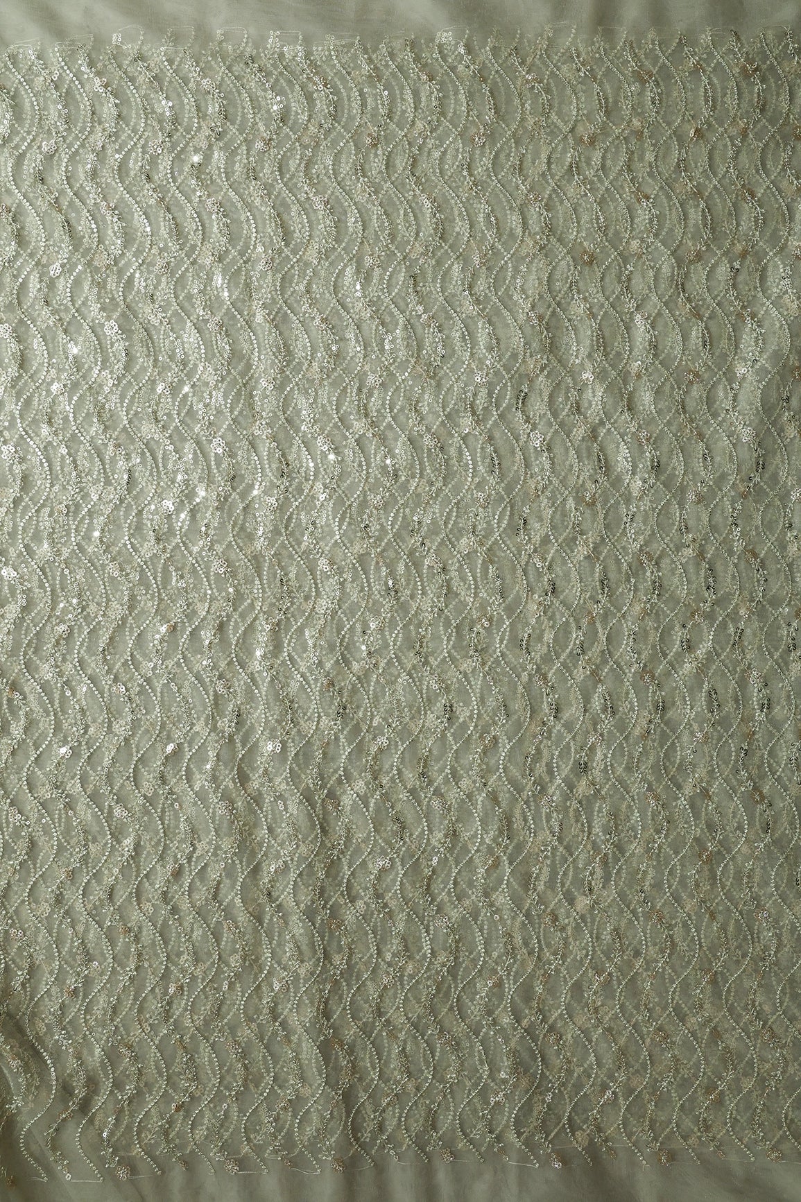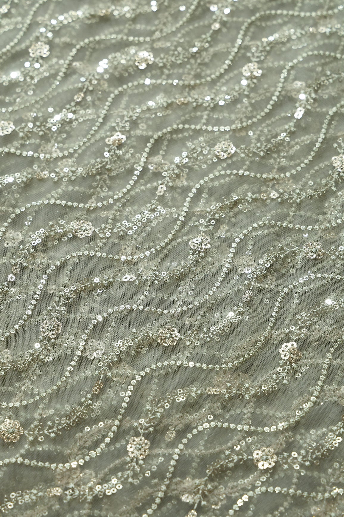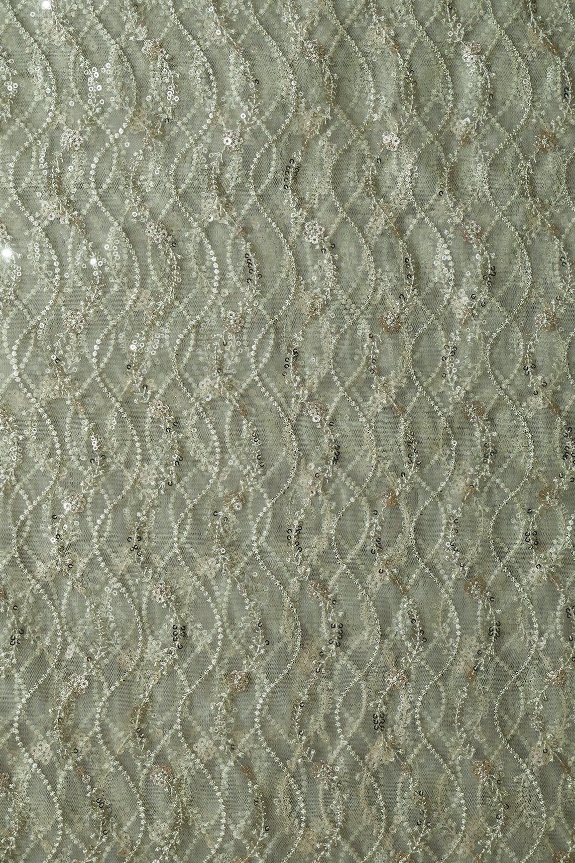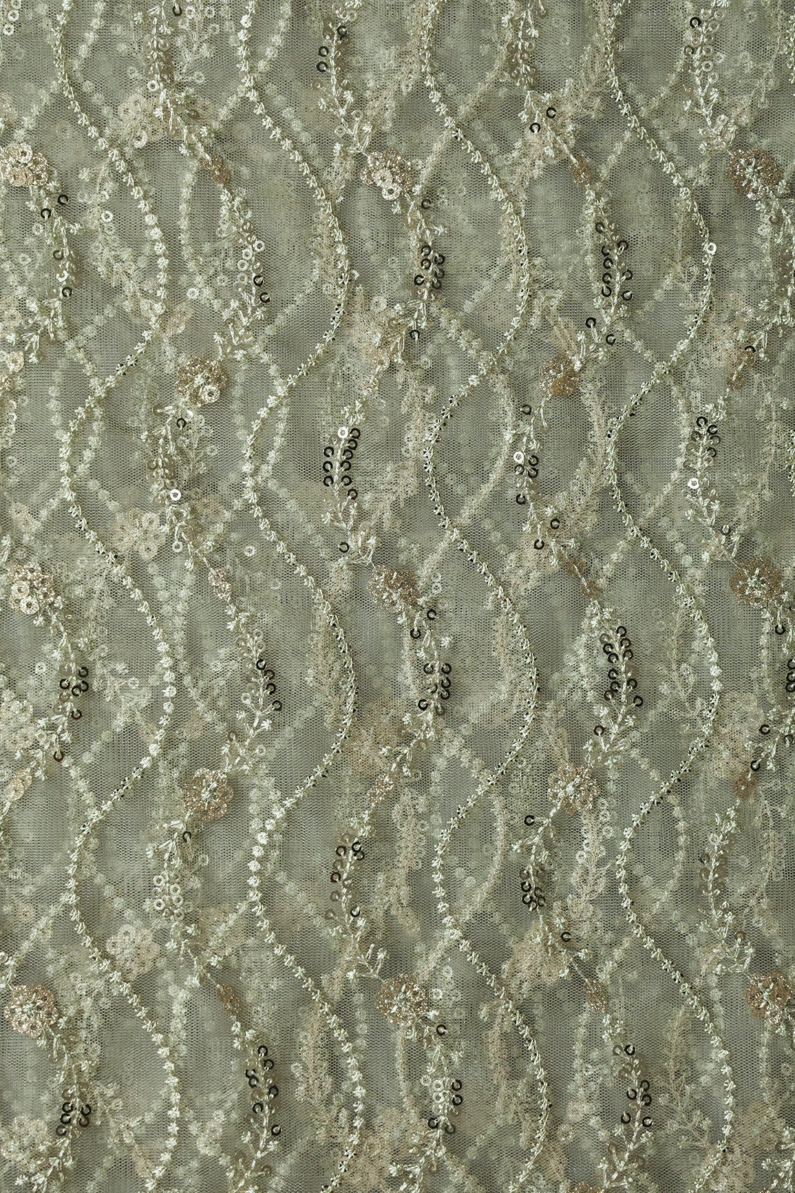 Olive Thread With Gold Sequins Wavy Embroidery On Olive Soft Net Fabric