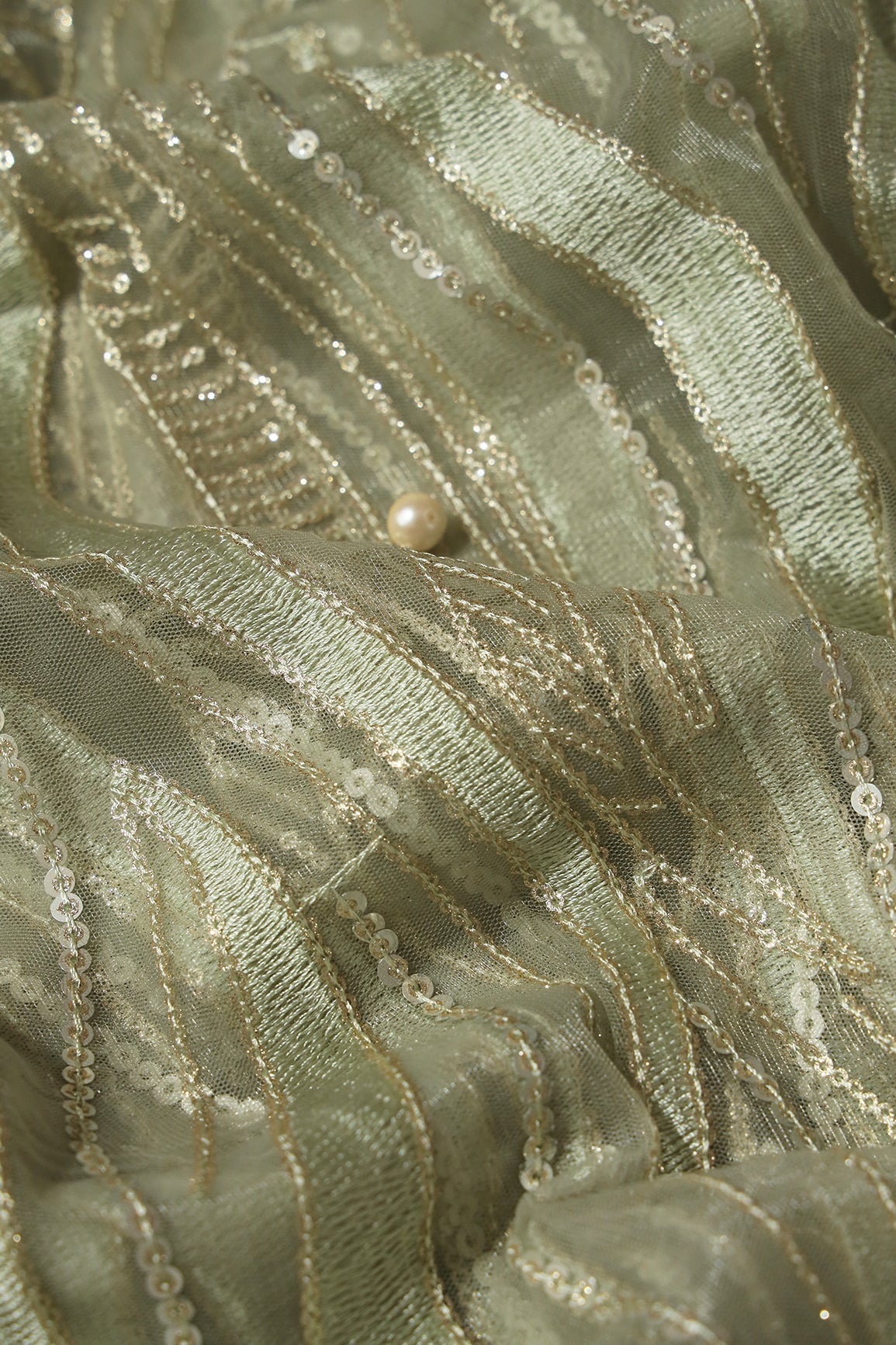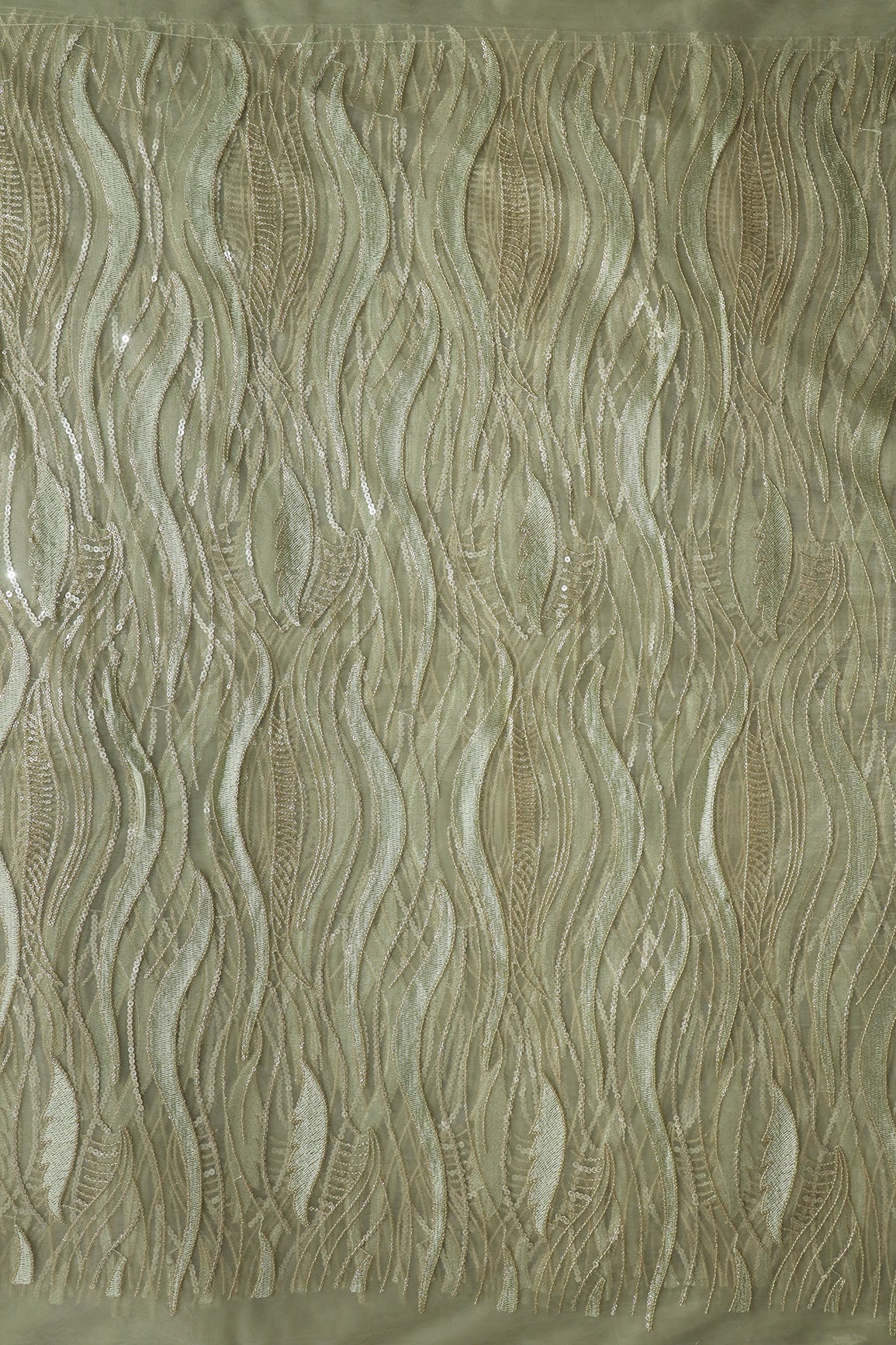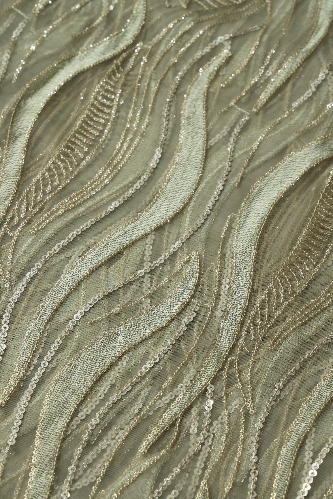 Olive Thread With Sequins Wavy Embroidery Work On Olive Soft Net Fabric