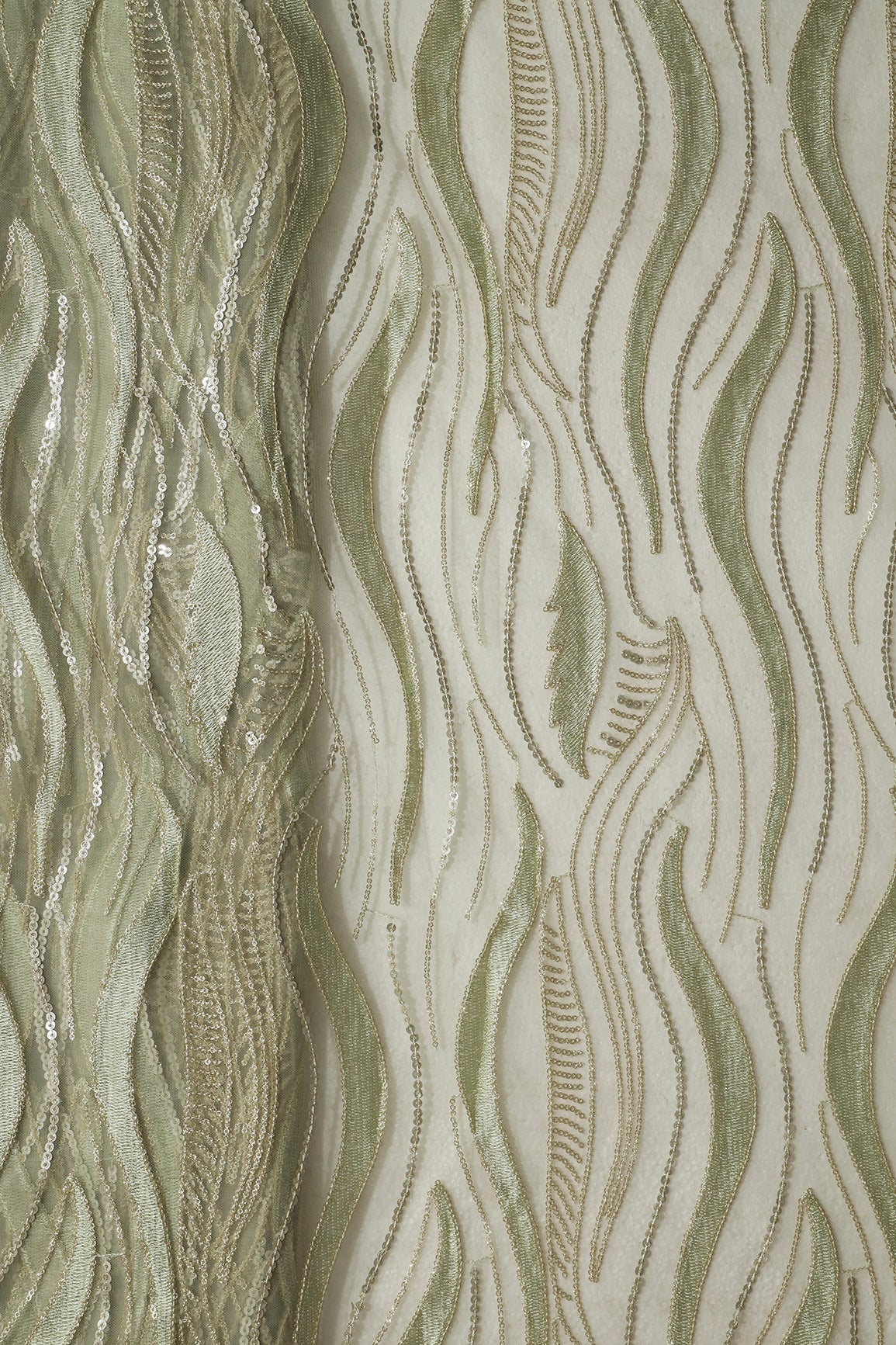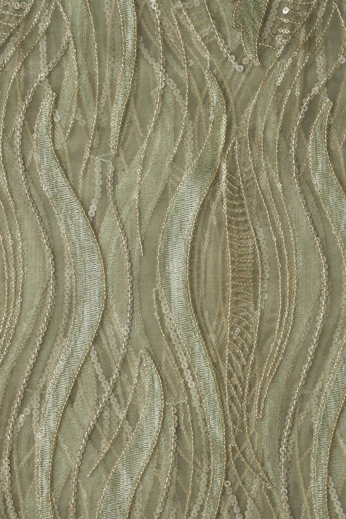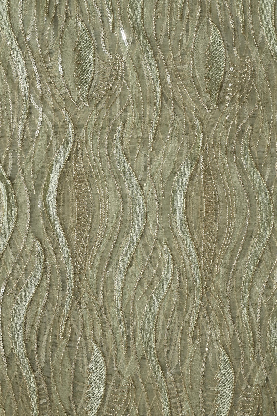Olive Thread With Sequins Wavy Embroidery Work On Olive Soft Net Fabric