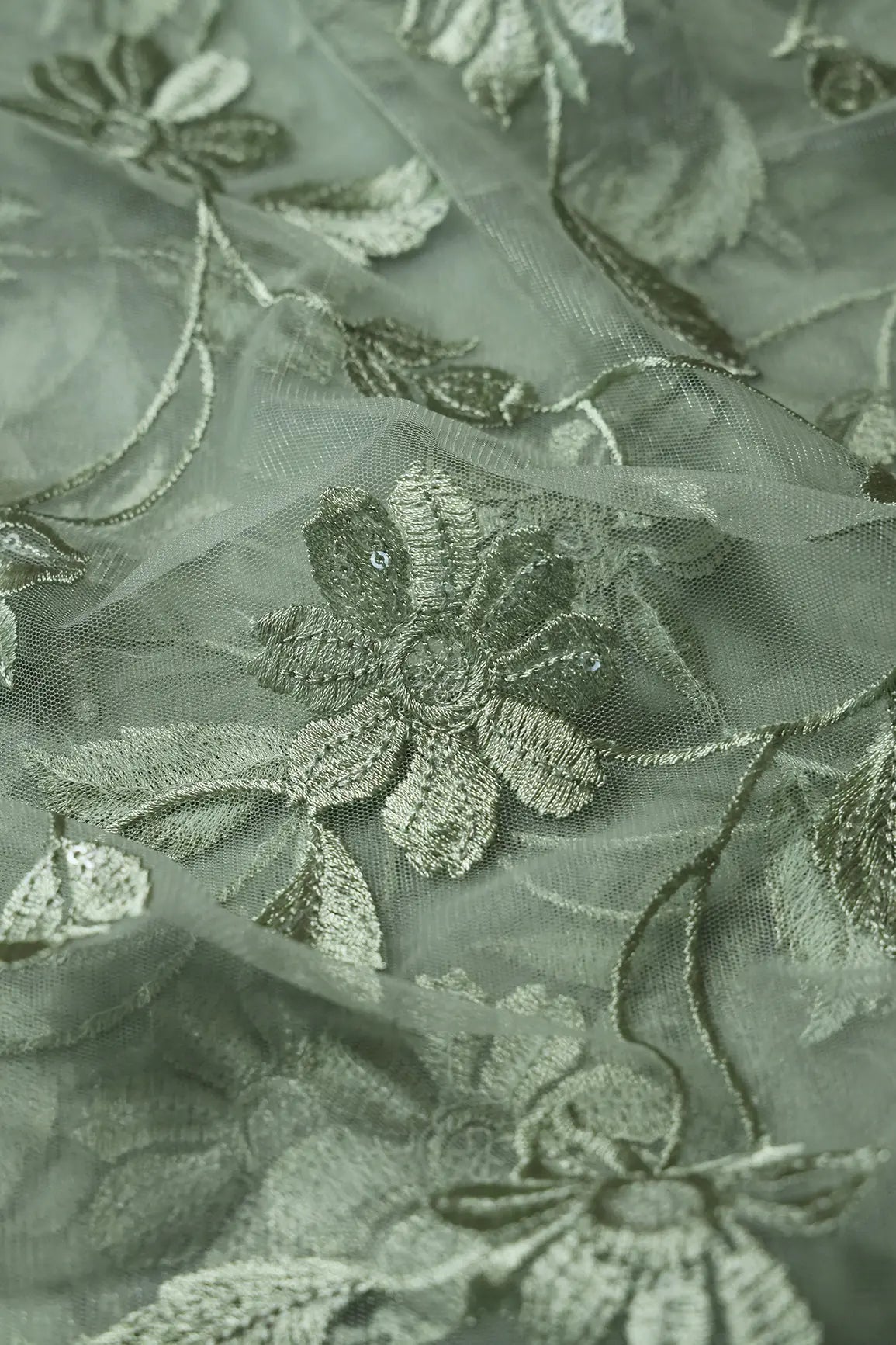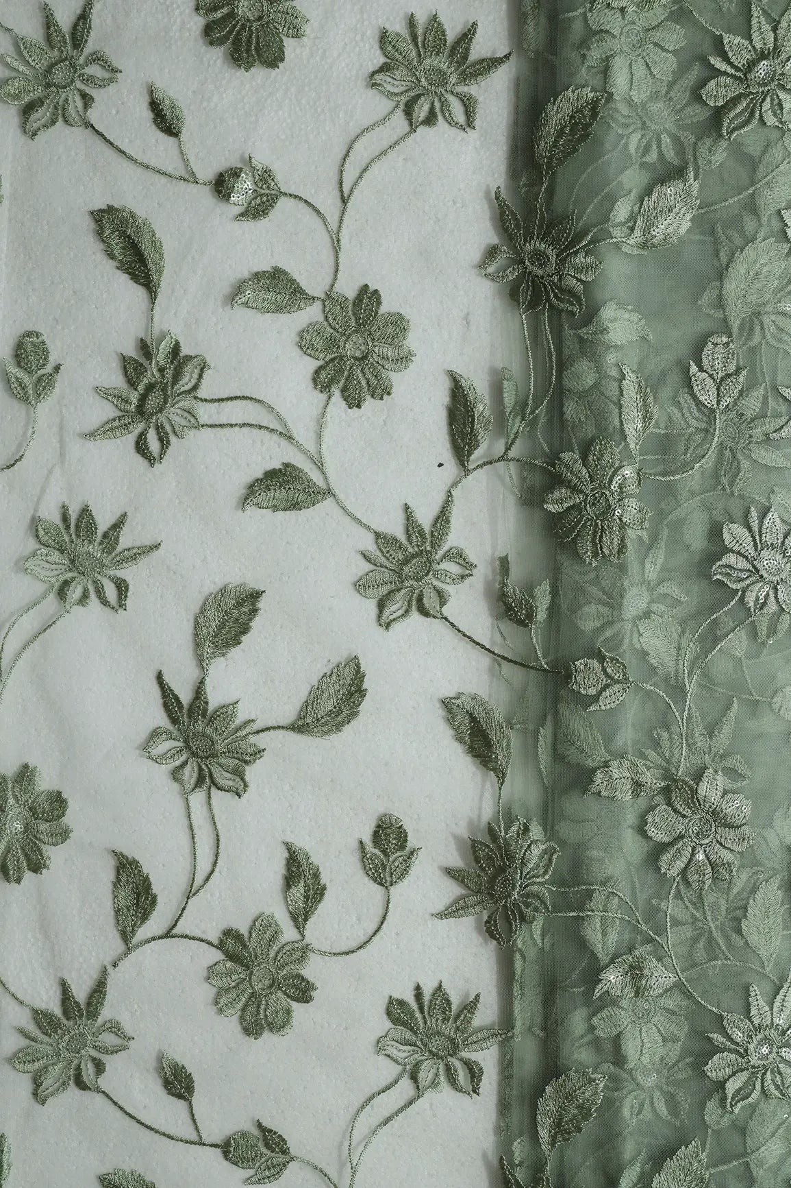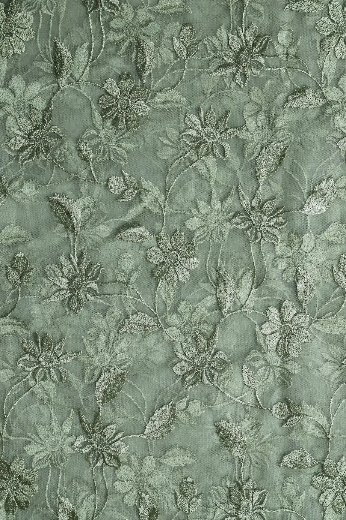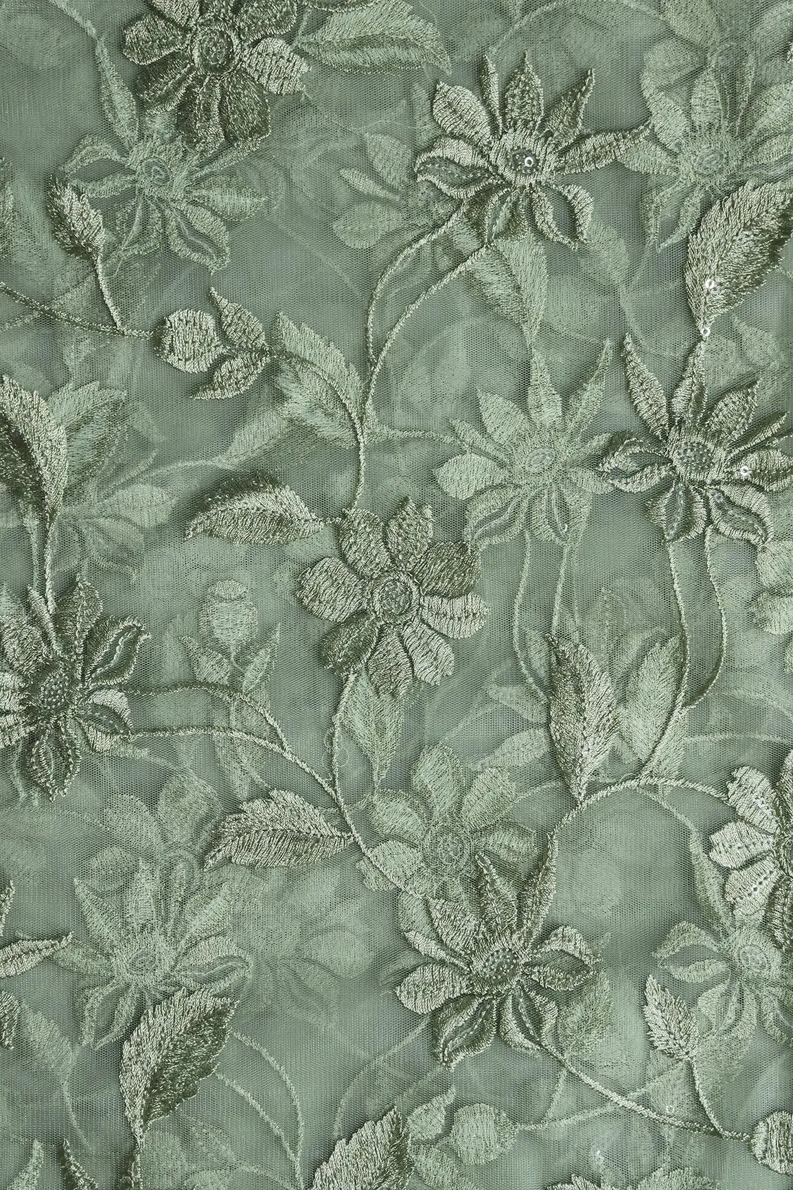 Olive Thread With Water Sequins Floral Embroidery On Olive Soft Net Fabric