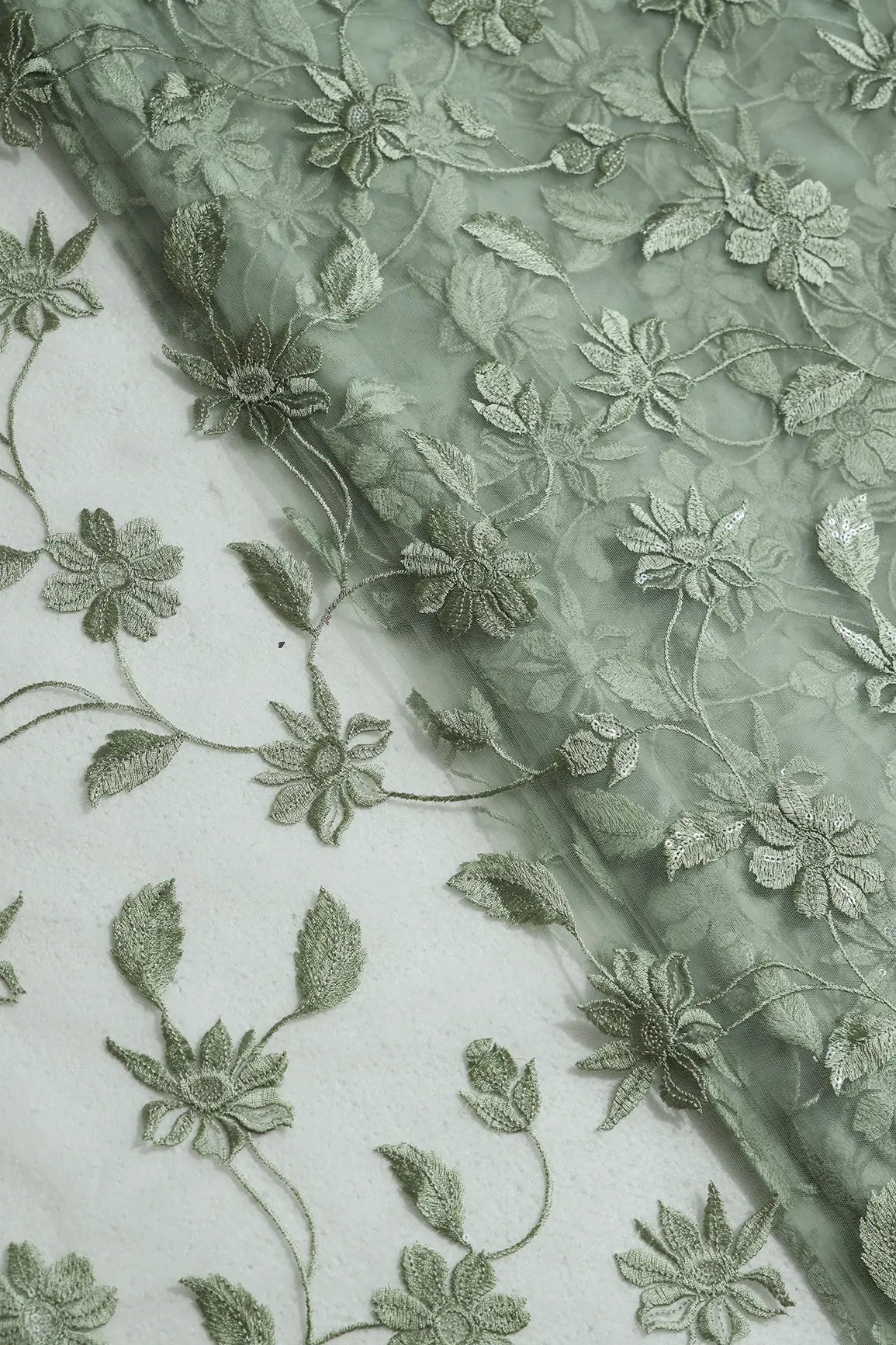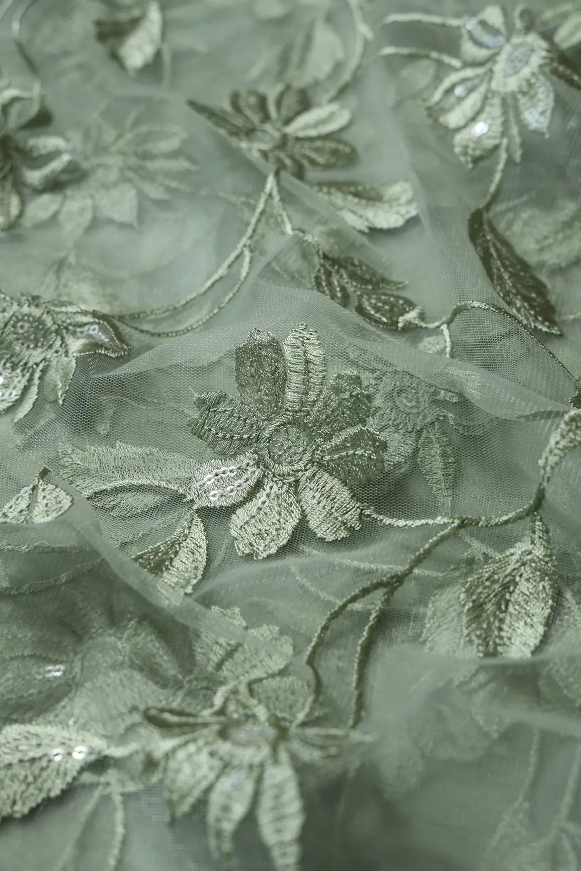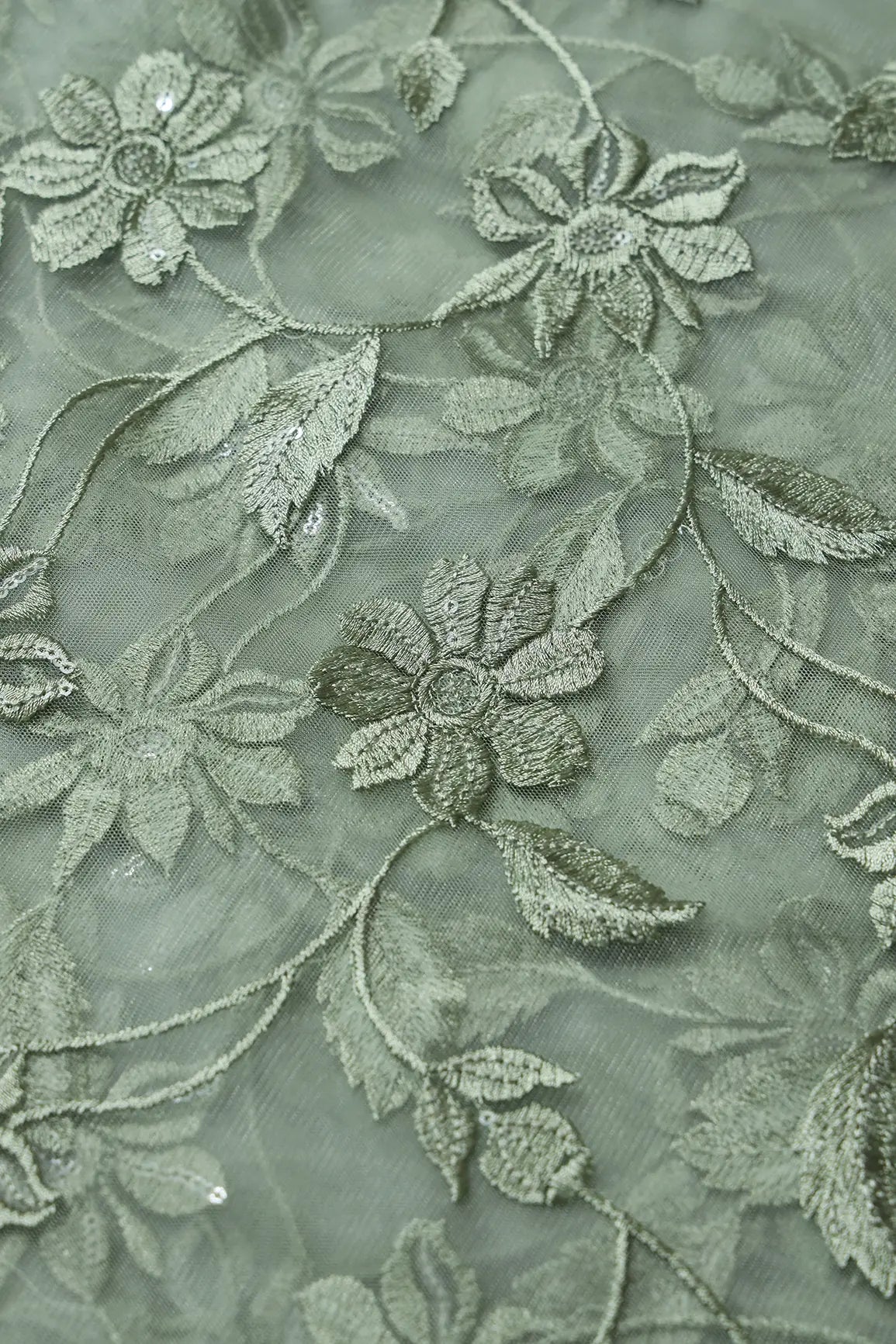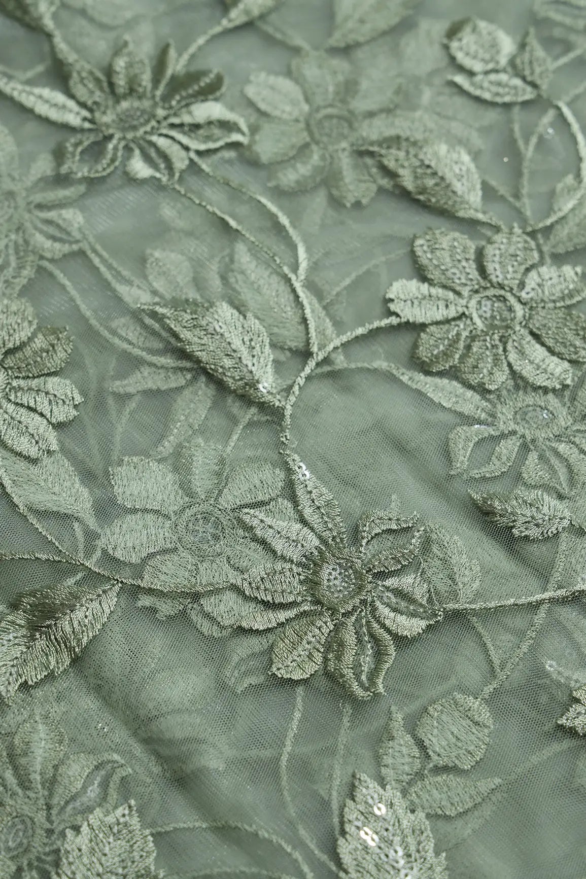 Olive Thread With Water Sequins Floral Embroidery On Olive Soft Net Fabric