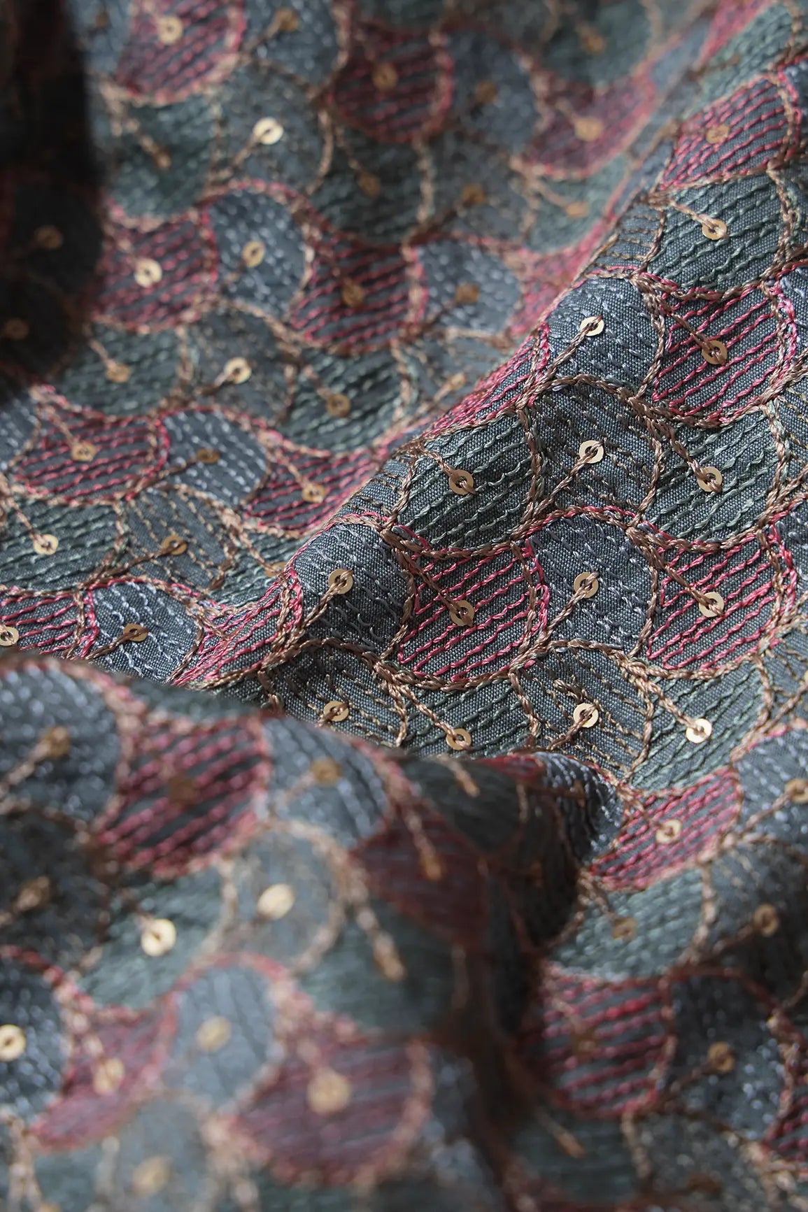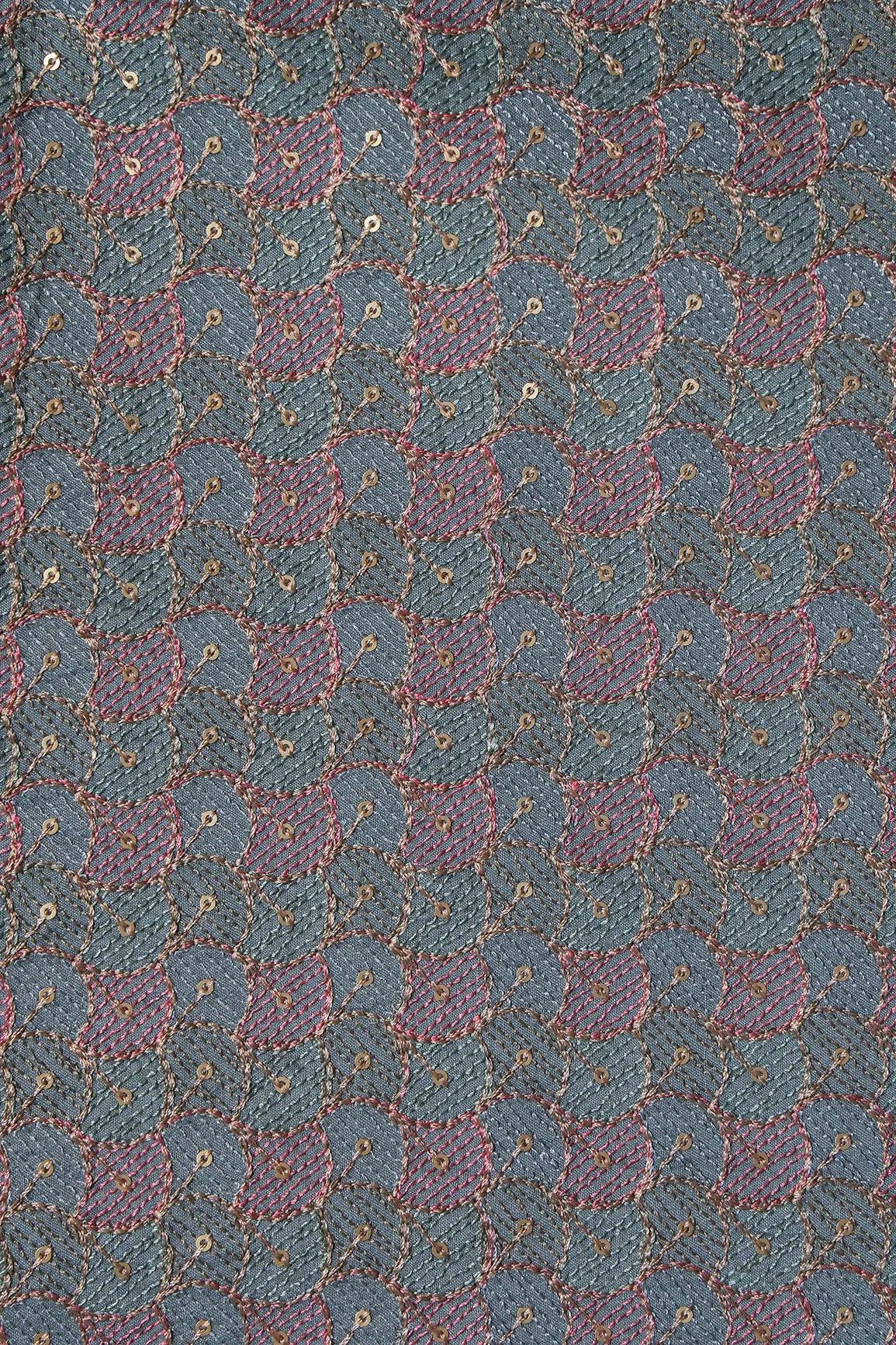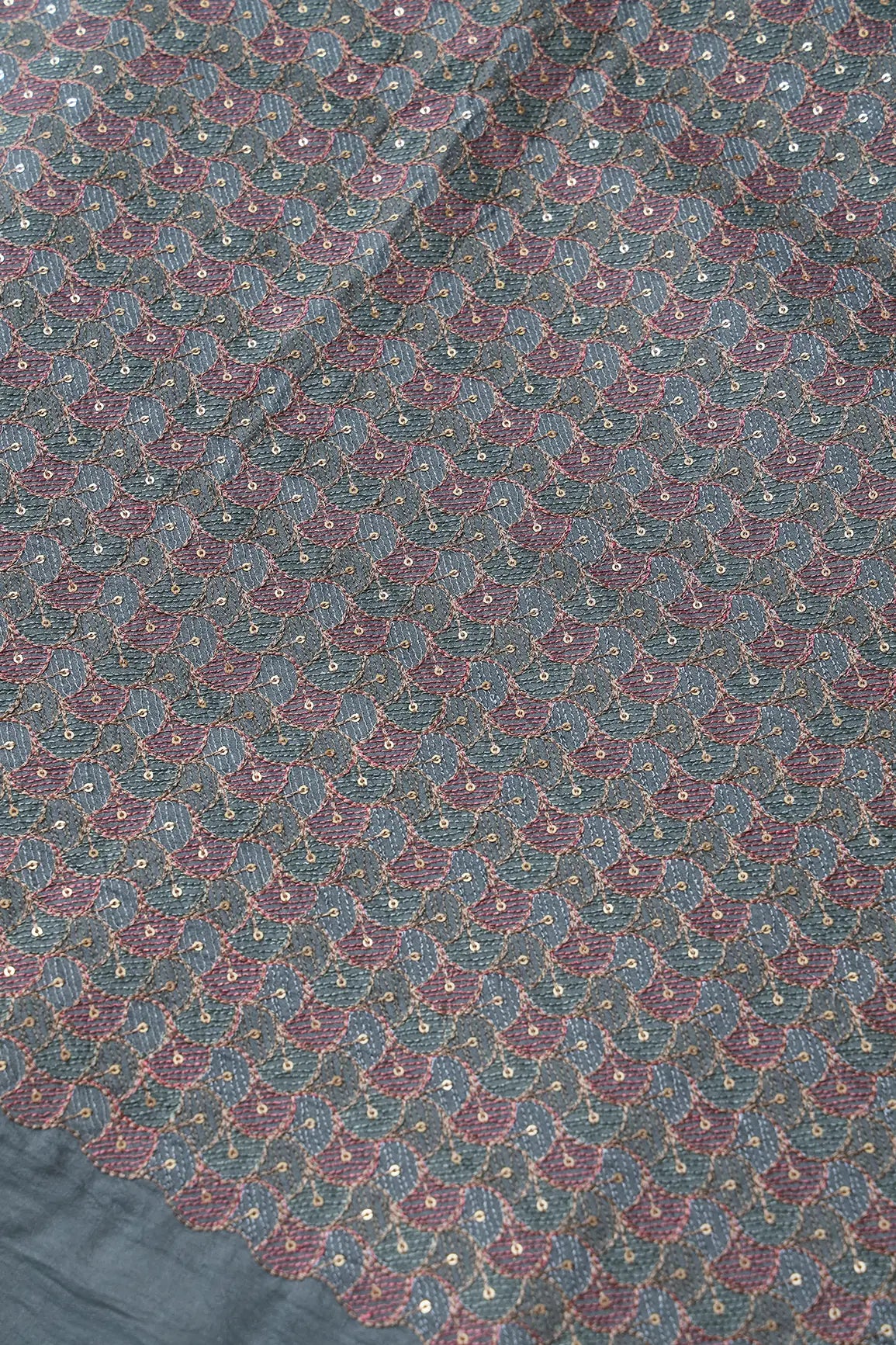 Pastel Thread With Gold Sequins Ogee Embroidery Work On Grey Raw Silk Fabric