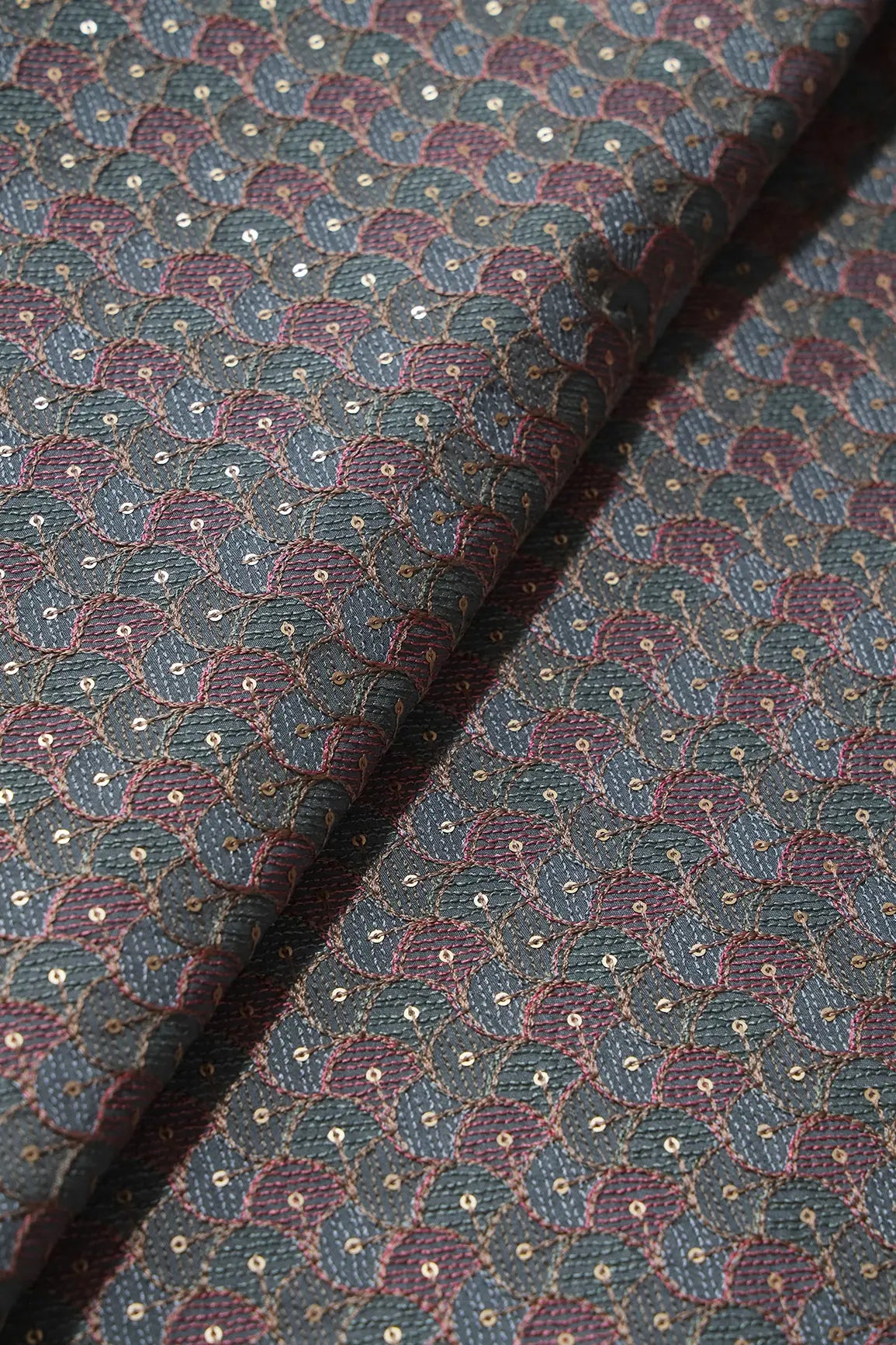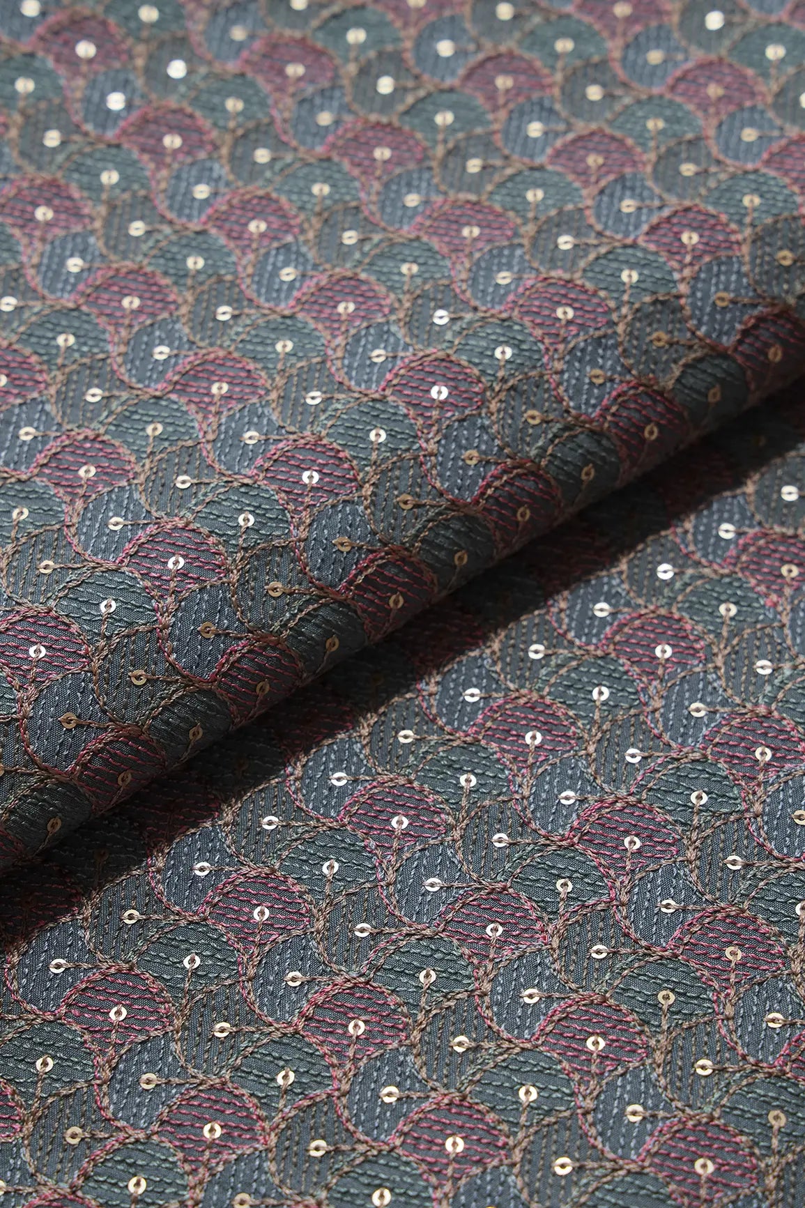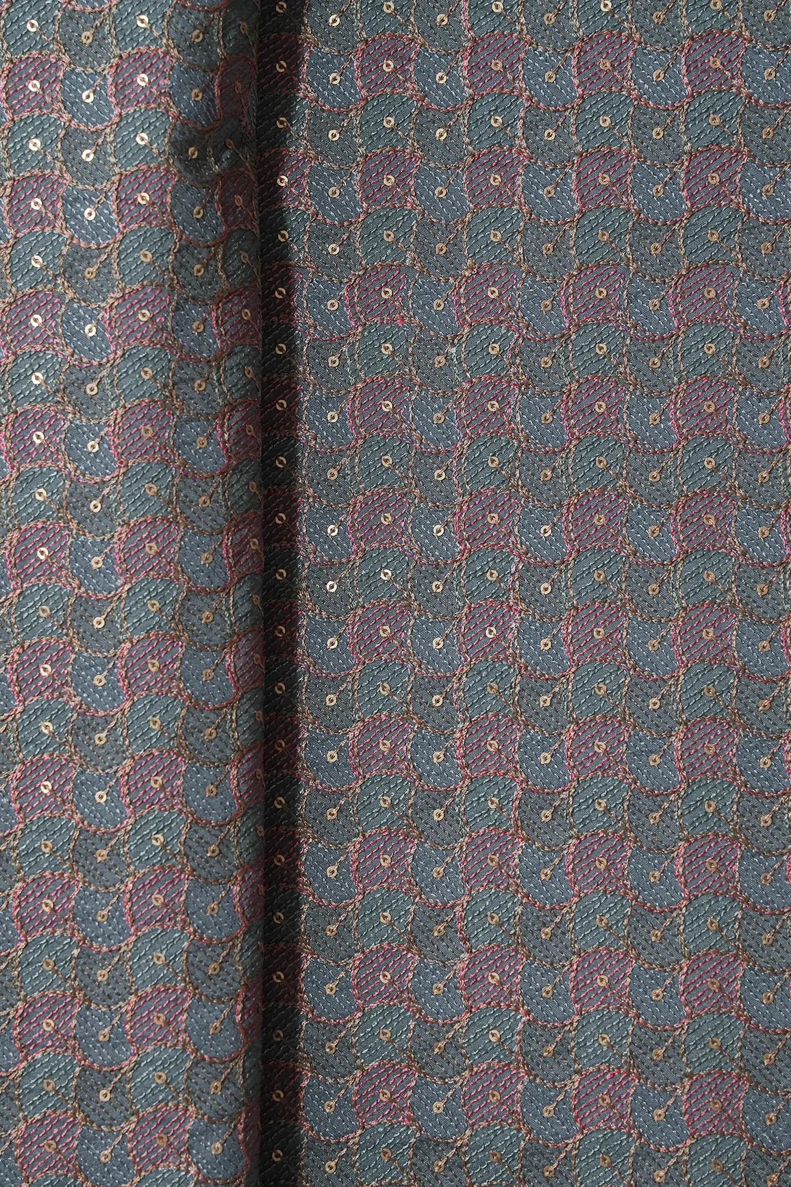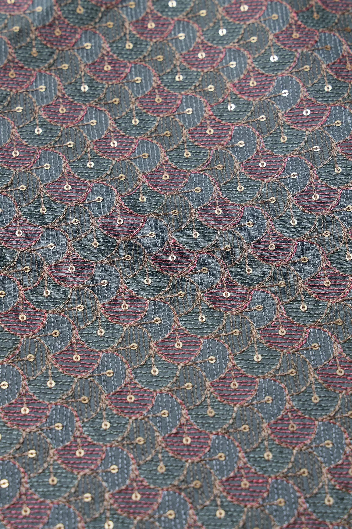 Pastel Thread With Gold Sequins Ogee Embroidery Work On Grey Raw Silk Fabric