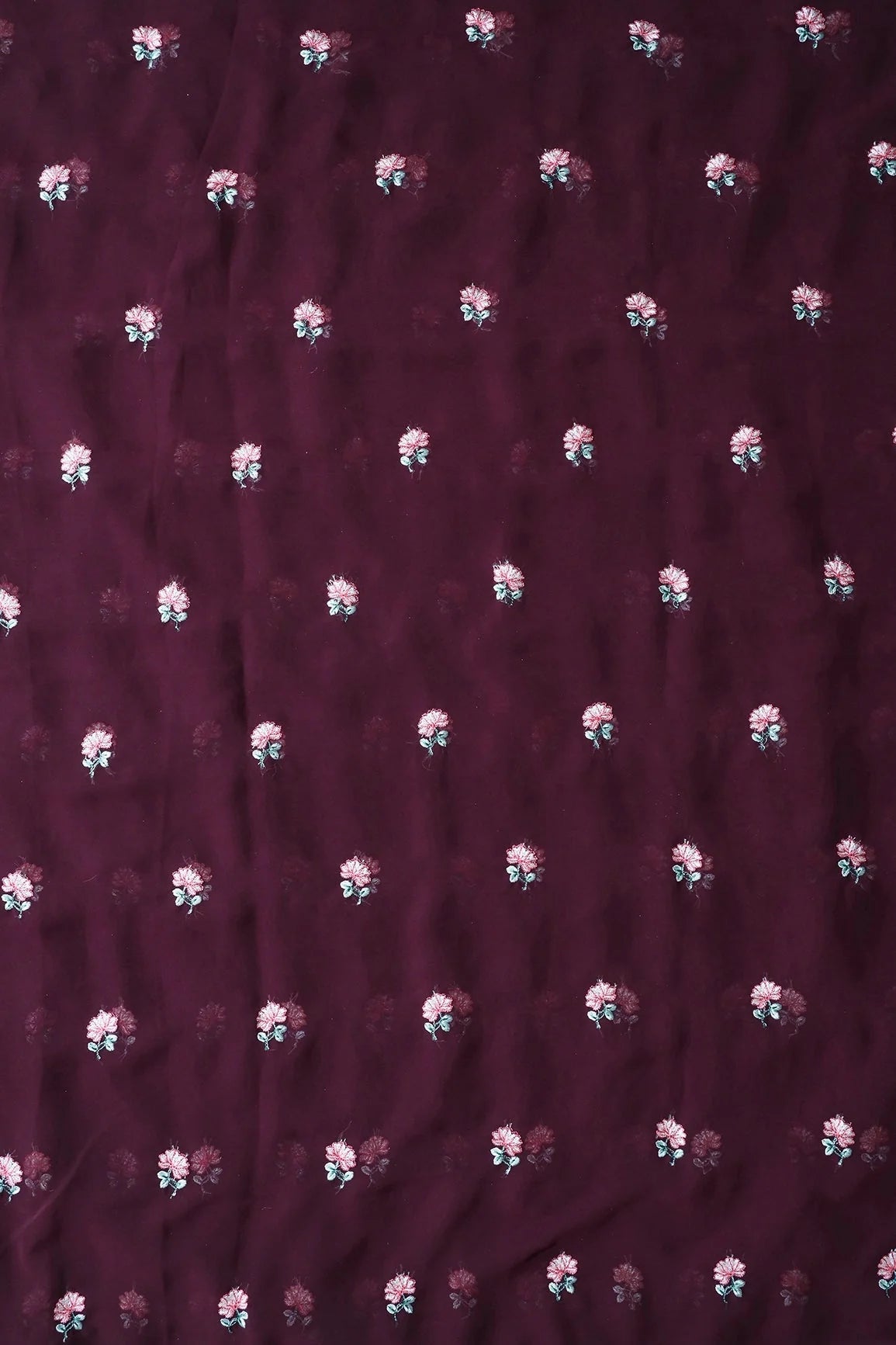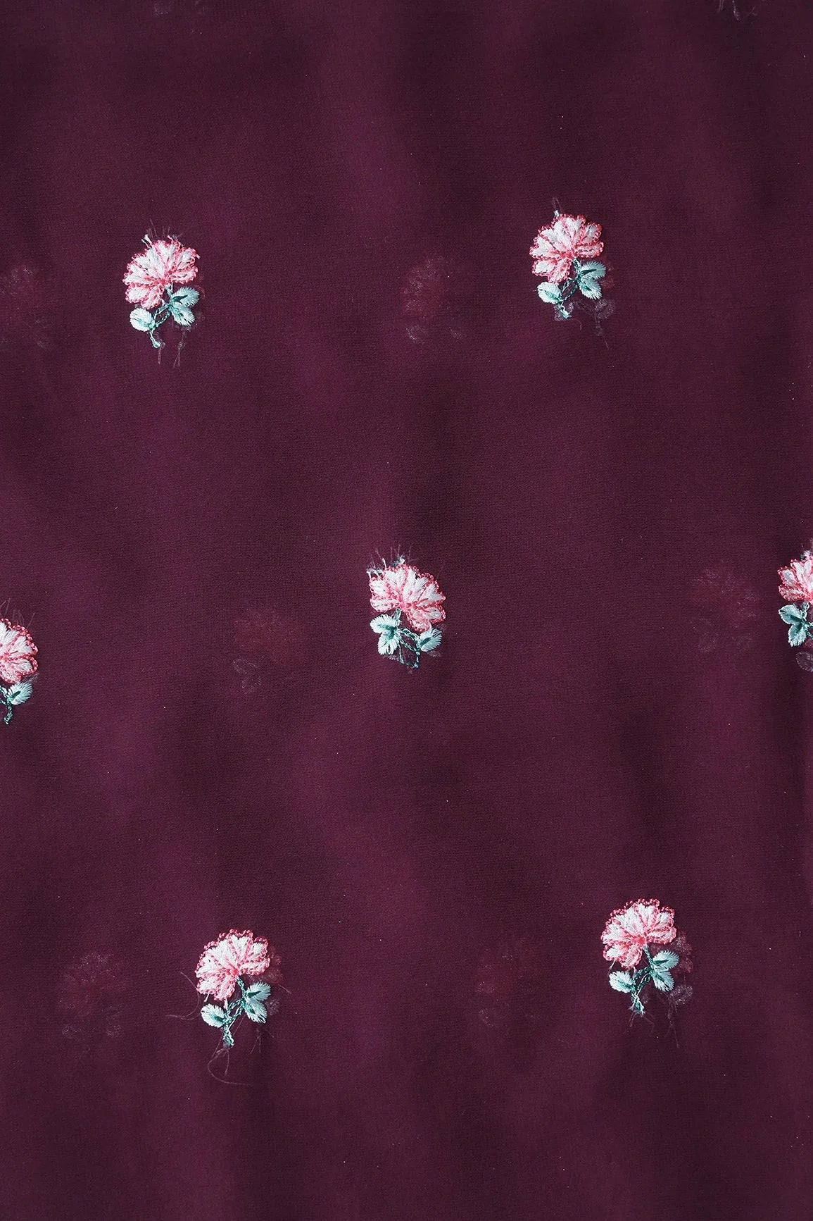 Peach And Green Small Floral Booti Embroidery On Wine Georgette Fabric