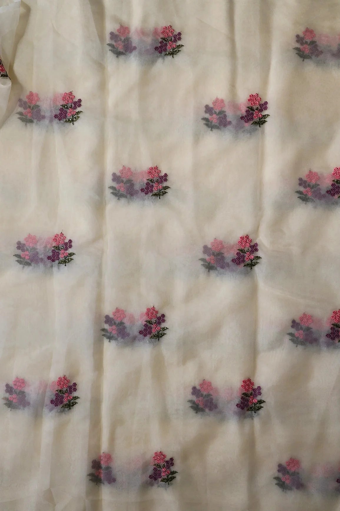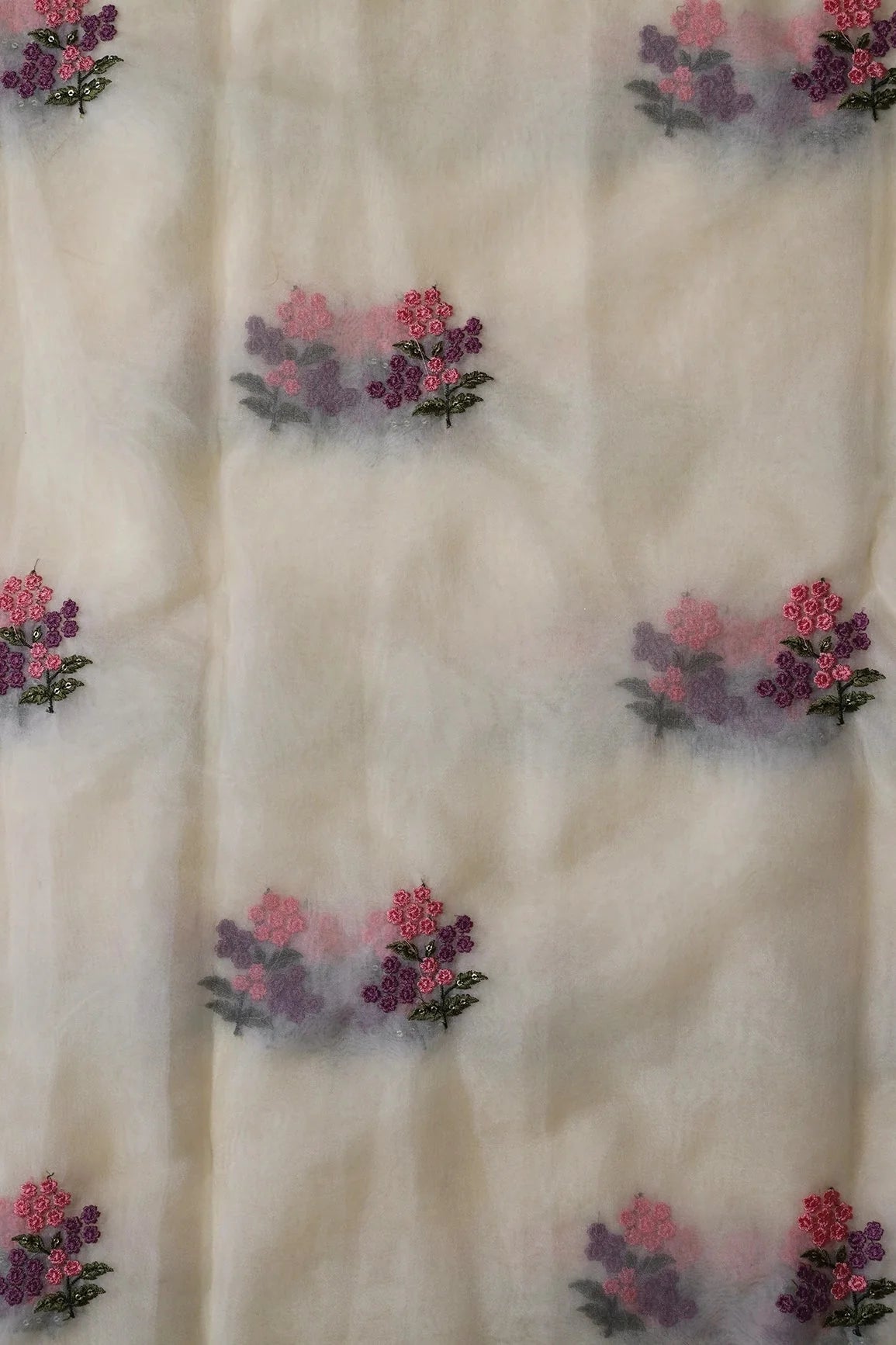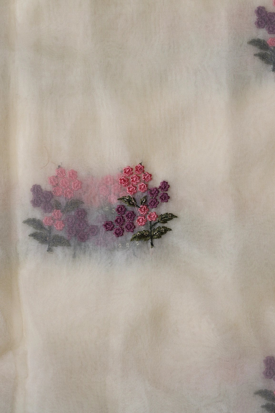 Pink And Mauve Thread With Sequins Floral Embroidery Work On Cream Organza Fabric