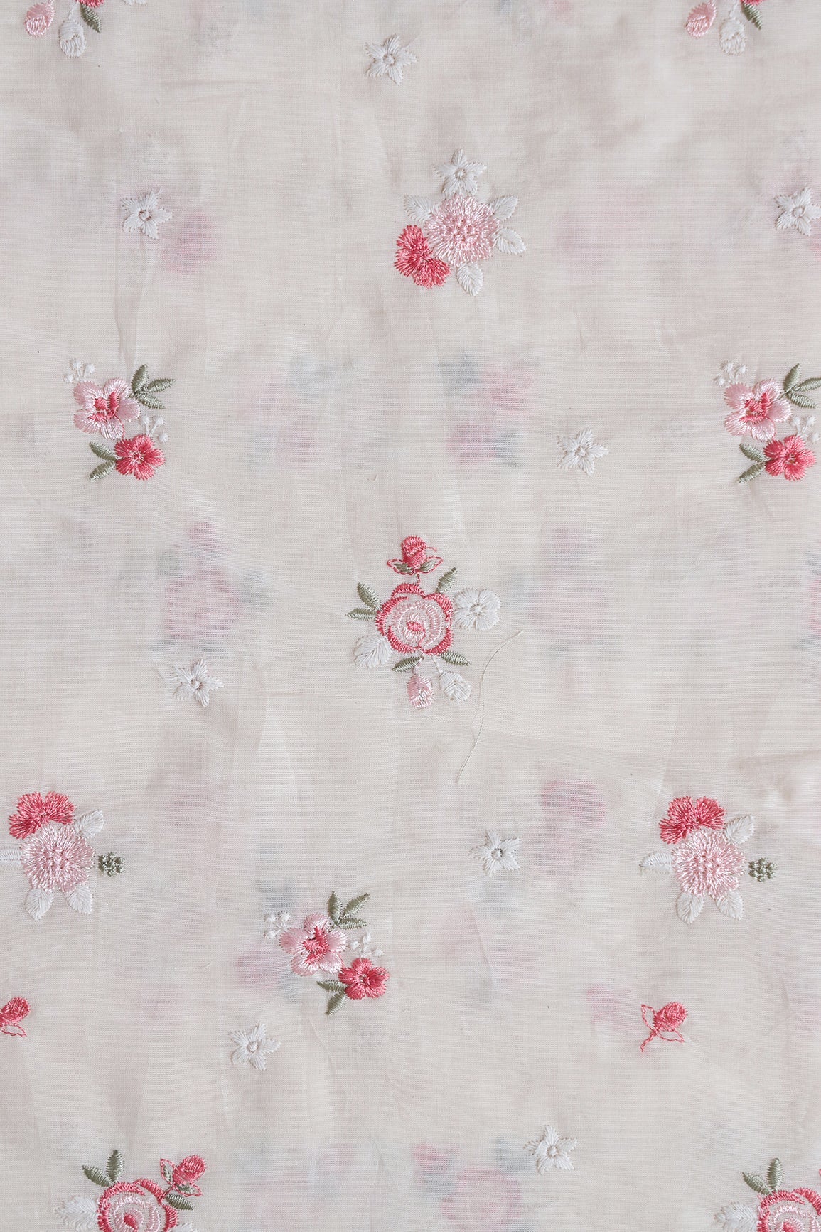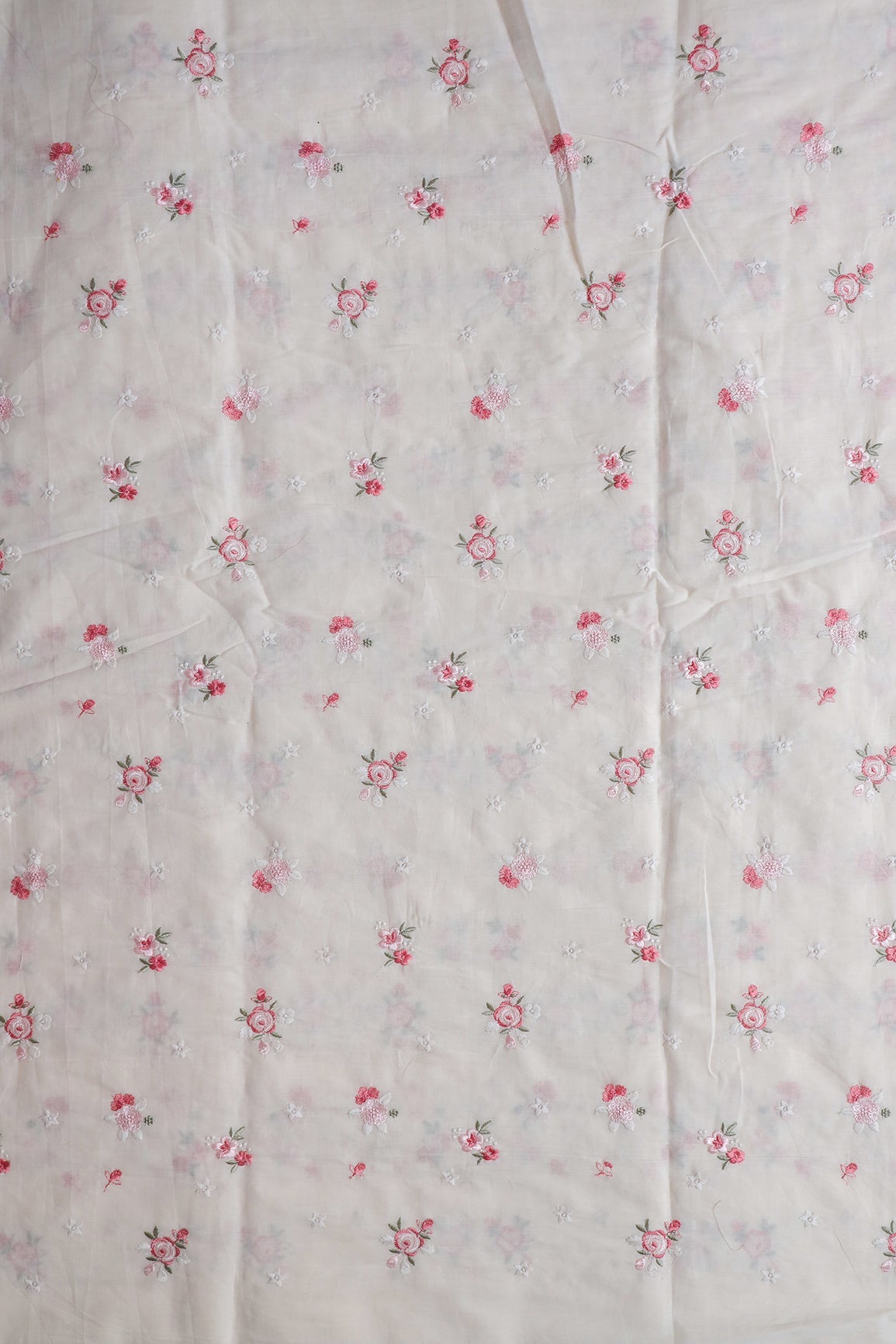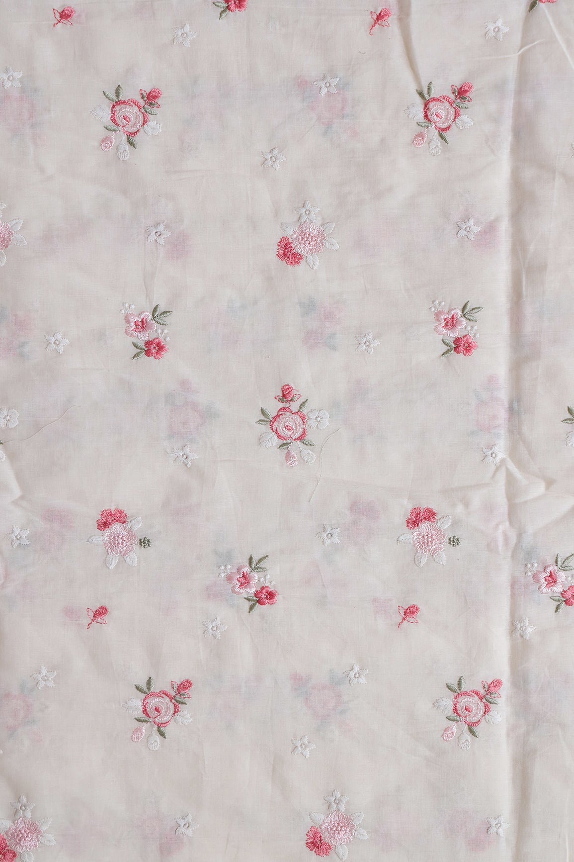 Pink And Olive Thread Small Floral Embroidery On Off White Organic Cotton Fabric