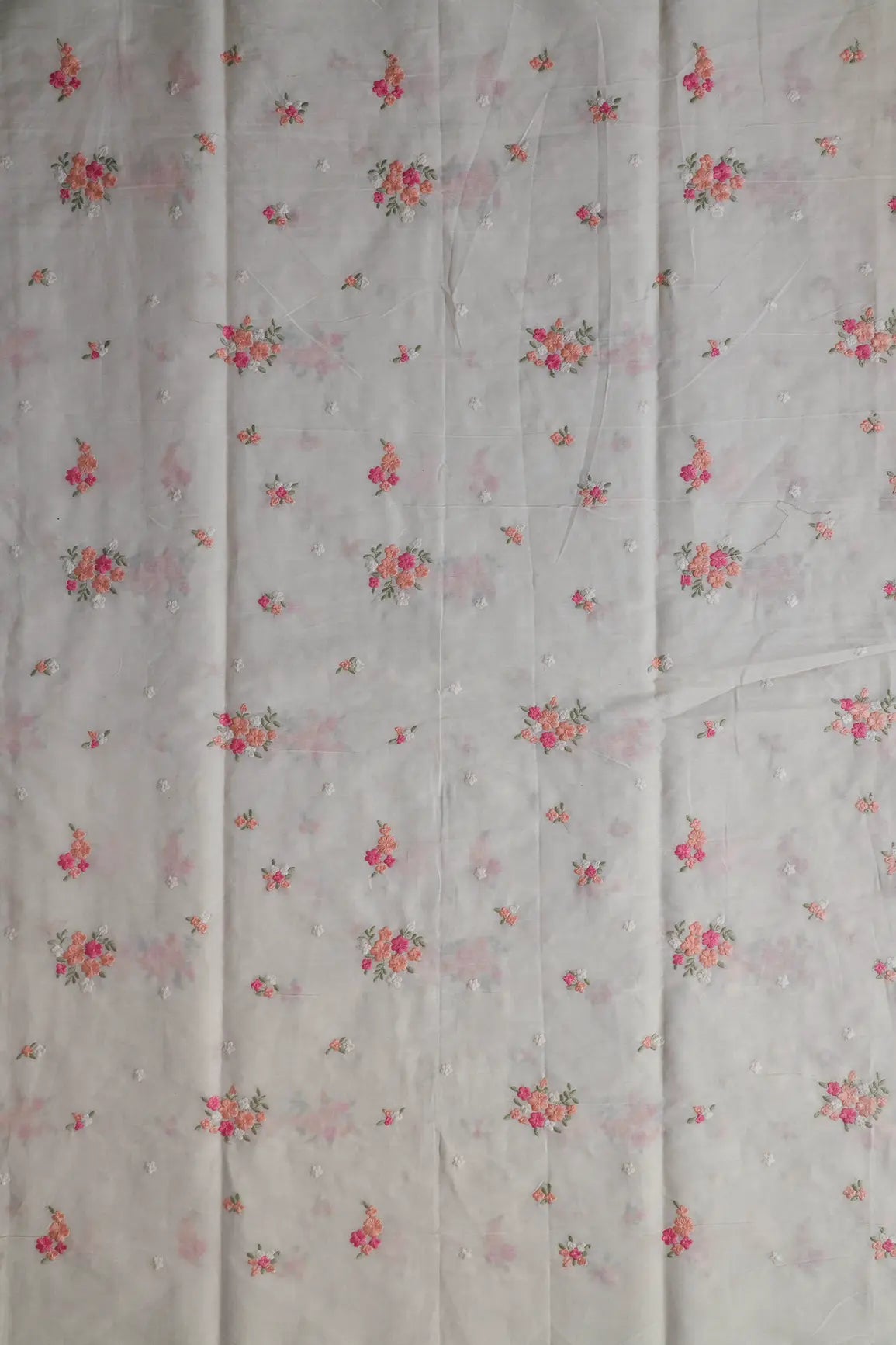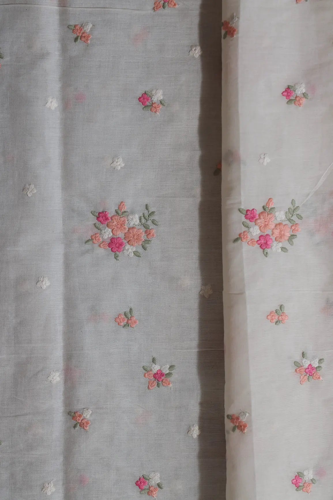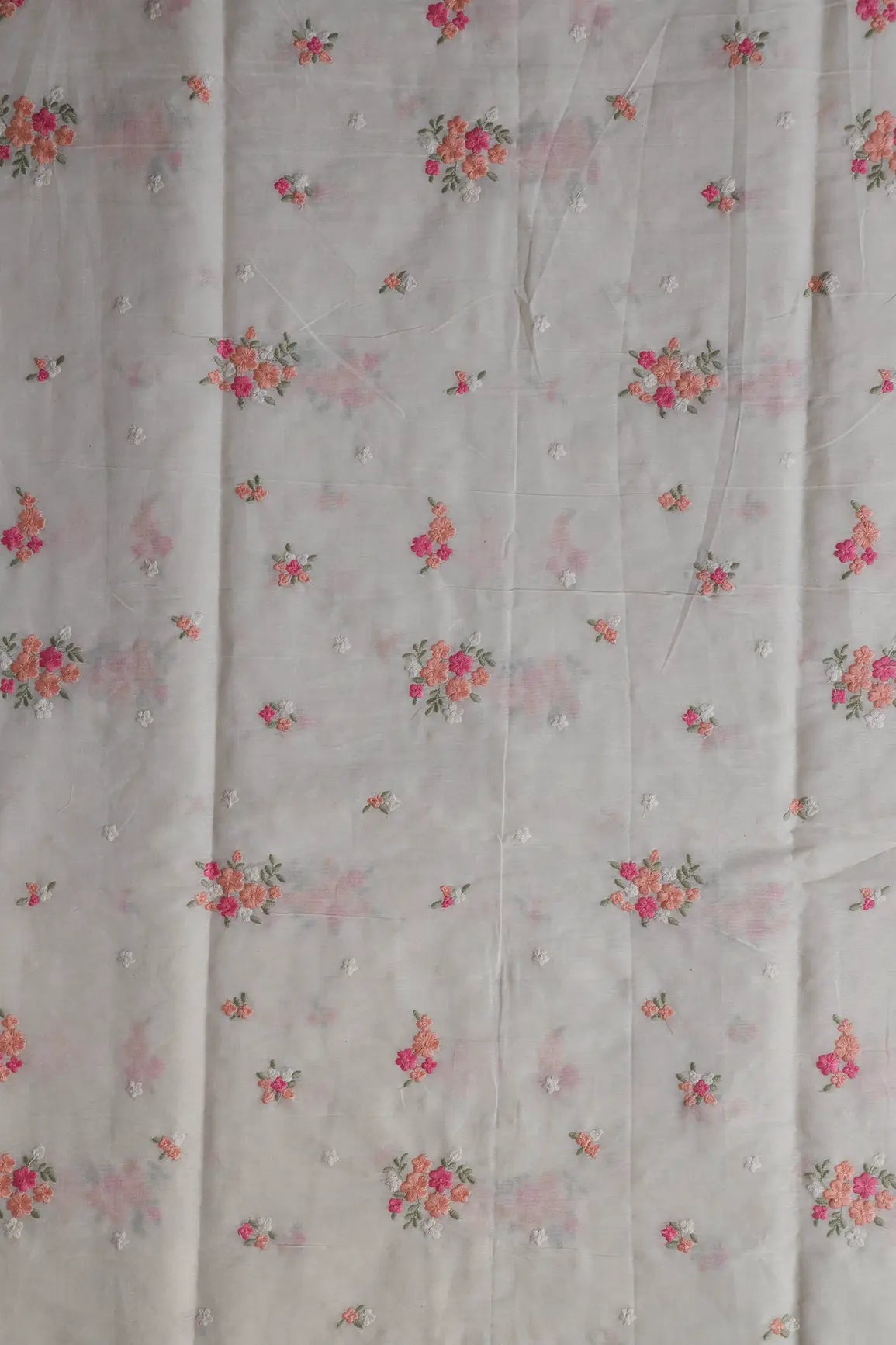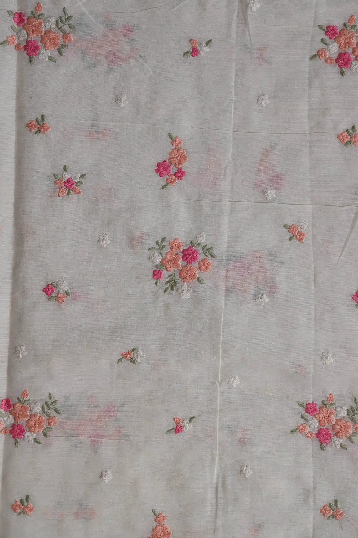 Pink And Peach Thread Beautiful Floral Embroidery On Off White Organic Cotton Fabric