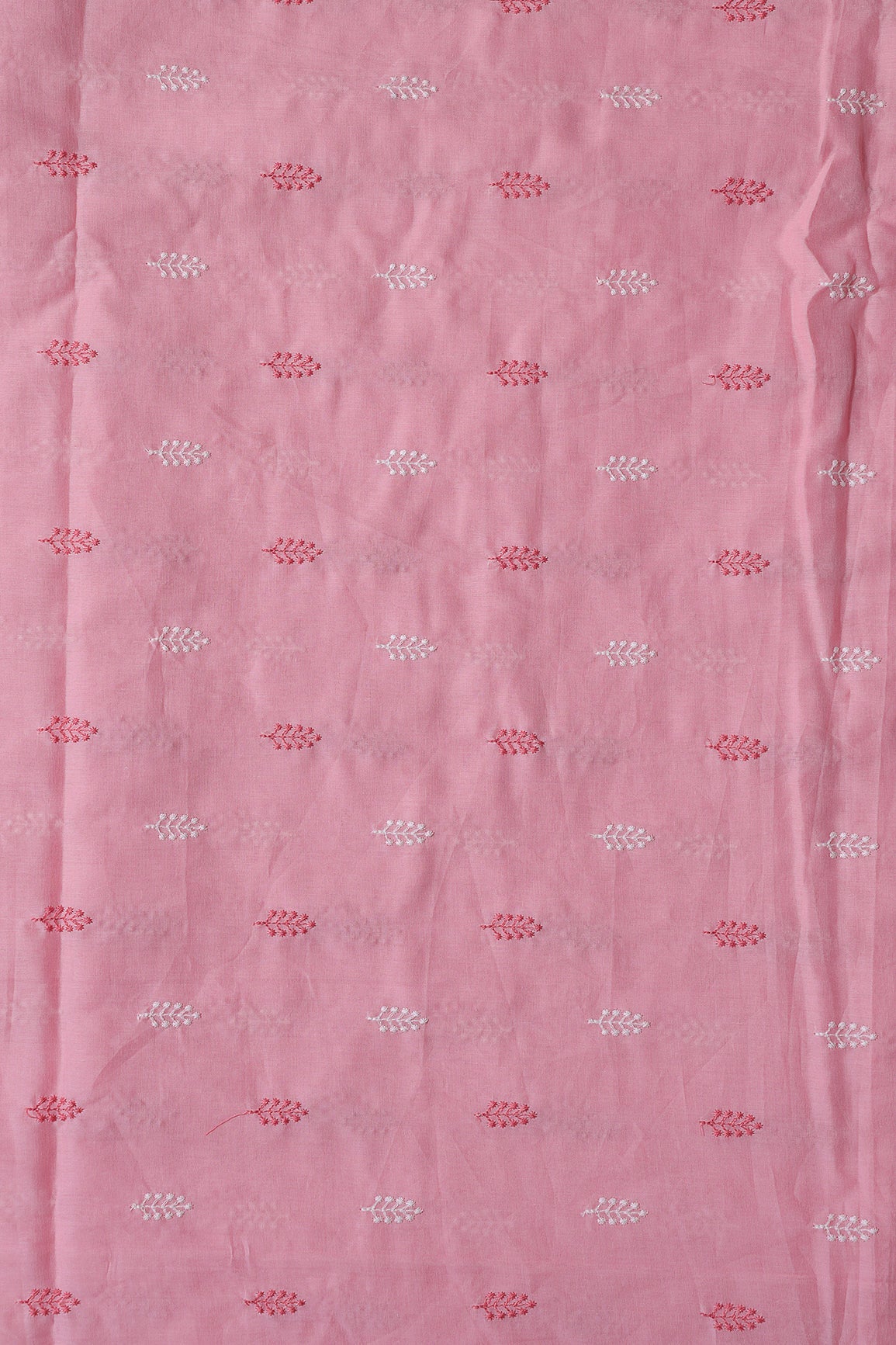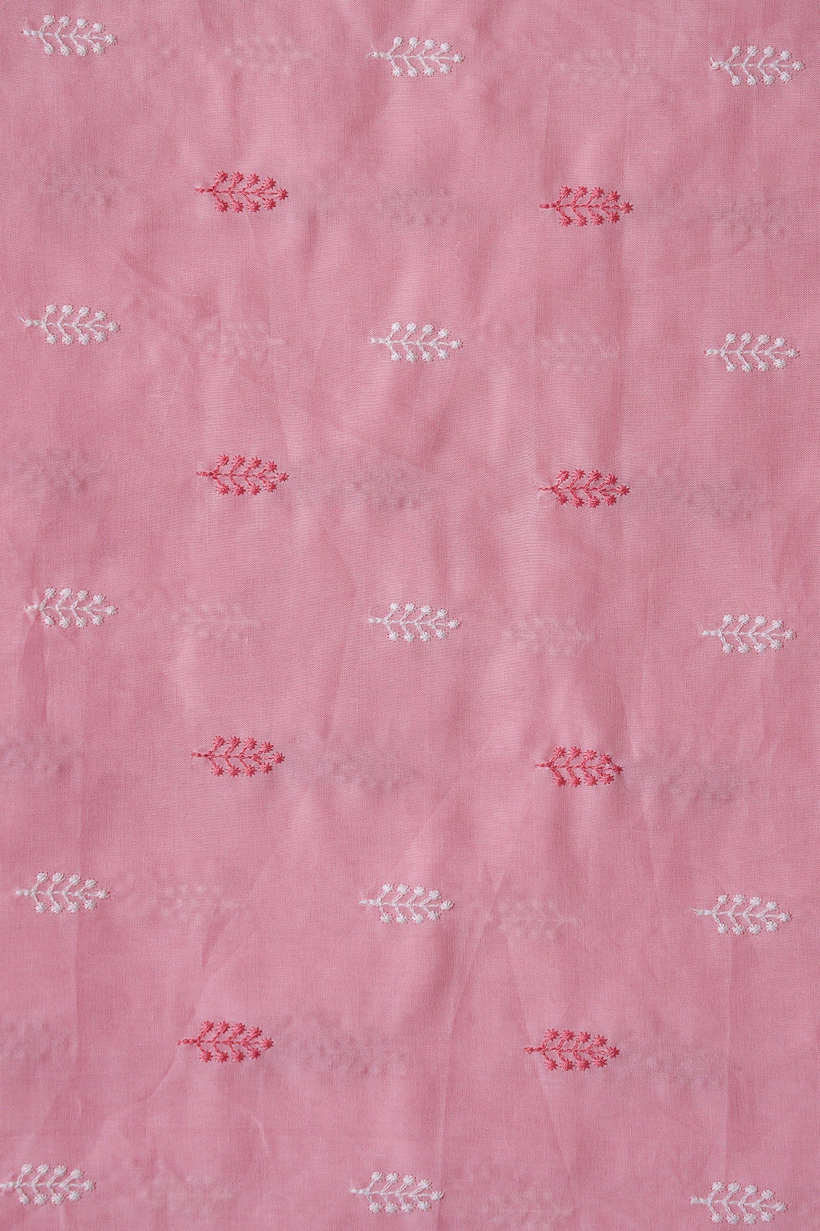 Pink And White Thread Leafy Embroidery On Pink Pure Mul Cotton Fabric