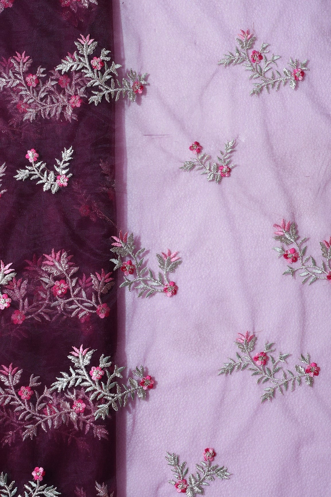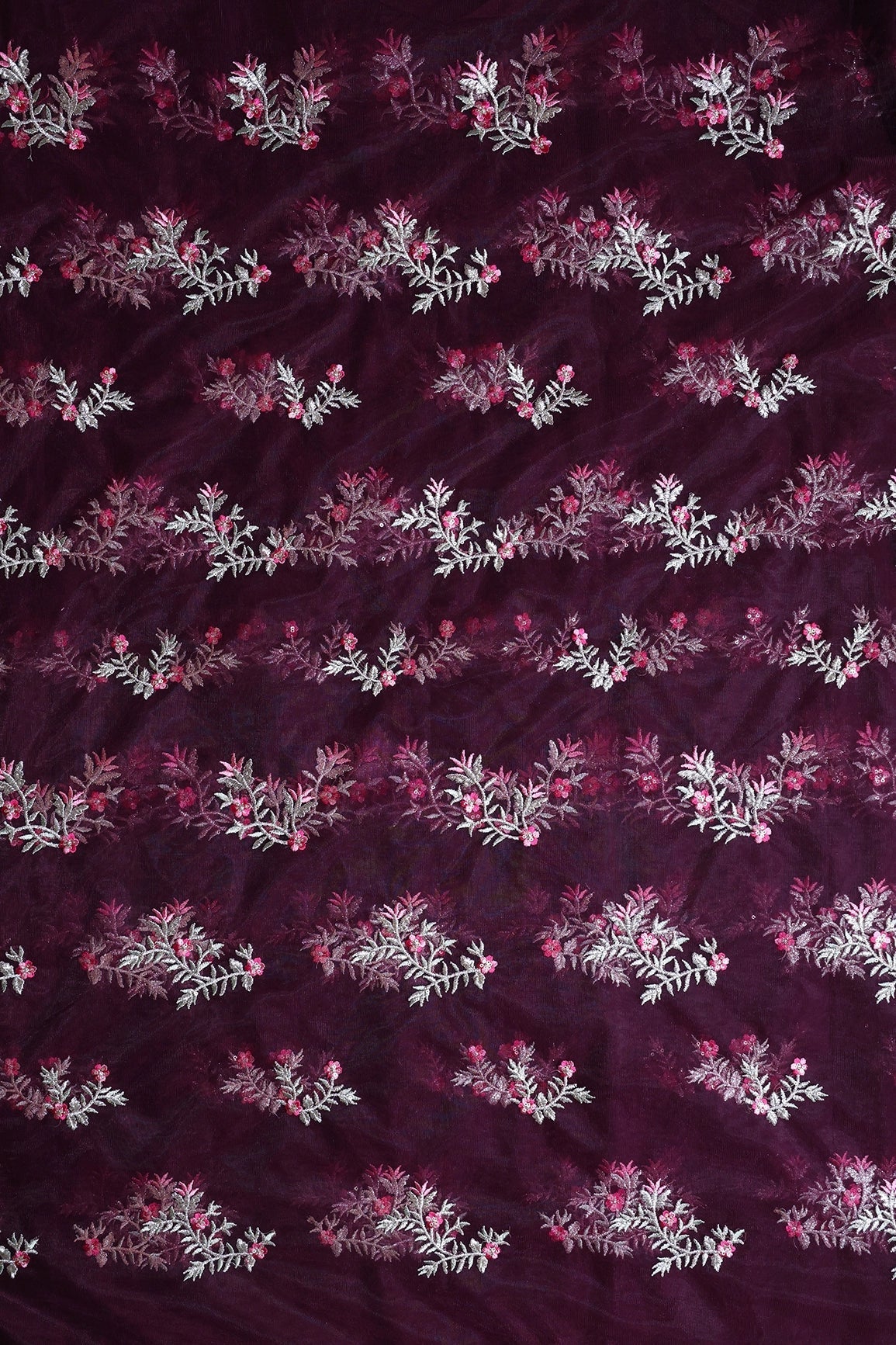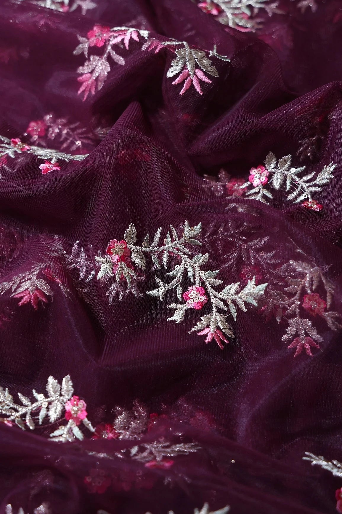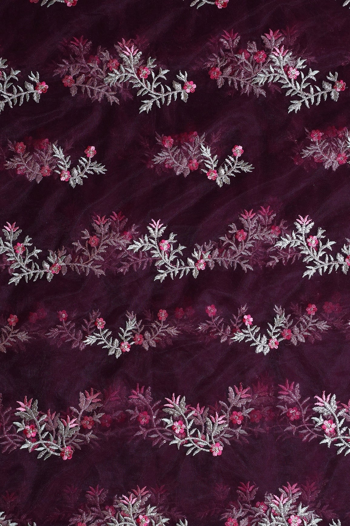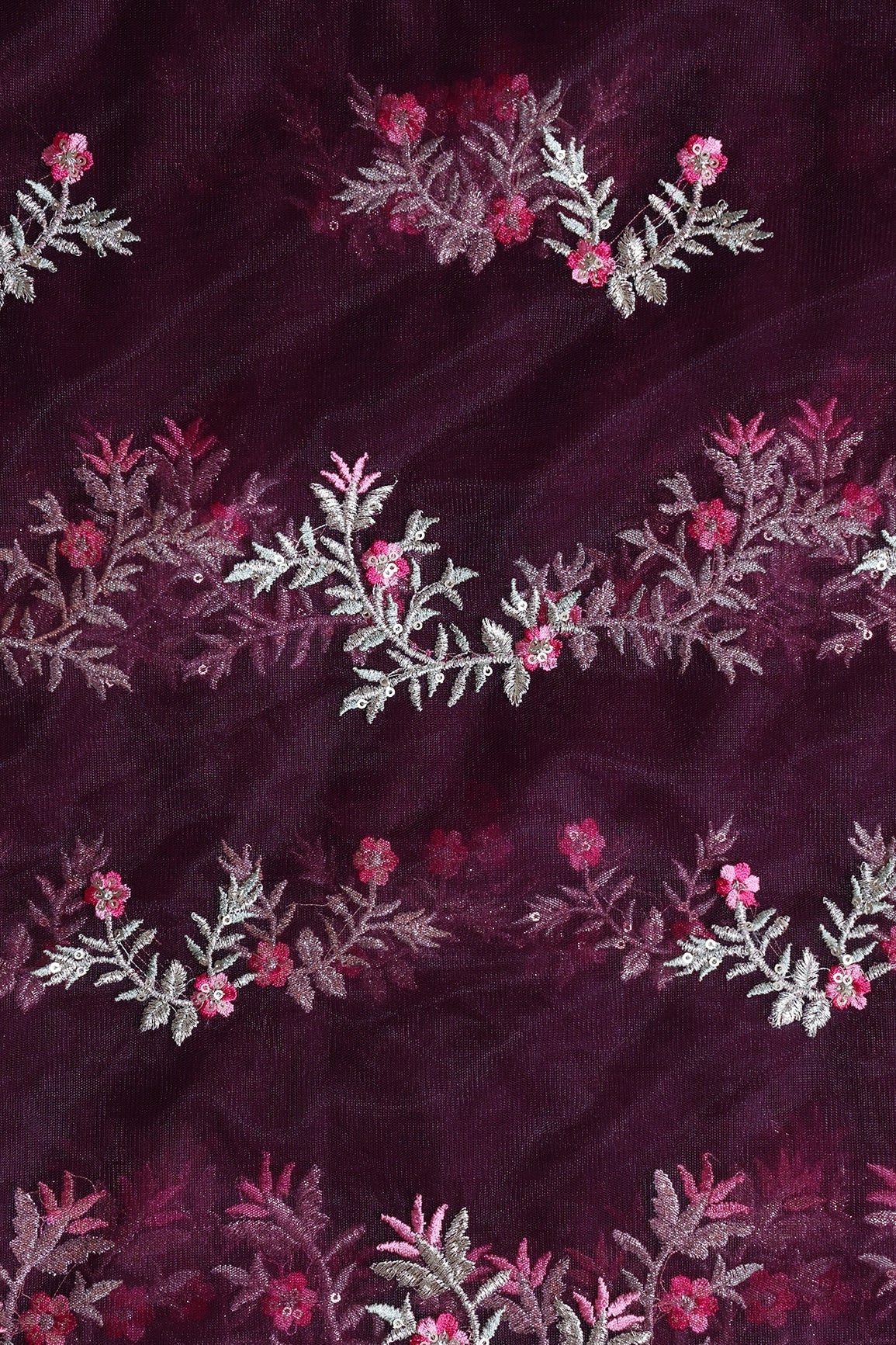 Pink Thread With Gold Zari Floral Embroidery On Wine Soft Net Fabric