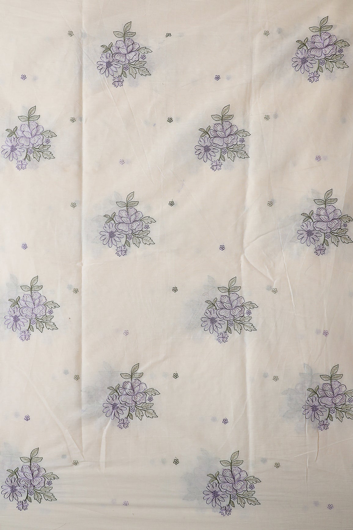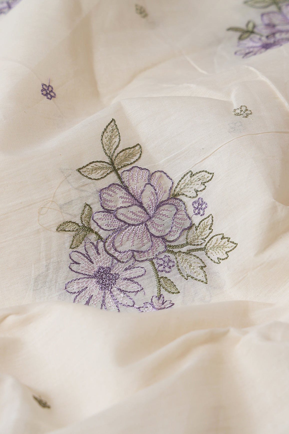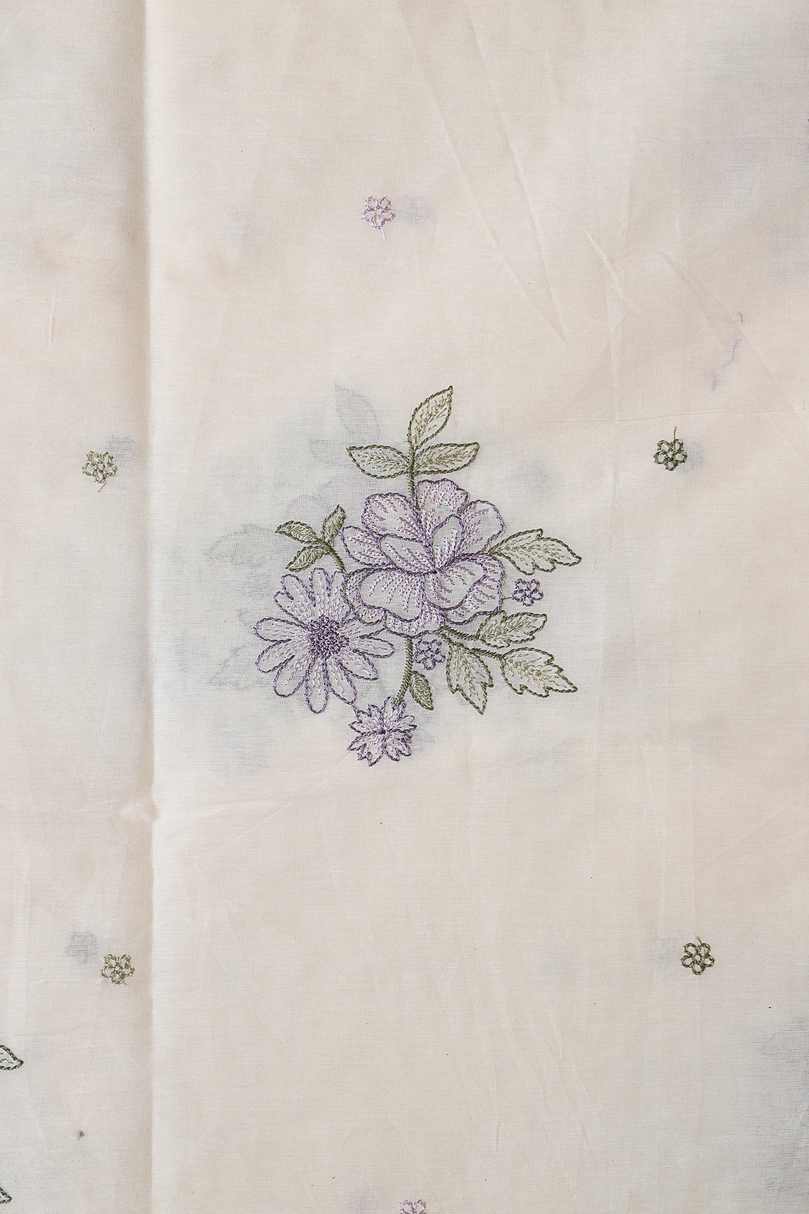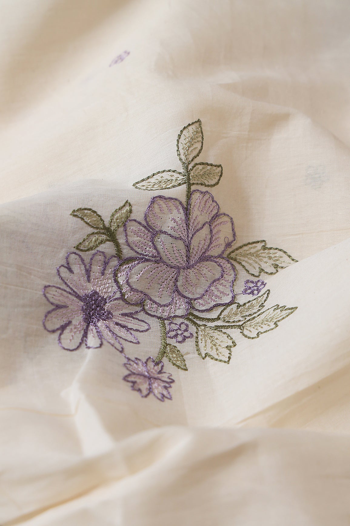 Purple And Olive Thread beautiful Floral Embroidery On Off White Organic Cotton Fabric