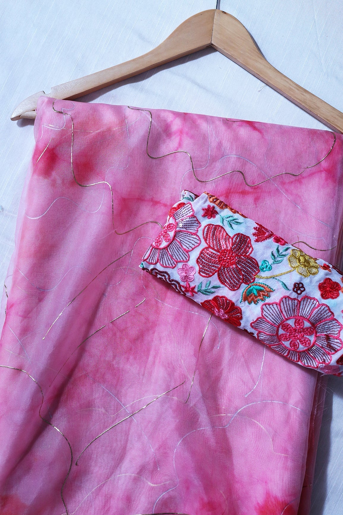 Fabric 1/ Saree : Red Tie & Dye Shibori Foil Print On Organza Fabric