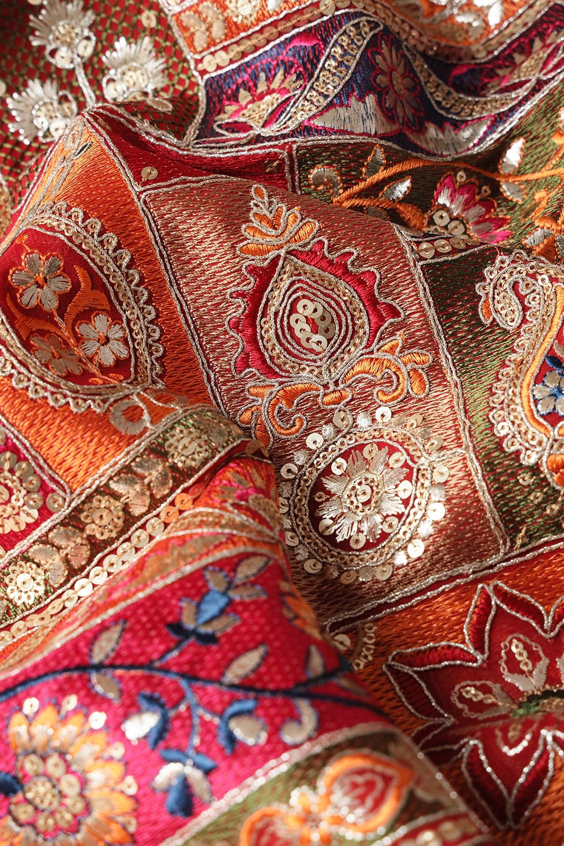Fabric 2/ Blouse : Multi Color Thread With Gold Sequins Traditional Embroidery On Red Viscose Georgette Fabric