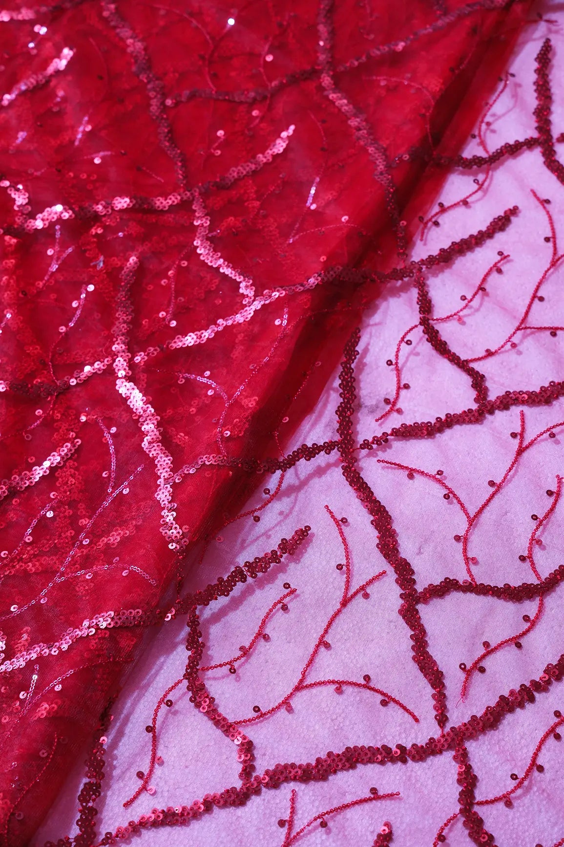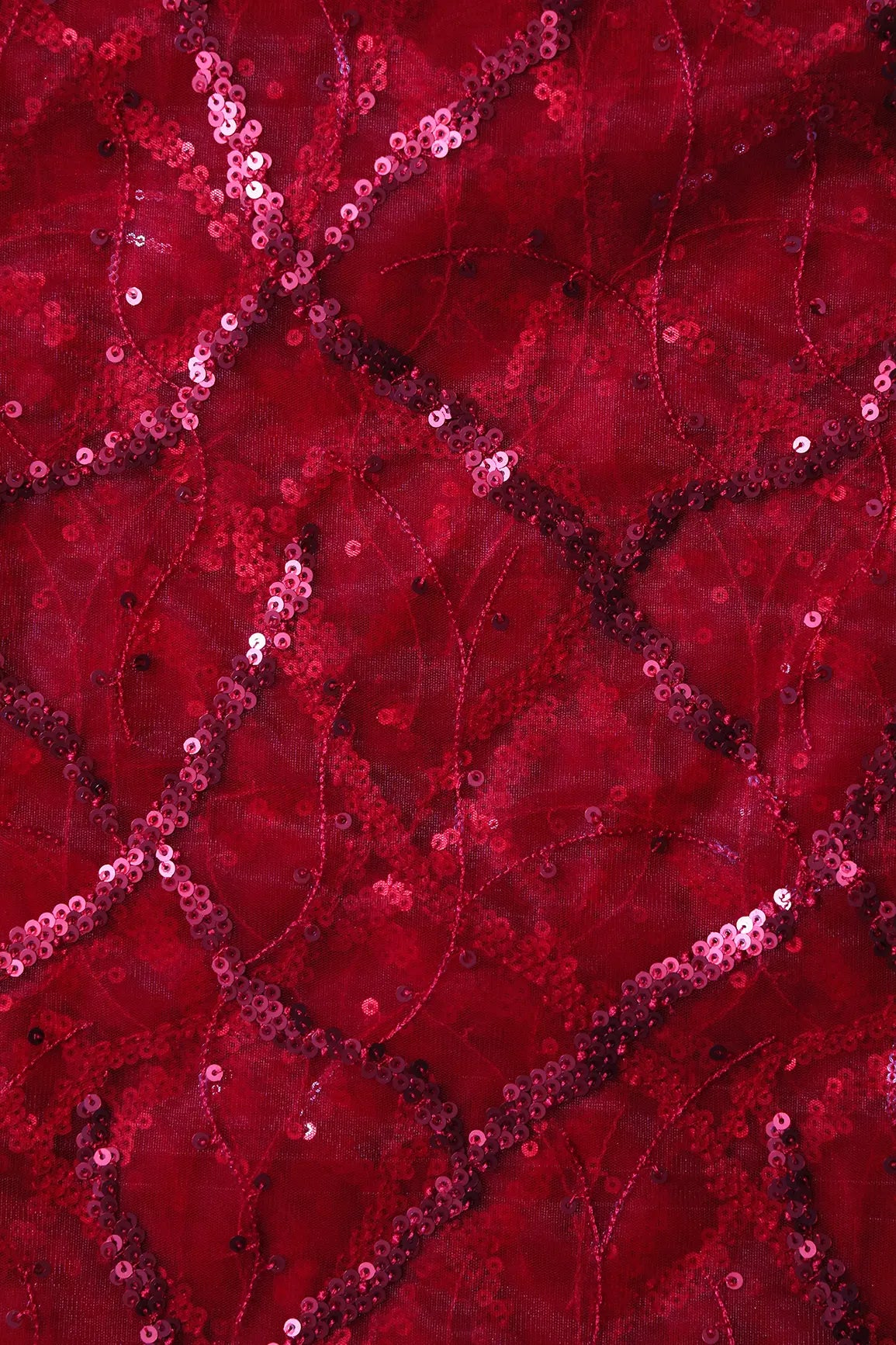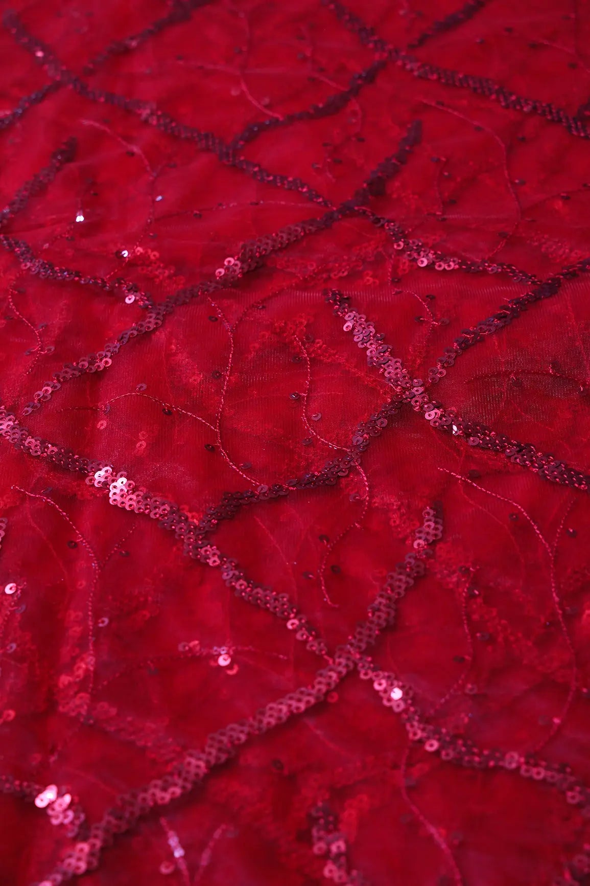 Red Sequins Geometric Embroidery On Red Soft Net Fabric