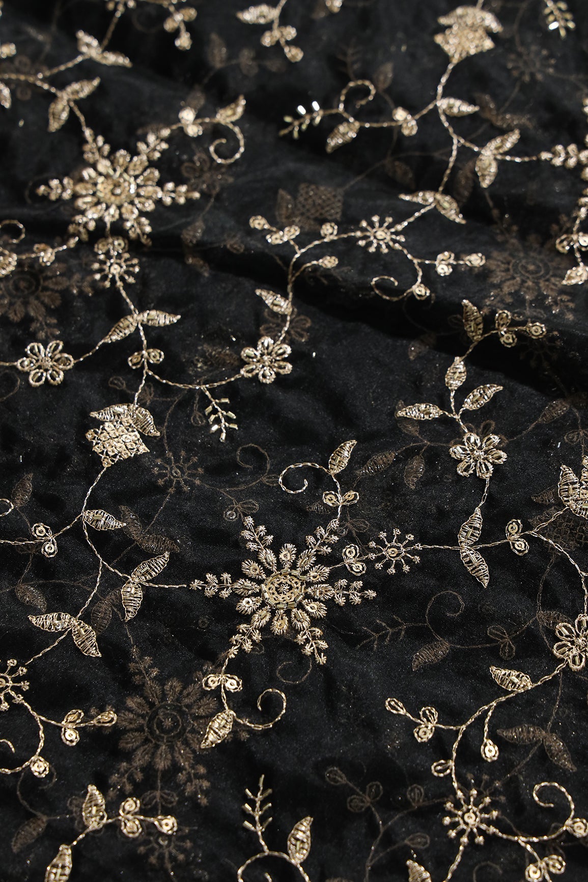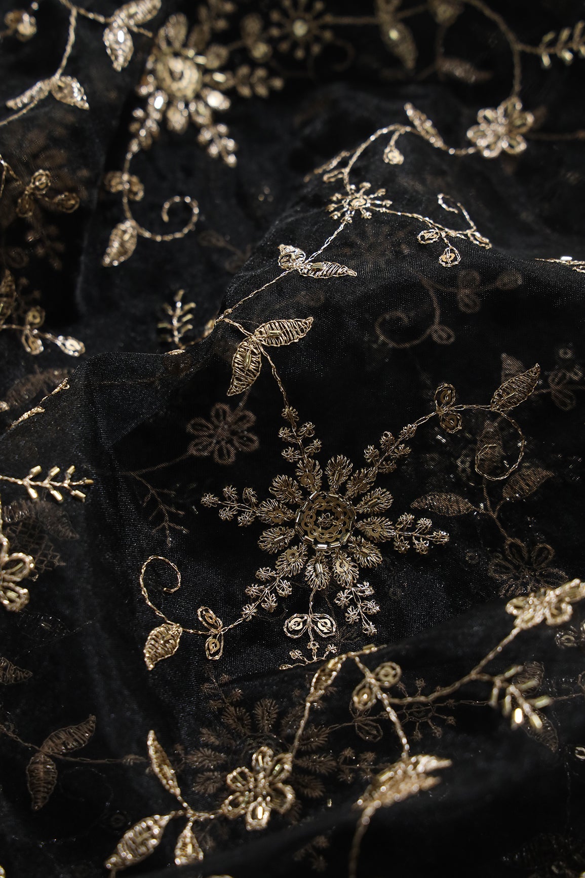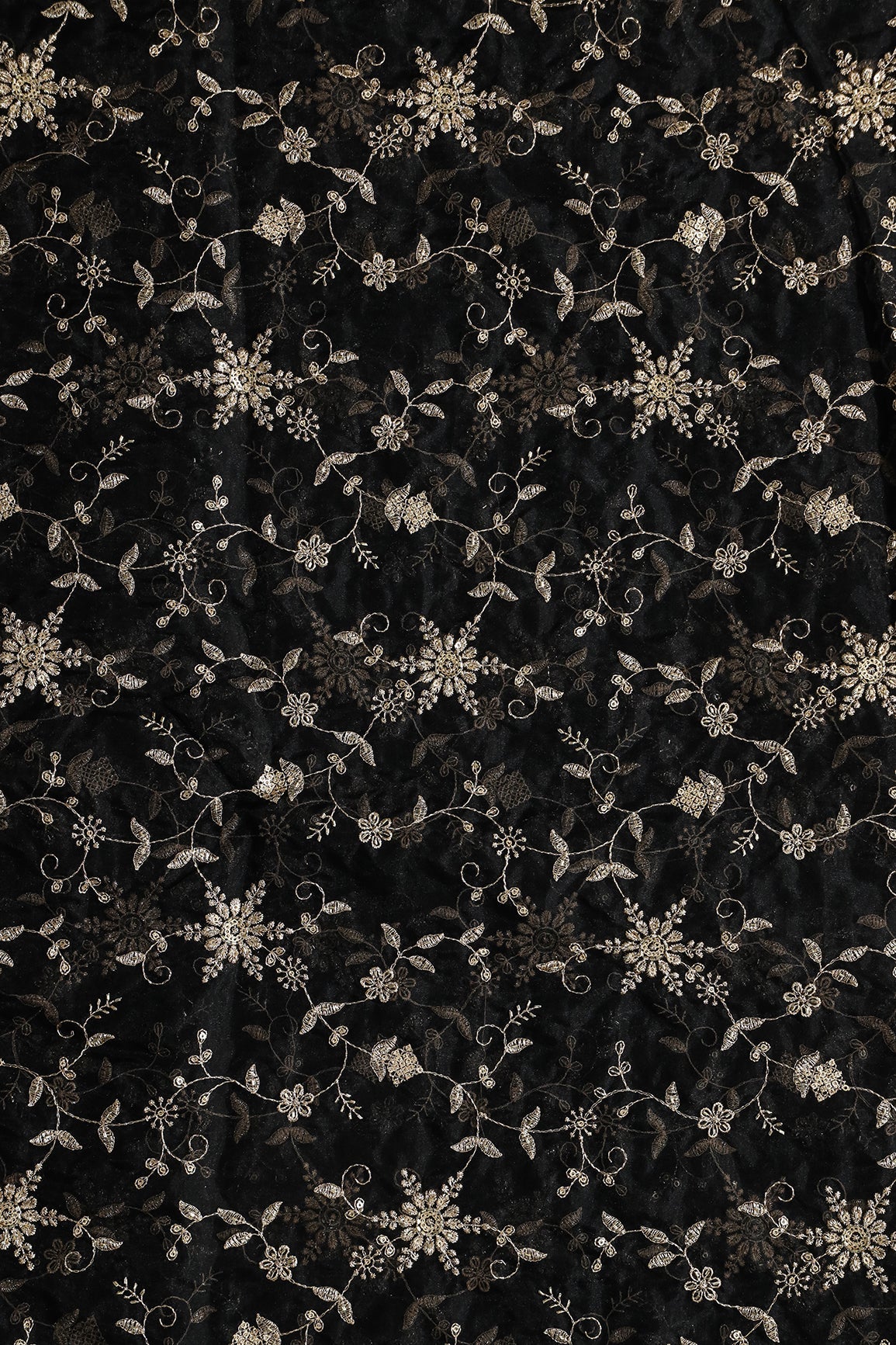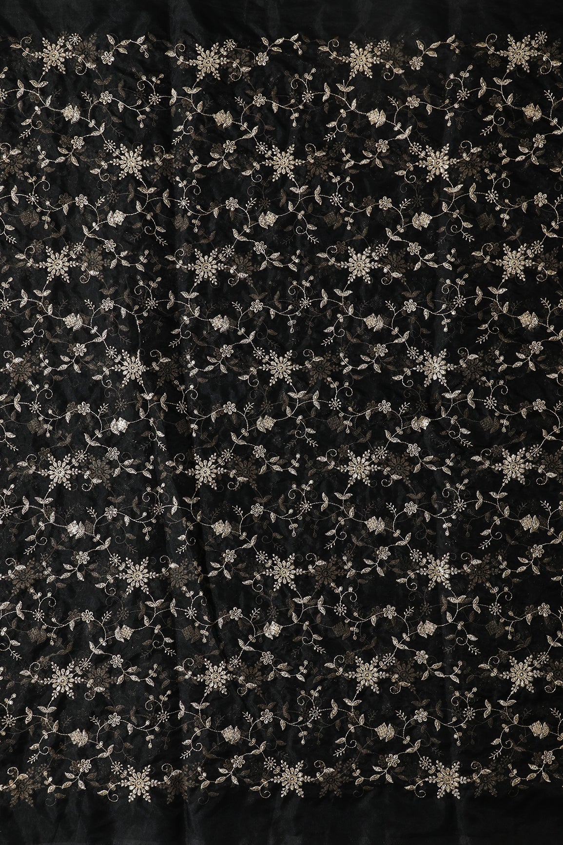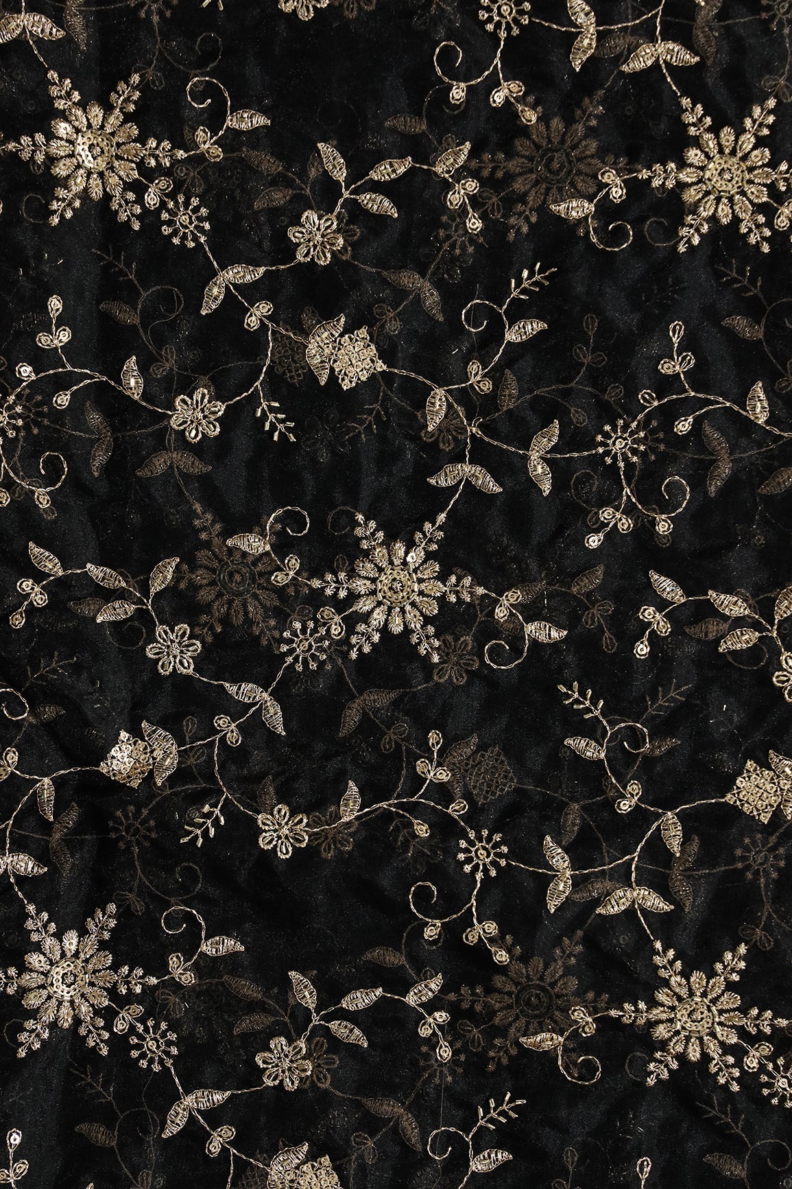 Zari Thread With Beads Floral Embroidery On Black Organza Fabric