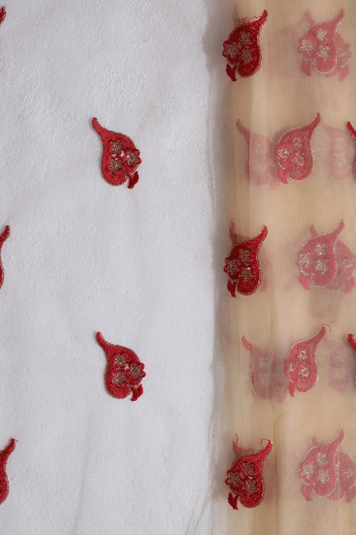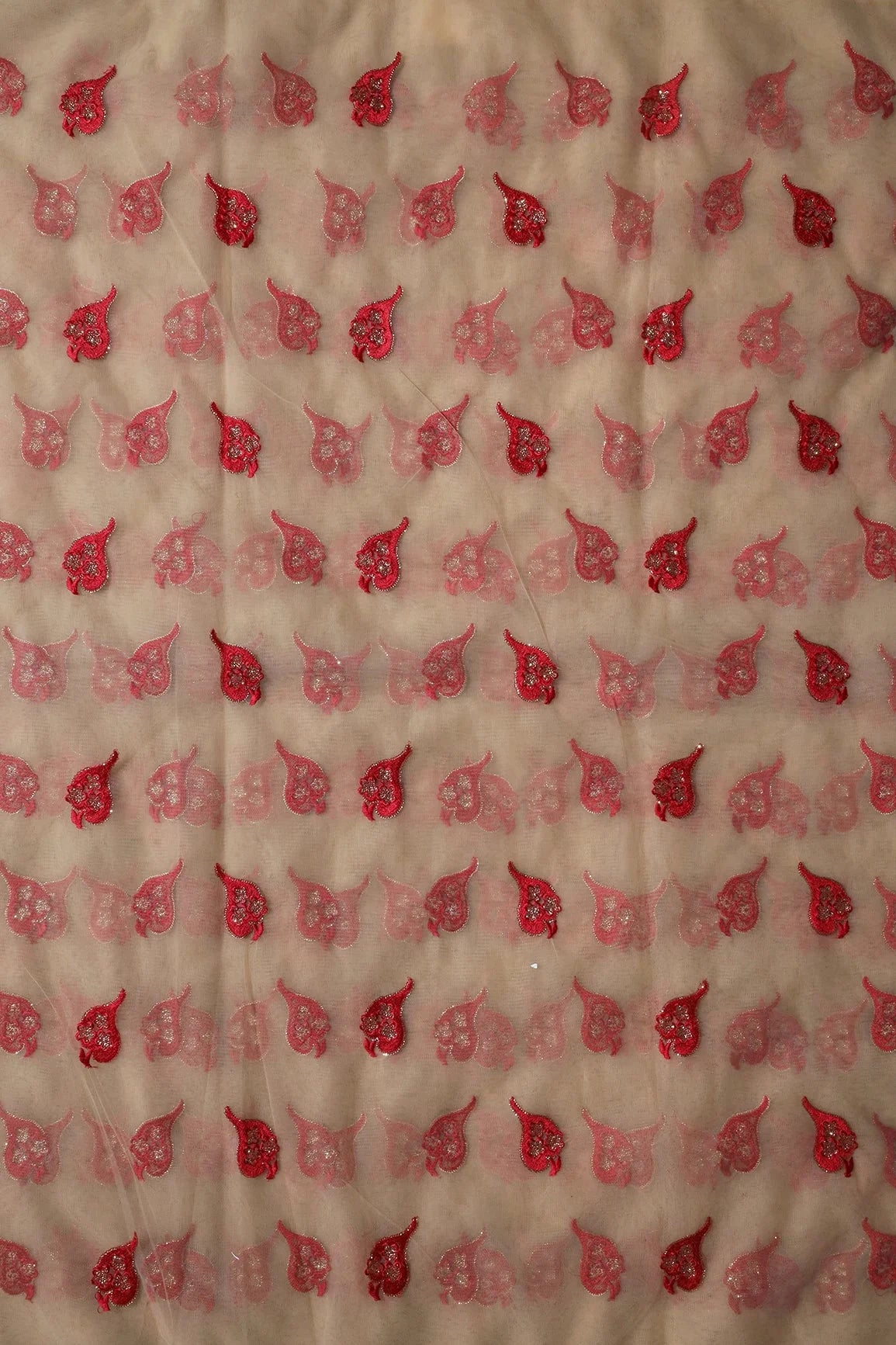 Red Thread With Gold Sequins Leafy Embroidery Work On Beige Soft Net Fabric