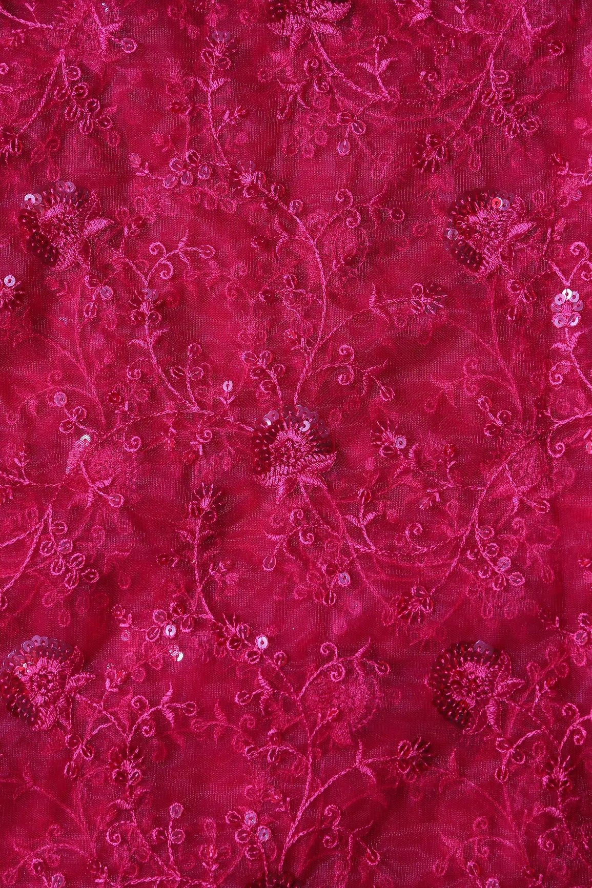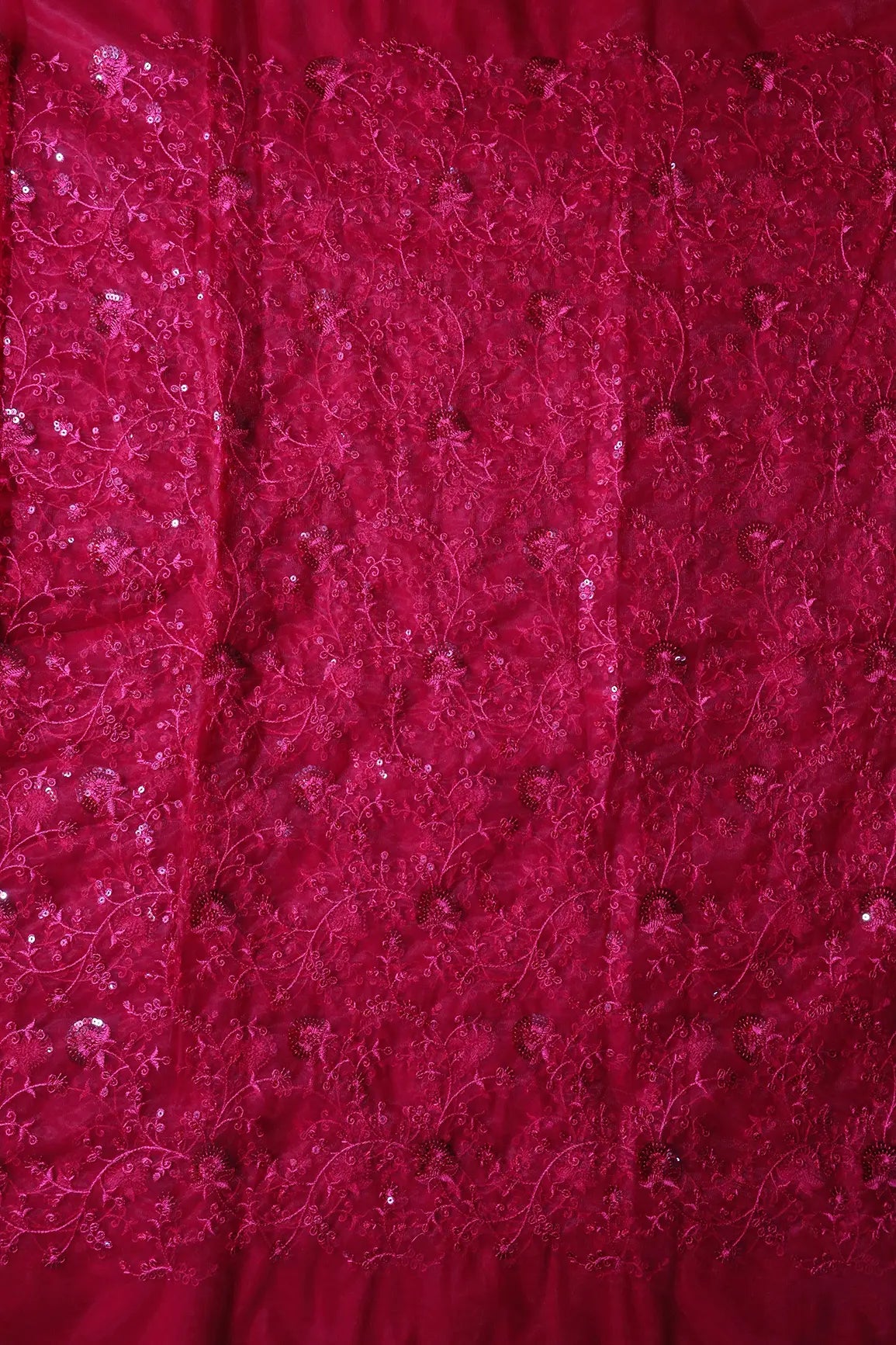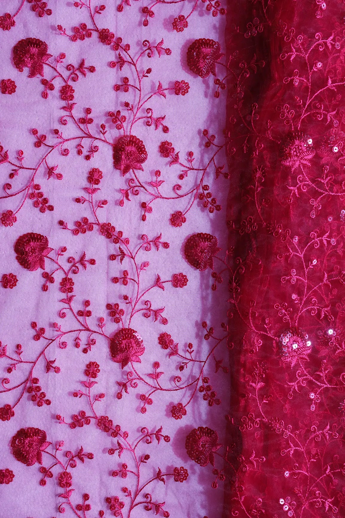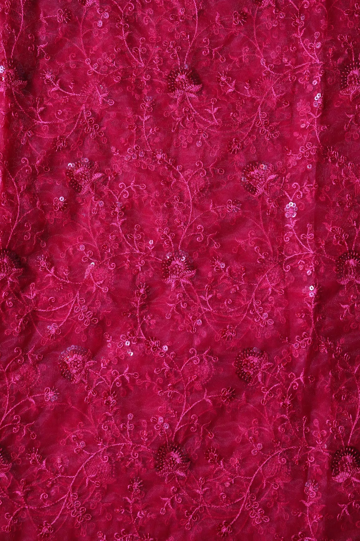 Red Thread With Red Sequins Floral Embroidery On Red Soft Net Fabric