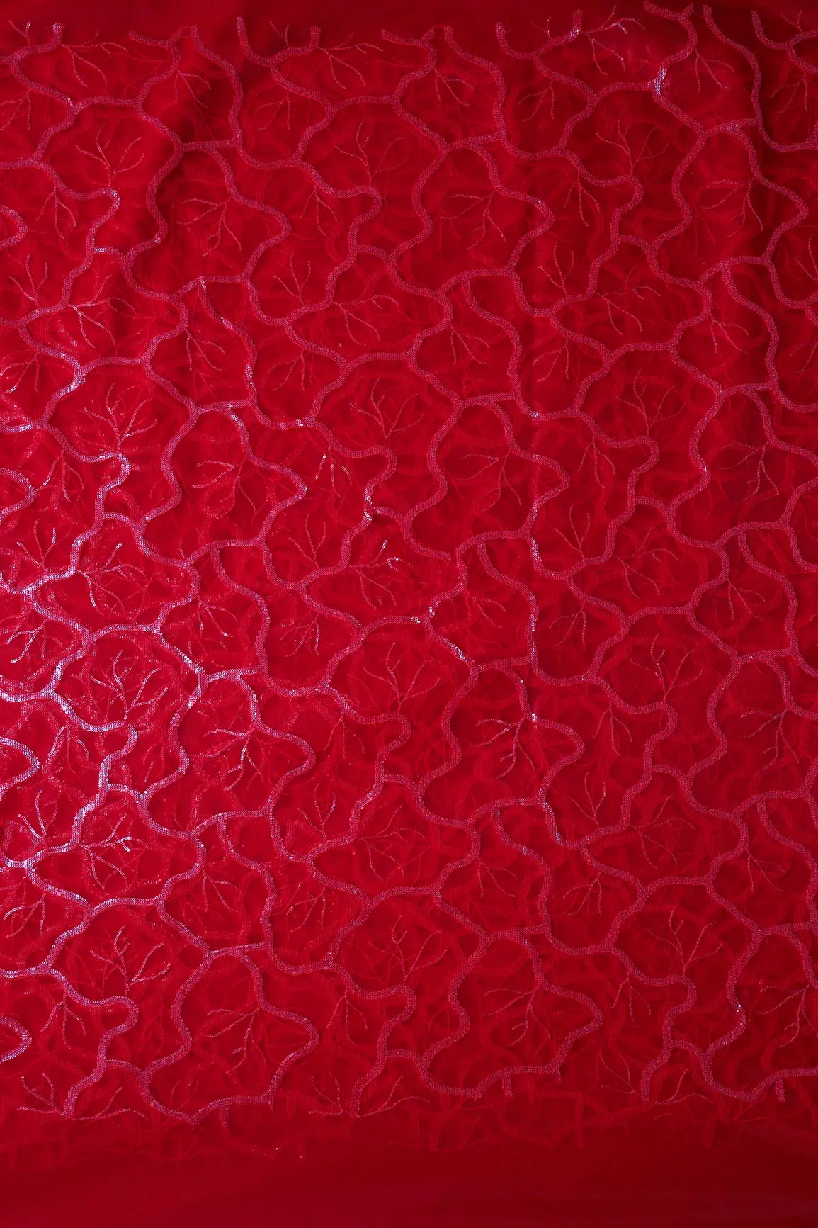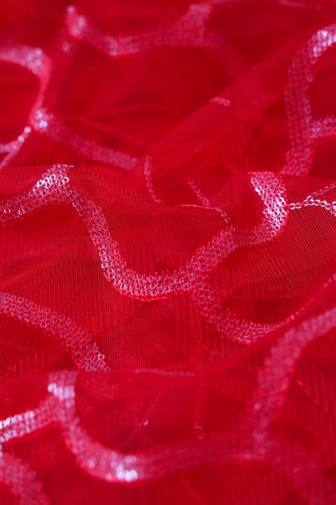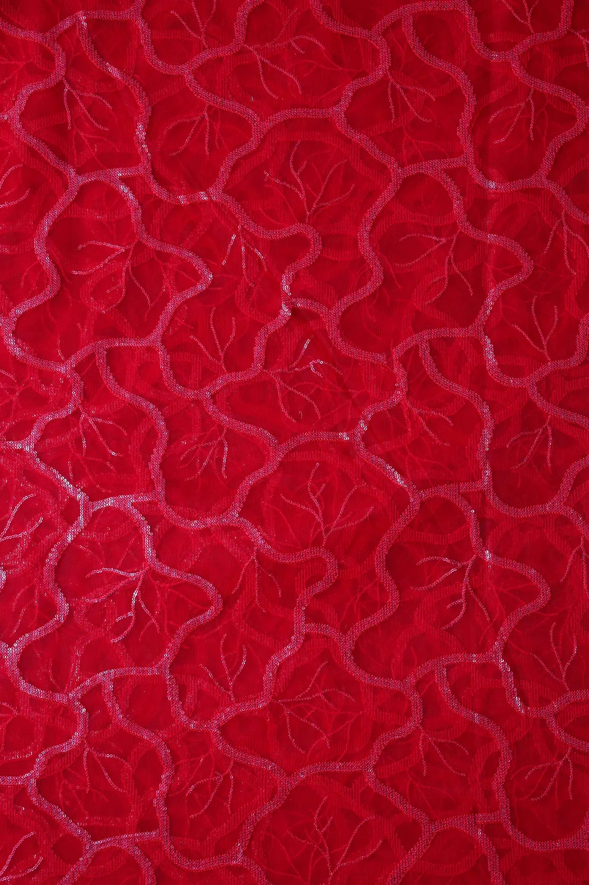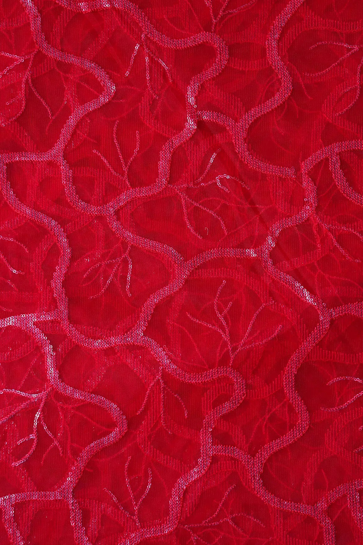 Red Thread With Water Sequins Abstract Embroidery Work On Red Soft Net Fabric