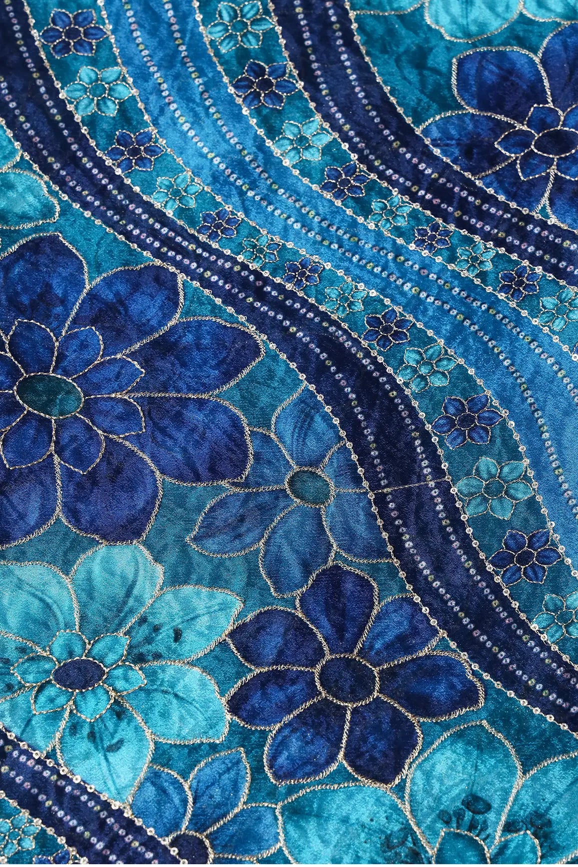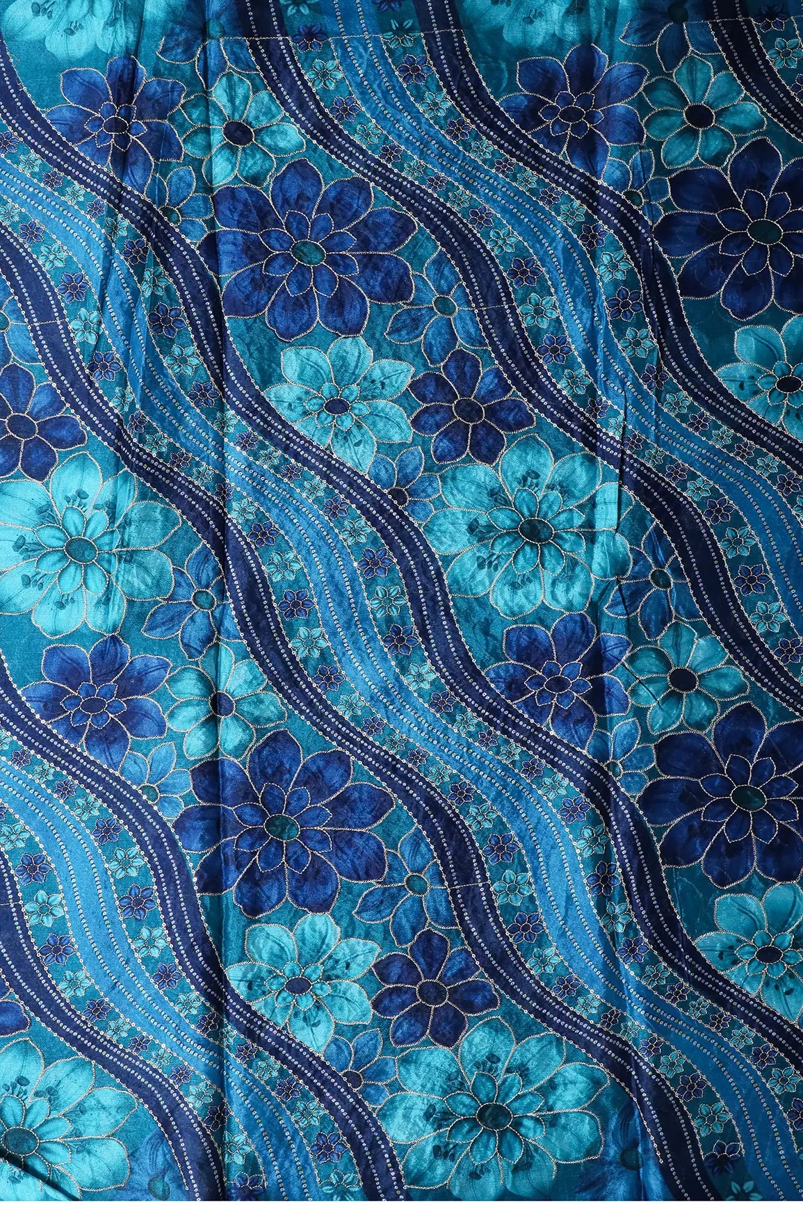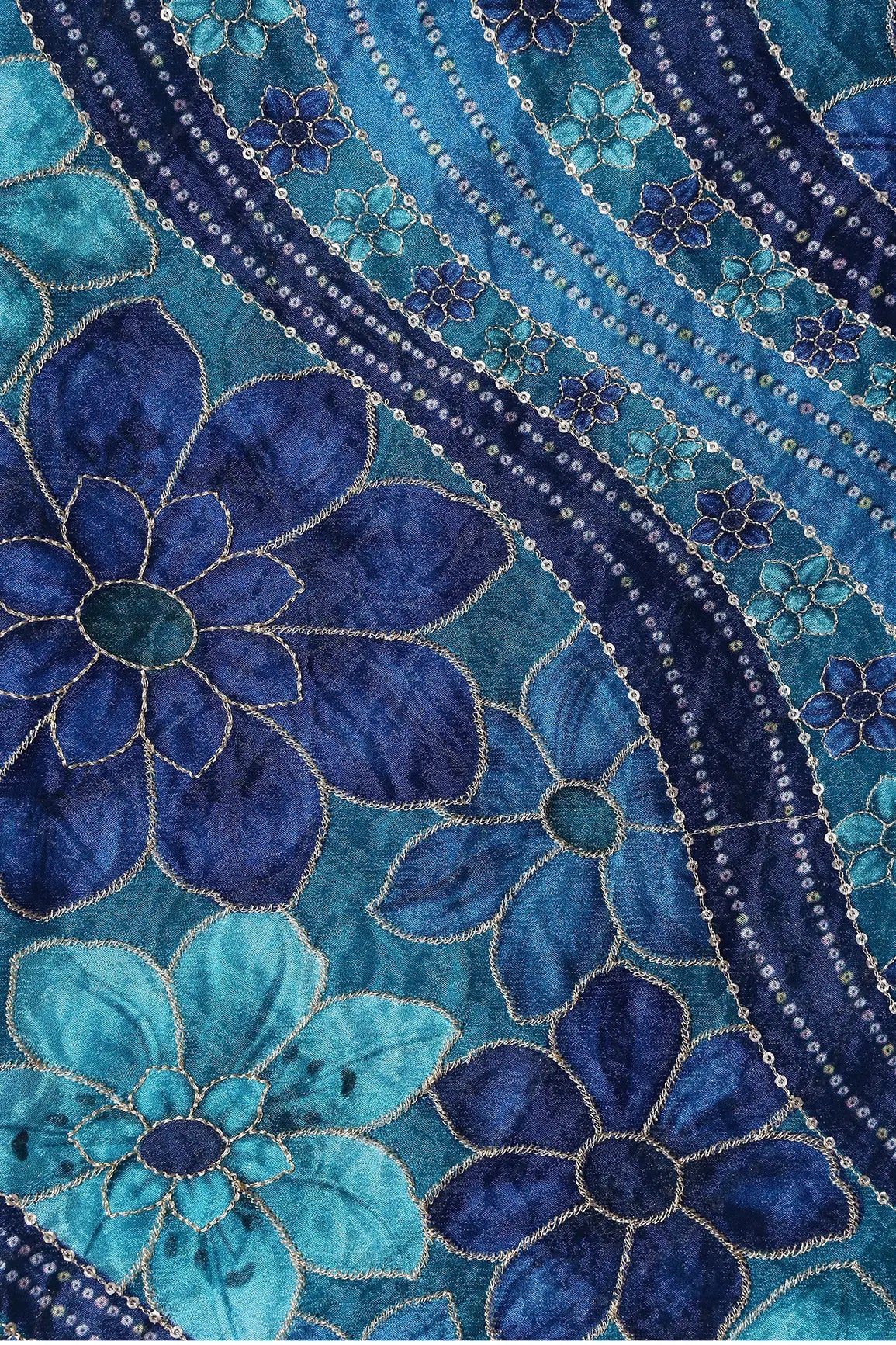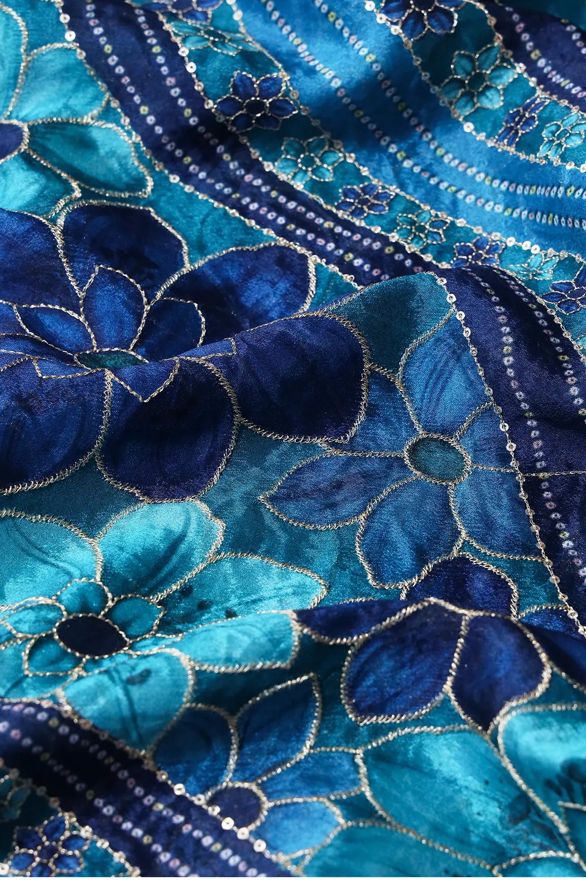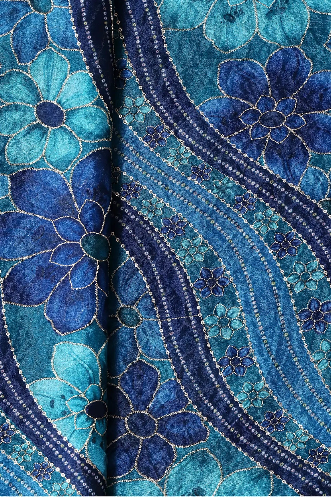 Sequins With Gold Zari Floral Embroidery On Blue And Rama Chinnon Chiffon Fabric