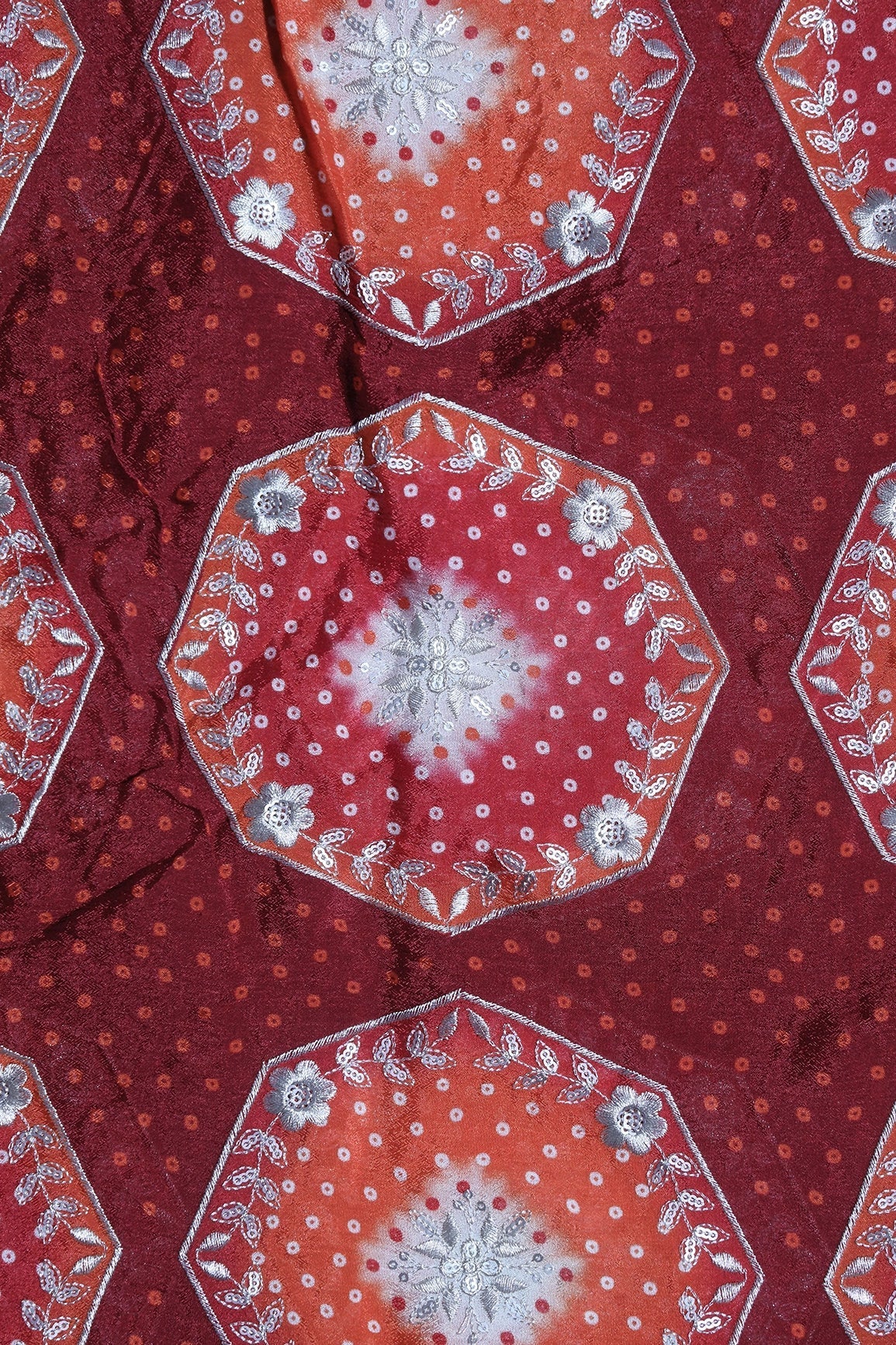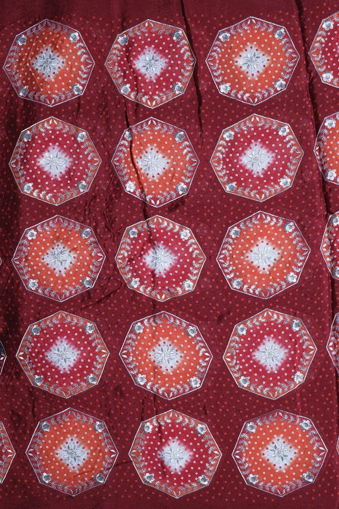 Trendy Bandhani Position Print On Sequins Embroidery Maroon Viscose Chinnon Chiffon Fabric